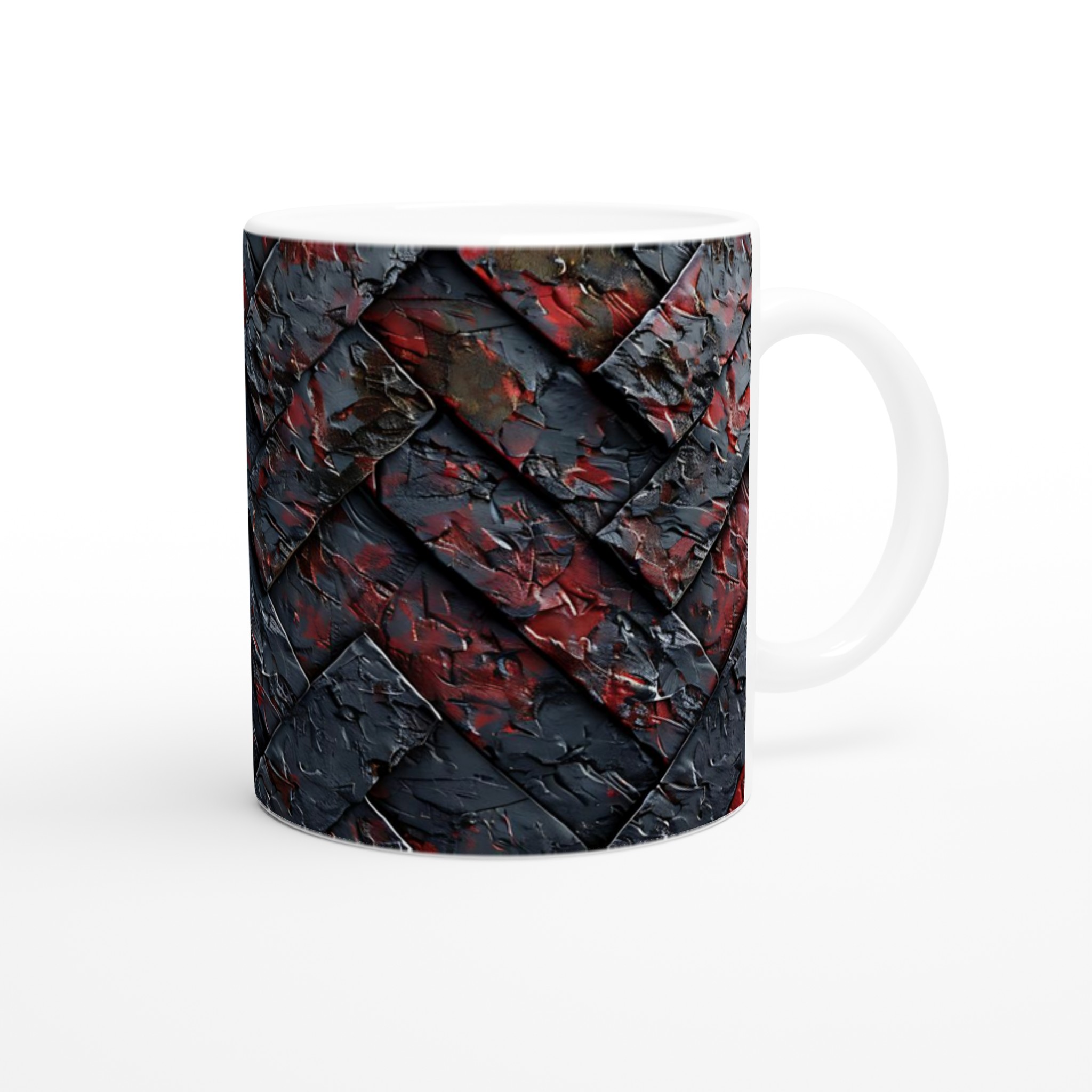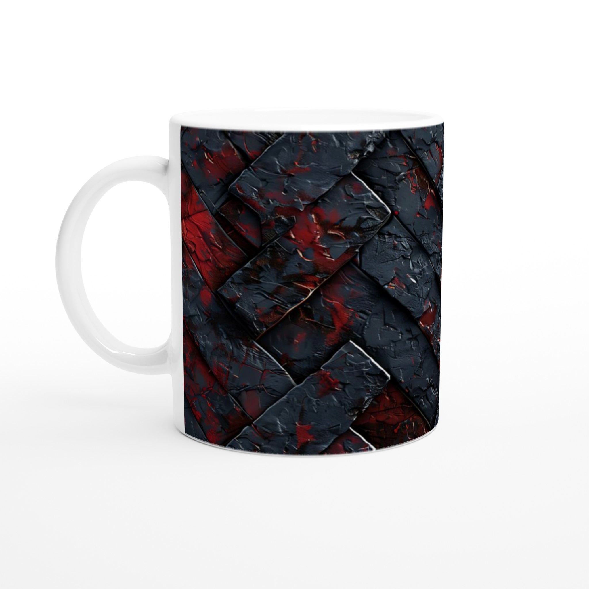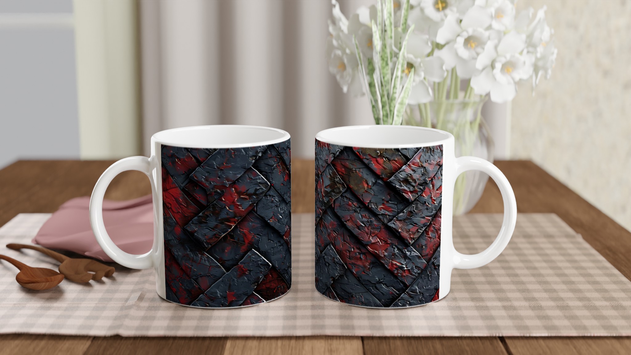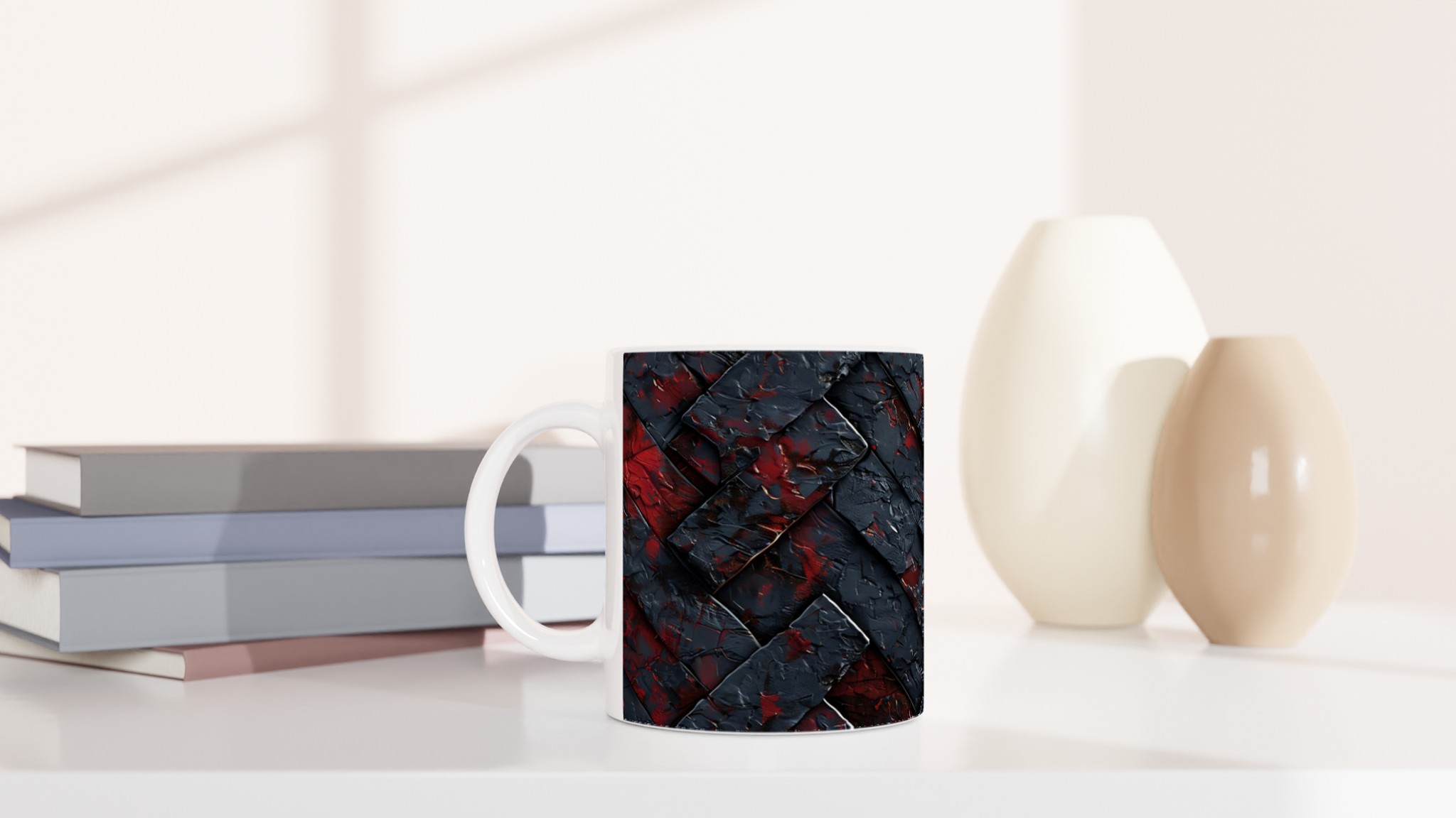 Denna stilrena och vackra keramikmugg är perfekt för alla dagens stunder – morgonkaffet, en värmande kopp te eller en härlig varm choklad. Designen, som balanserar mörka, mystiska toner med stänk av levande rött, ger en känsla av modern konst. Den blanka vita ytan gör att trycken framträder klart och färgstarkt, vilket gör muggen till en riktig favorit i vardagen. Tack vare den höga kvaliteten behåller trycket sin lyster även efter många omgångar i både mikrovågsugn och diskmaskin.