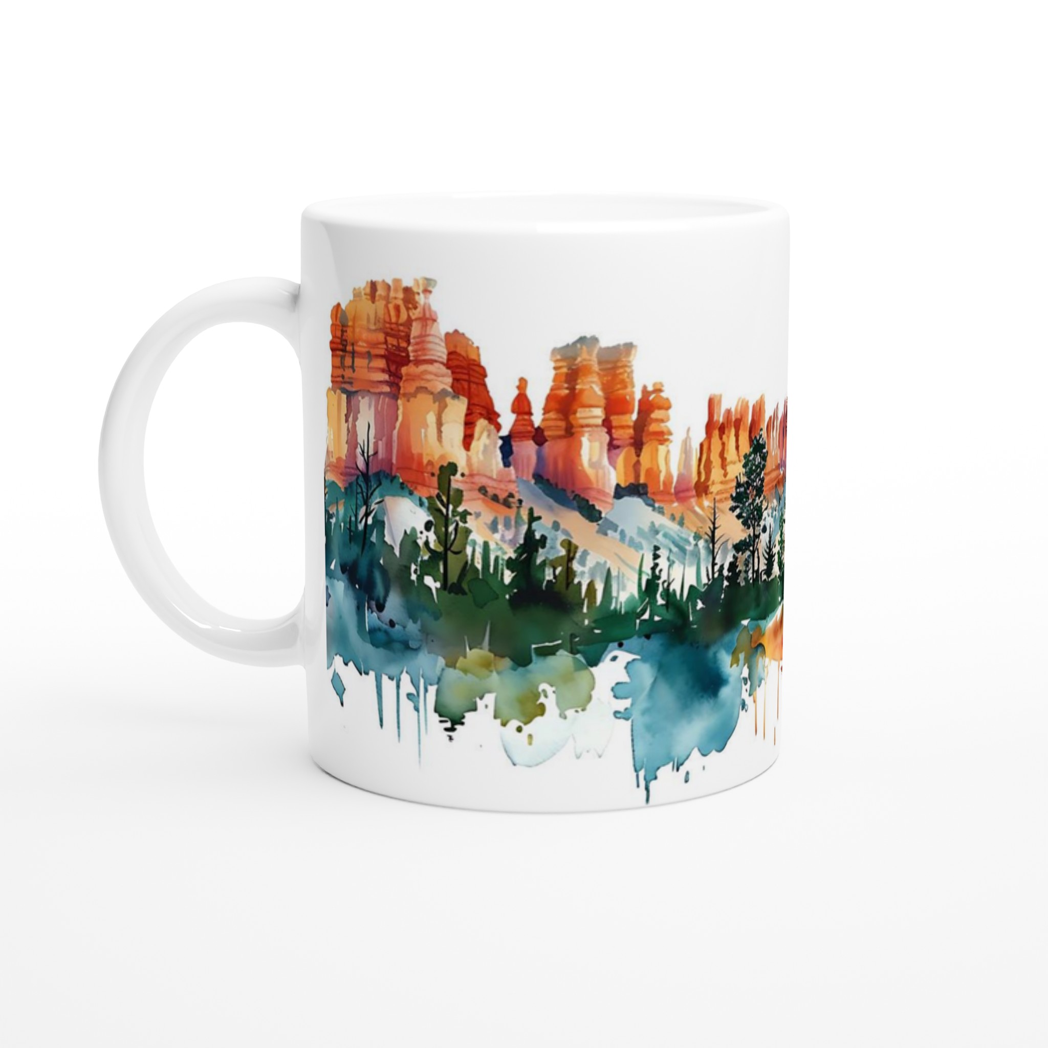 Lyft varje kaffestund med vår premium keramikmugg – stilren, hållbar och skapad för att låta ditt motiv glänsa. Denna fantastiska mugg har ett abstrakt akvarelltryck som fångar den dramatiska skönheten hos Bryce Canyons röda klippformationer och frodiga grönska, med färgstarka stänk som ger en känsla av rörelse och liv. Det konstnärliga landskapet, präglat av varma jordtoner och svala blå-gröna nyanser, blir en perfekt konversationsstartare för kaffeälskare och konstentusiaster.
