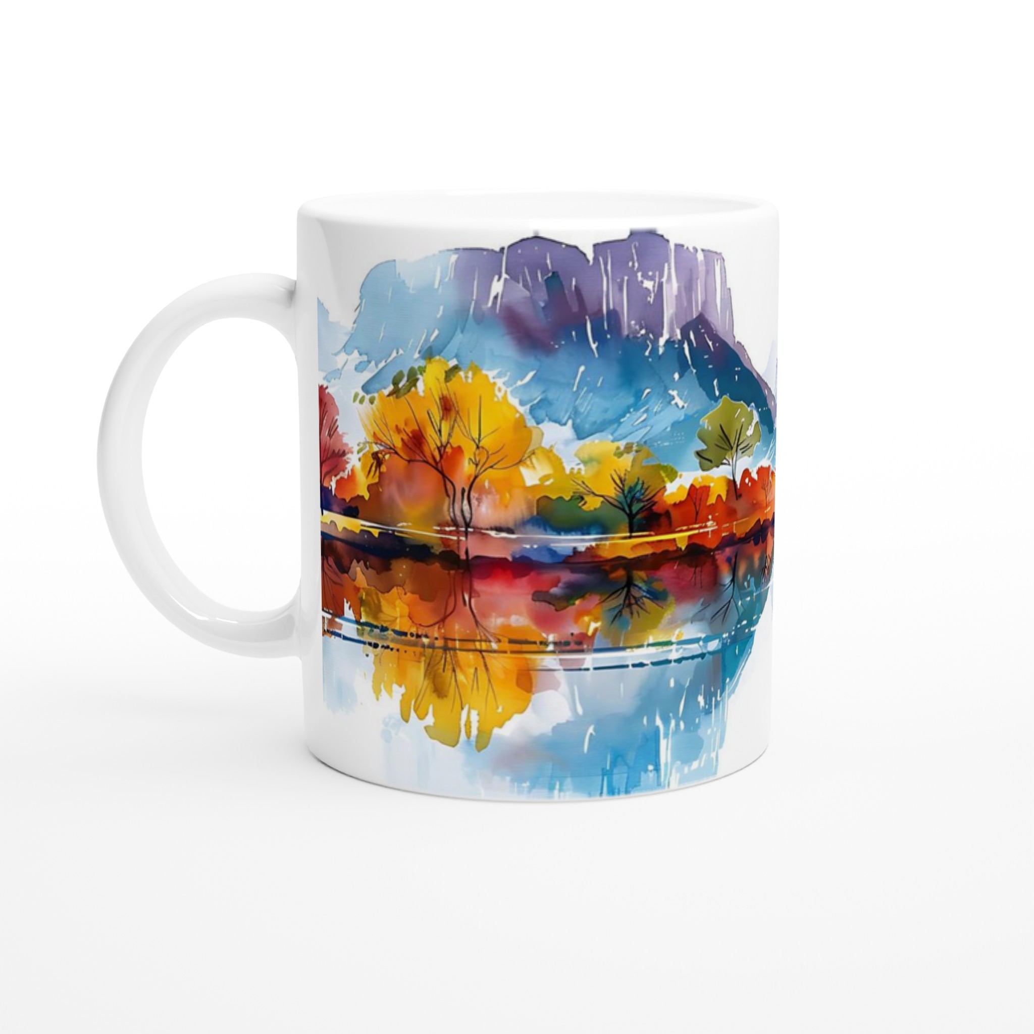 Lyft varje kaffestund med vår premium keramikmugg – stilren, hållbar och skapad för att låta ditt motiv glänsa. Denna mugg är en hyllning till naturens skönhet, med ett abstrakt akvarellmotiv som fångar en rofylld scen av berg, träd och en spegelblank sjö i varma höstfärger och svala blå toner. Perfekt för konstälskare och alla som uppskattar en touch av lugn i vardagen, denna mugg förvandlar varje sipp till en stund av inspiration.