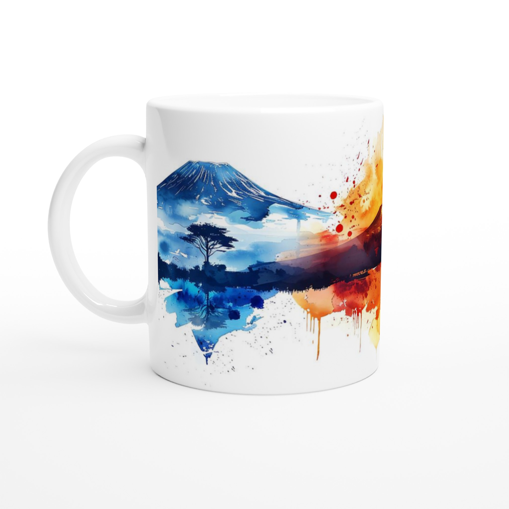 Denna unika mugg fångar den dramatiska skönheten hos abstrakta akvarellberg, där isblåa toppar möter eldiga orangea dalar och ljuva lila solnedgångar. Varje klunk blir en resa genom ett konstnärligt landskap, en perfekt blandning av lugn och energi. Den blanka vita ytan ger ett skarpt och levande tryck som verkligen sticker ut, oavsett om det är en personlig design, ett roligt citat eller en present till någon du tycker om.
