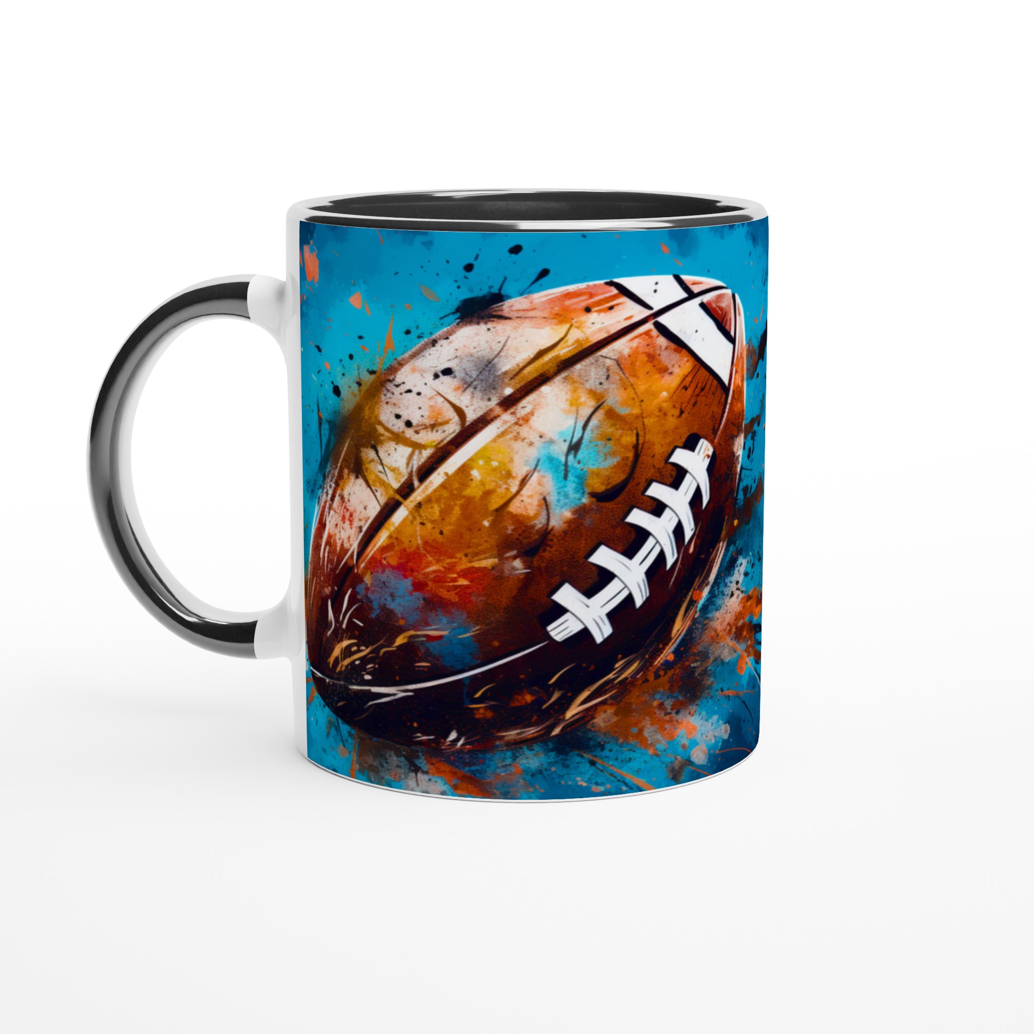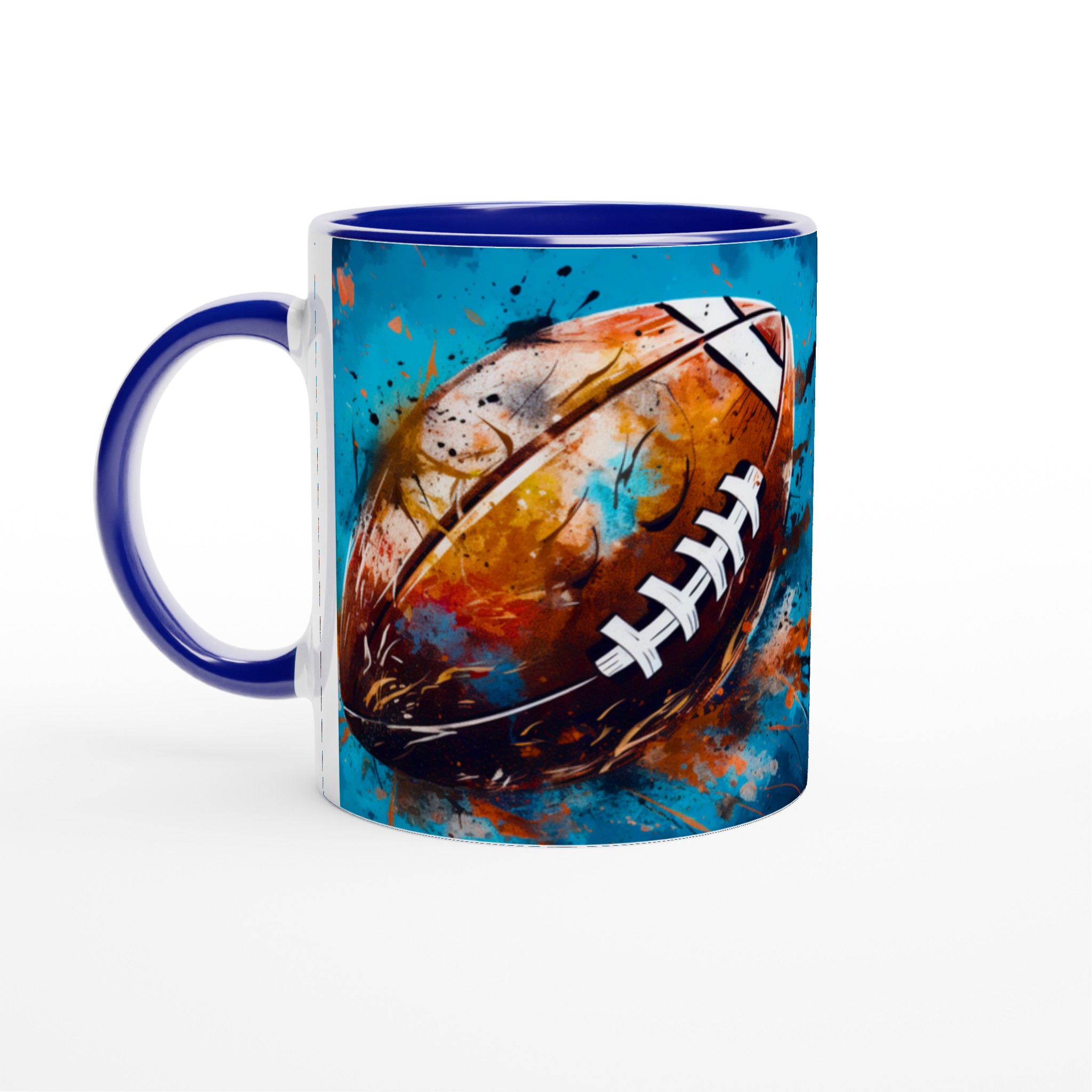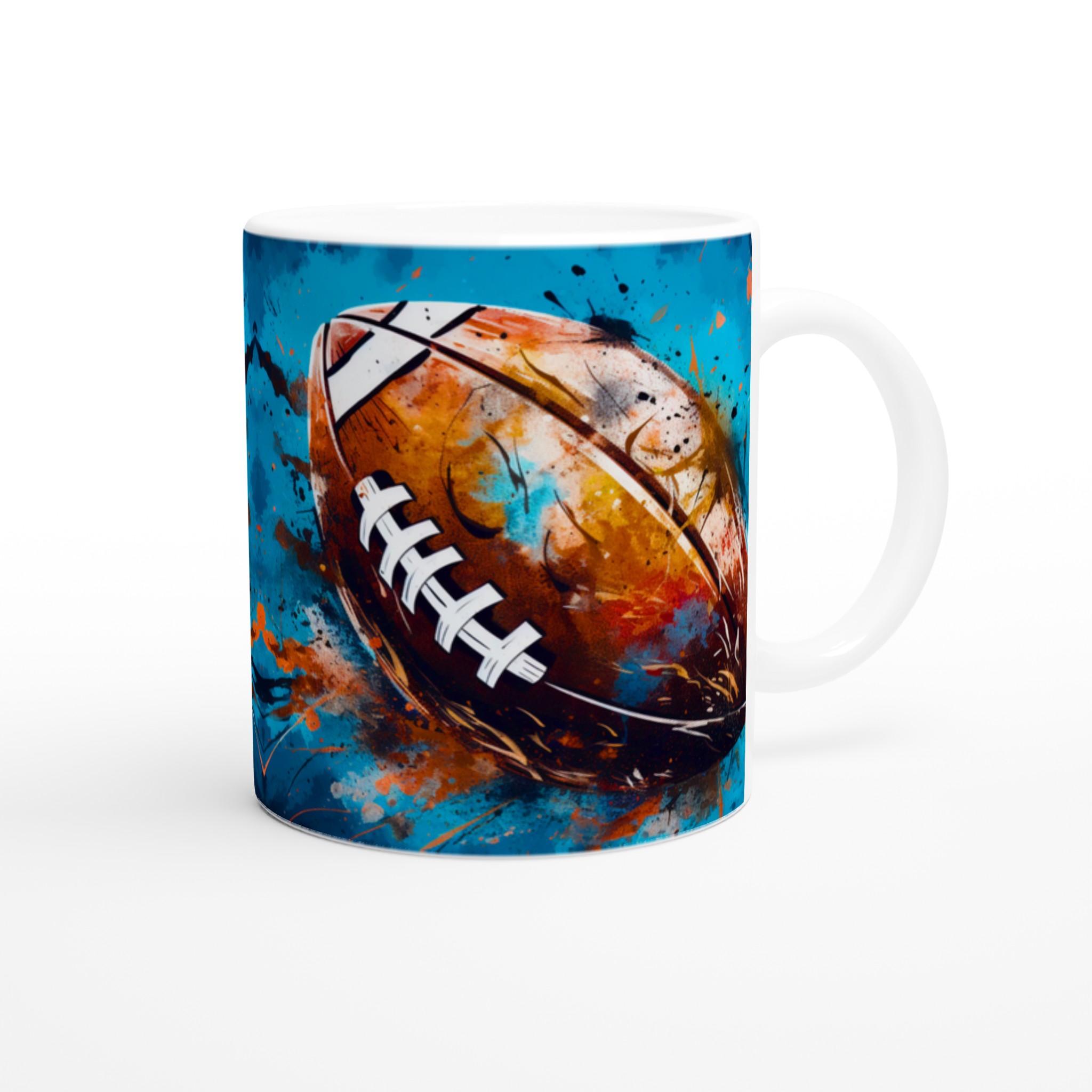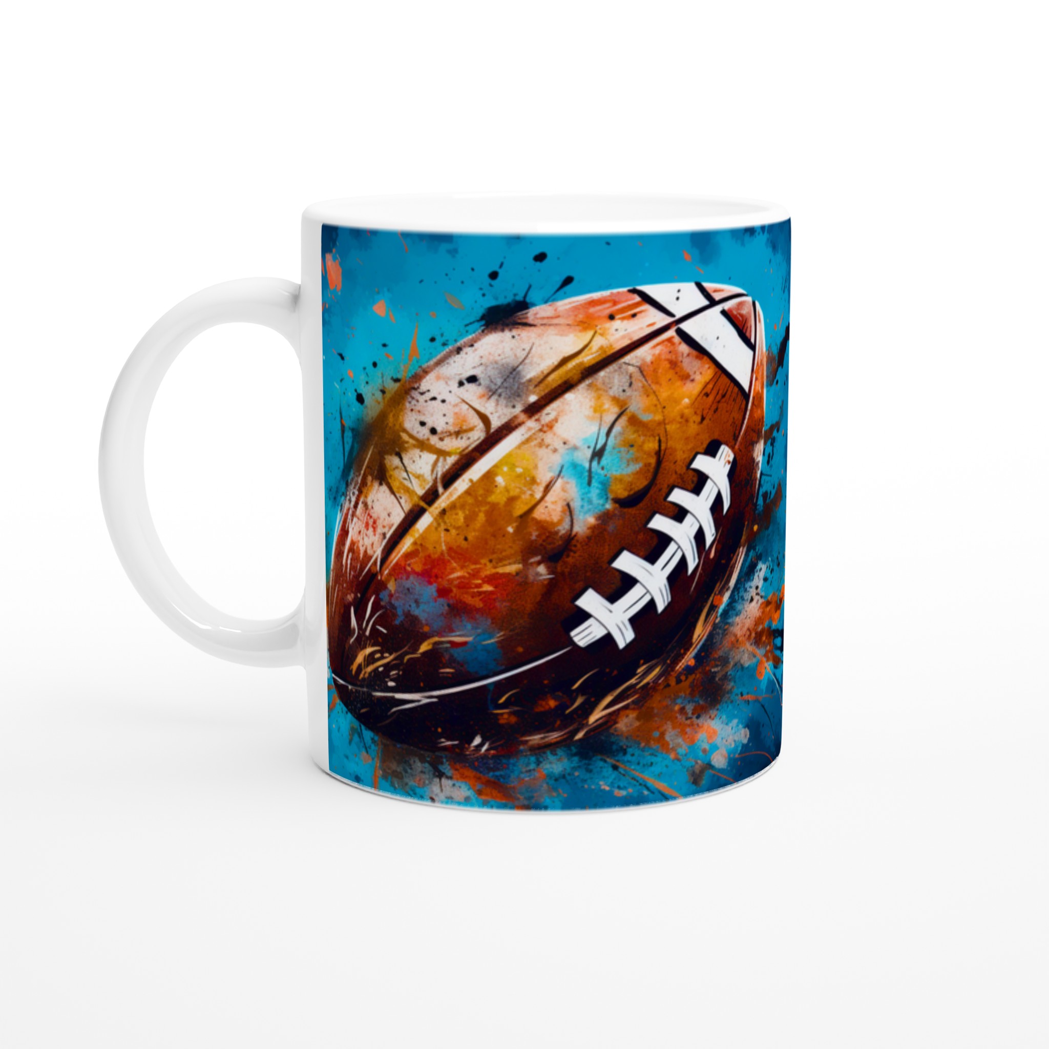 Denna keramiska mugg med ett dynamiskt, abstrakt motiv av en amerikansk fotboll är mer än bara en kopp – det är en hyllning till sport och konst. Med en bakgrund av energiska blå och turkosa toner, kompletterade av stänk i guld, orange och rött, fångar designen känslan av spänning och rörelse. Den blir snabbt en vardagsfavorit, perfekt för morgonkaffet, kvällens varma choklad eller när du bara vill njuta av en kopp te medan du drömmer om nästa match.