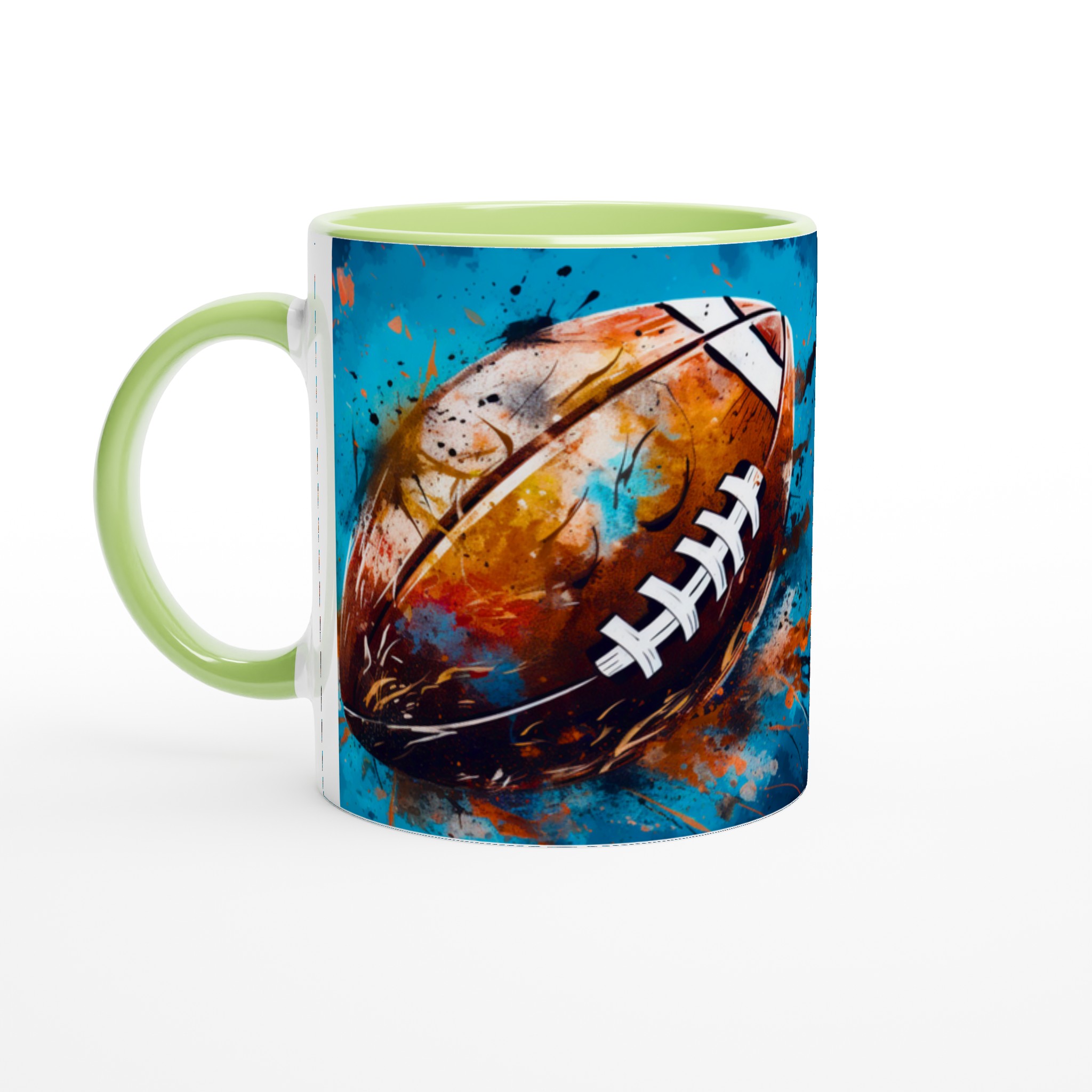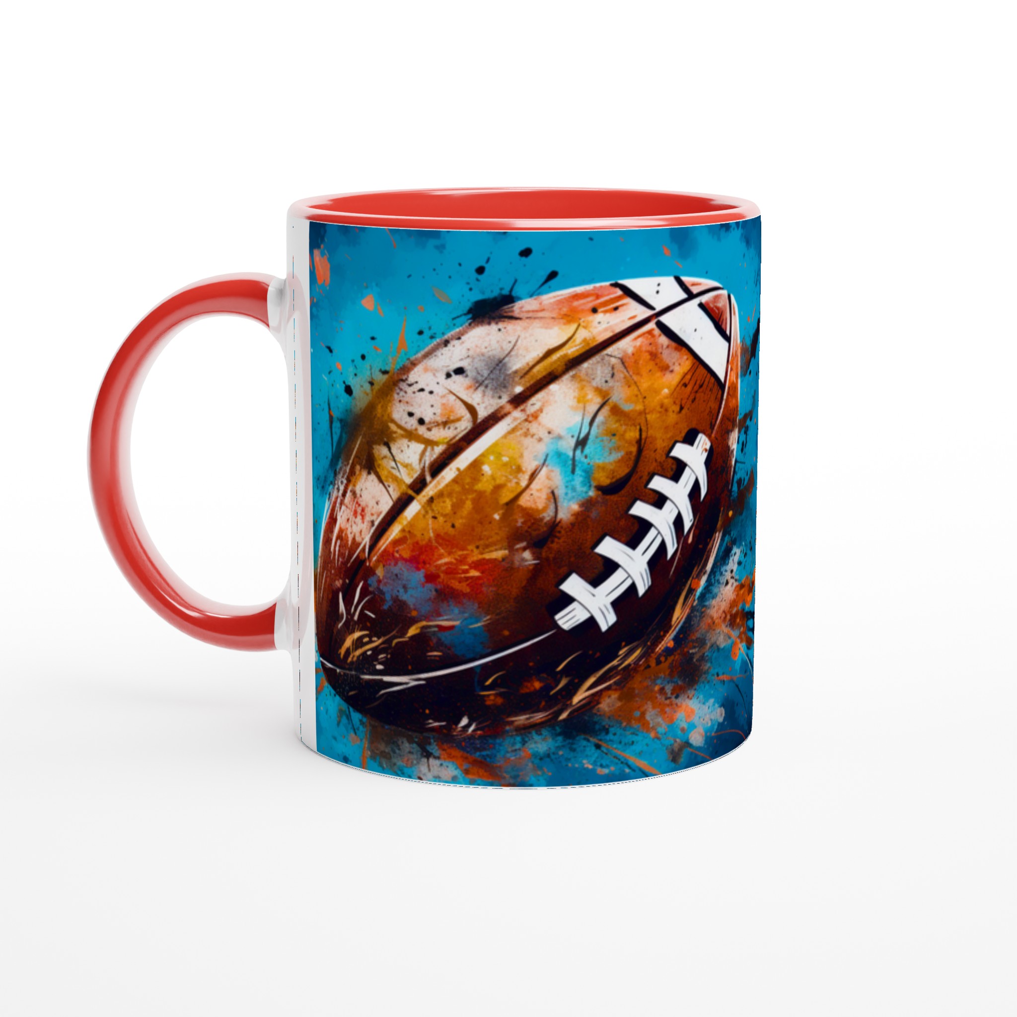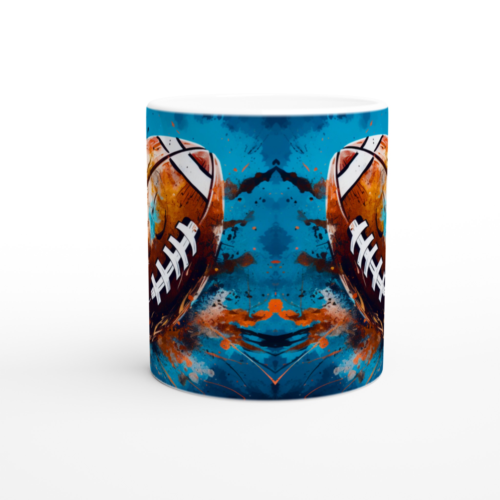 Denna keramiska mugg med ett dynamiskt, abstrakt motiv av en amerikansk fotboll är mer än bara en kopp – det är en hyllning till sport och konst. Med en bakgrund av energiska blå och turkosa toner, kompletterade av stänk i guld, orange och rött, fångar designen känslan av spänning och rörelse. Den blir snabbt en vardagsfavorit, perfekt för morgonkaffet, kvällens varma choklad eller när du bara vill njuta av en kopp te medan du drömmer om nästa match.