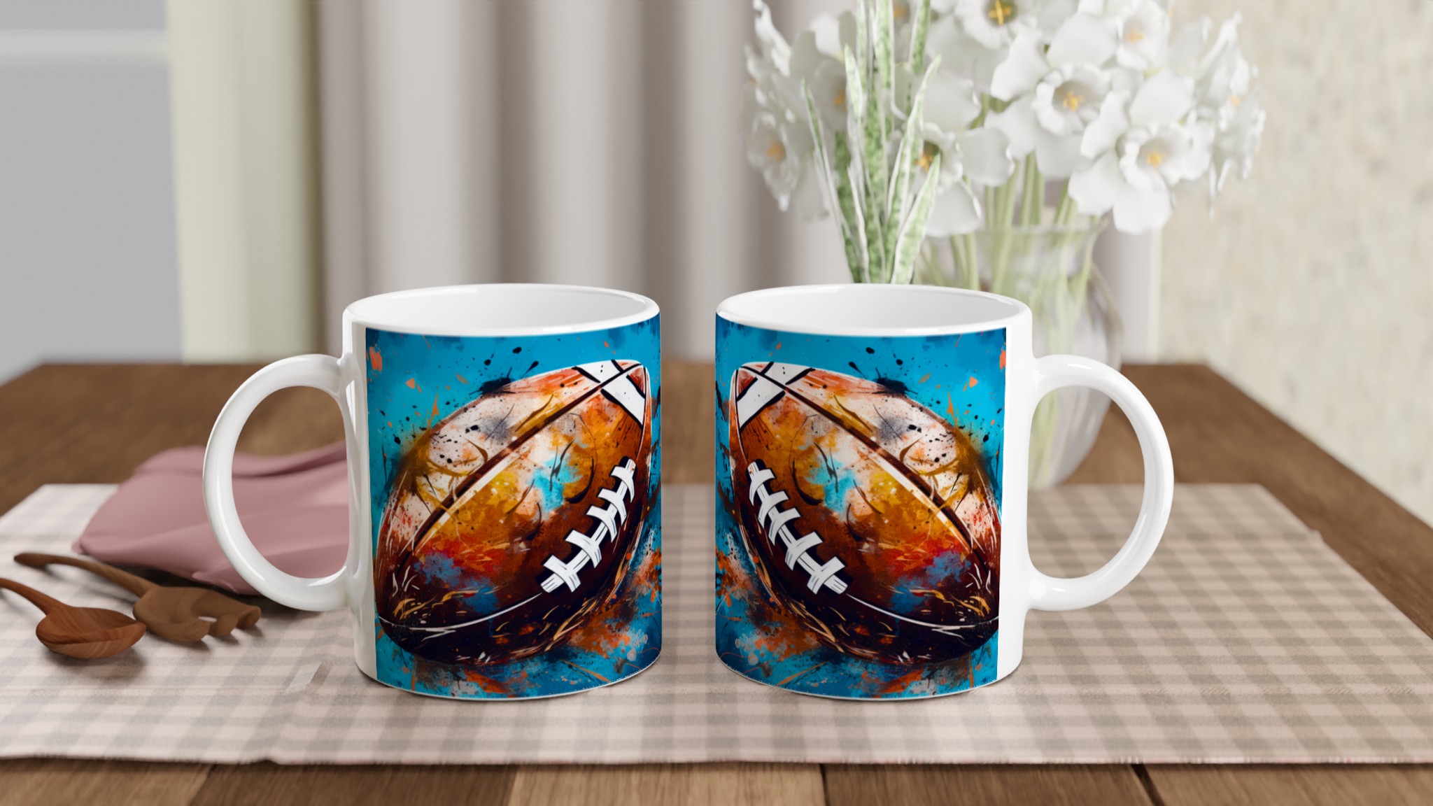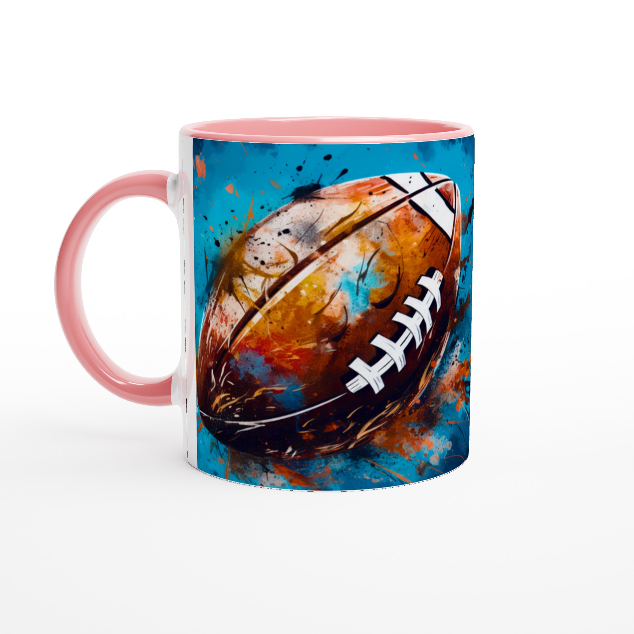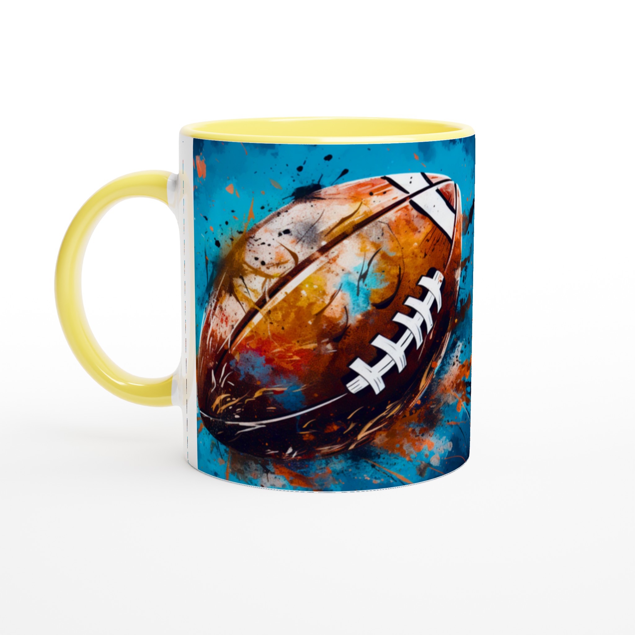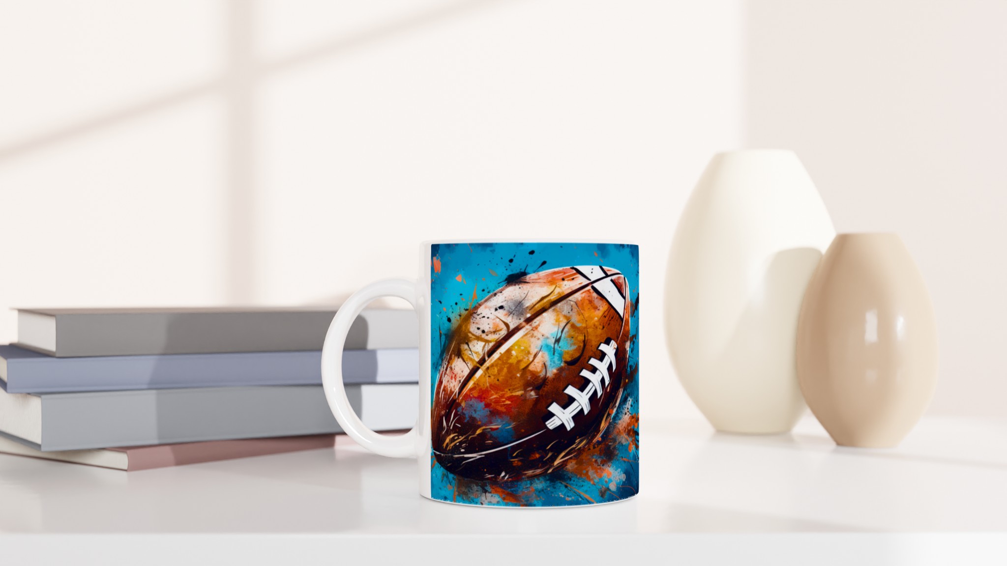 Denna keramiska mugg med ett dynamiskt, abstrakt motiv av en amerikansk fotboll är mer än bara en kopp – det är en hyllning till sport och konst. Med en bakgrund av energiska blå och turkosa toner, kompletterade av stänk i guld, orange och rött, fångar designen känslan av spänning och rörelse. Den blir snabbt en vardagsfavorit, perfekt för morgonkaffet, kvällens varma choklad eller när du bara vill njuta av en kopp te medan du drömmer om nästa match.