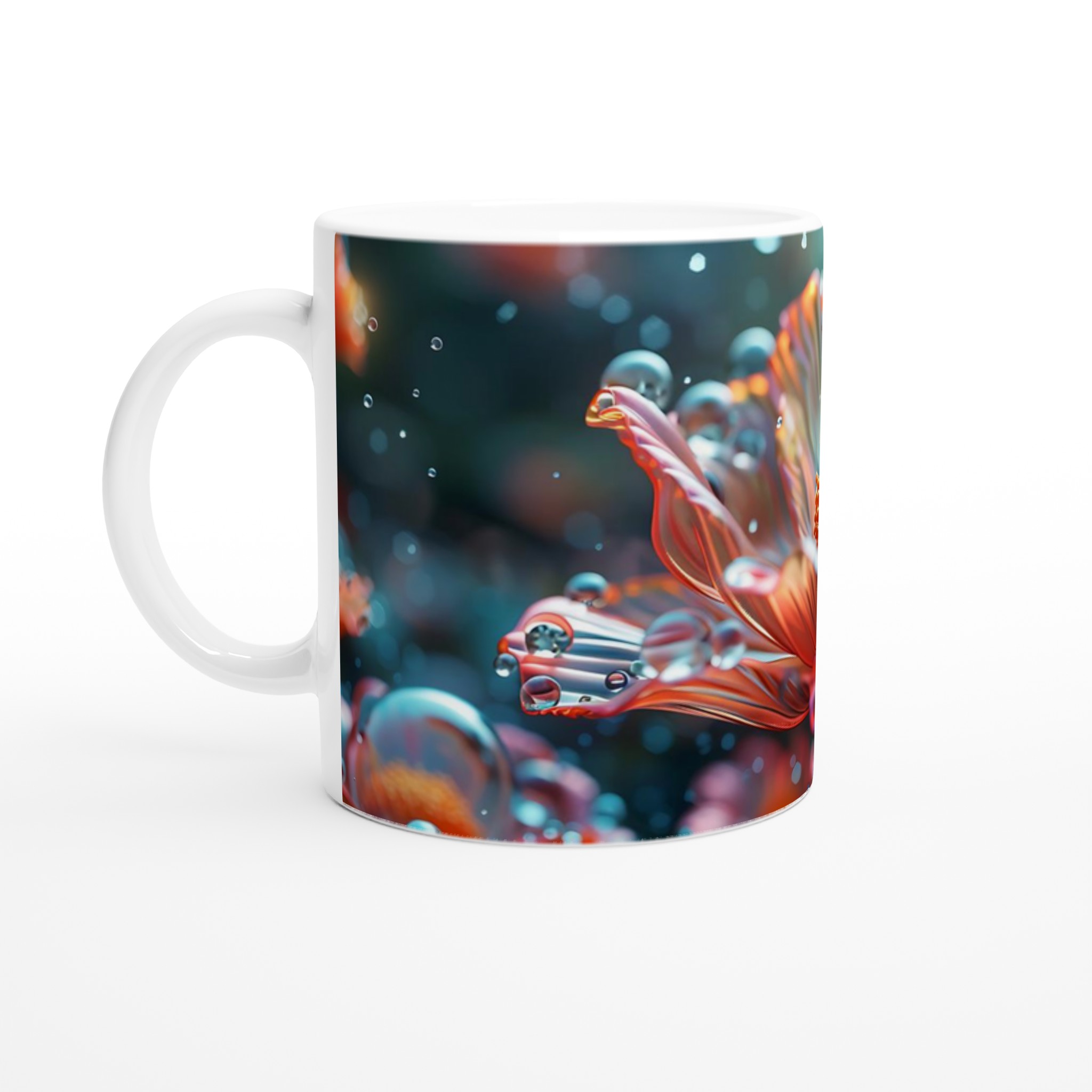 Denna design, inspirerad av den hisnande skönheten hos abstrakta blommor och skimrande vattendroppar, förvandlar varje sipp till en upplevelse. Med en palett av lugnande koralltoner och levande aqua, fångar den en känsla av mystik och naturlig elegans. Vår blanka vita yta ger ett skarpt och levande tryck som verkligen sticker ut, oavsett om det är en personlig design, ett roligt citat eller en present till någon du tycker om.