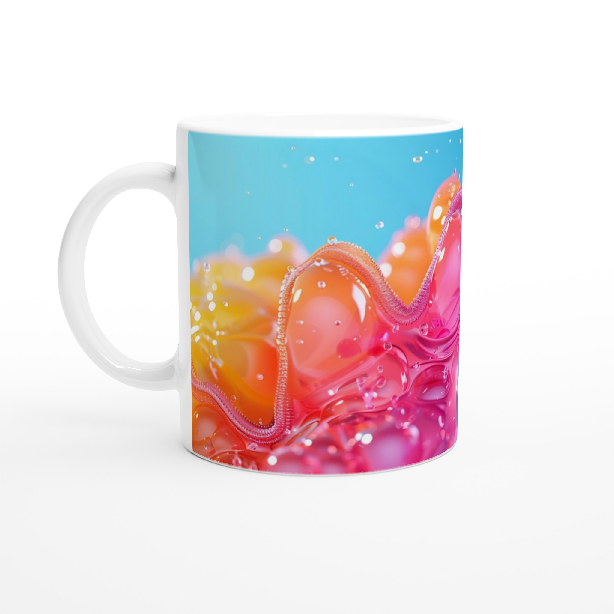 Föreställ dig en symfoni av glädje och färg varje gång du tar en klunk! Denna 11 oz keramiska mugg fångar den lekfulla magin från regnbågsfärgade bubblor och droppar, vilket ger din dryckesupplevelse en sprudlande och drömlik känsla. Den blanka vita ytan ger ett skarpt och levande tryck som verkligen sticker ut, oavsett om det är en personlig design, ett roligt citat eller en present till någon du tycker om.