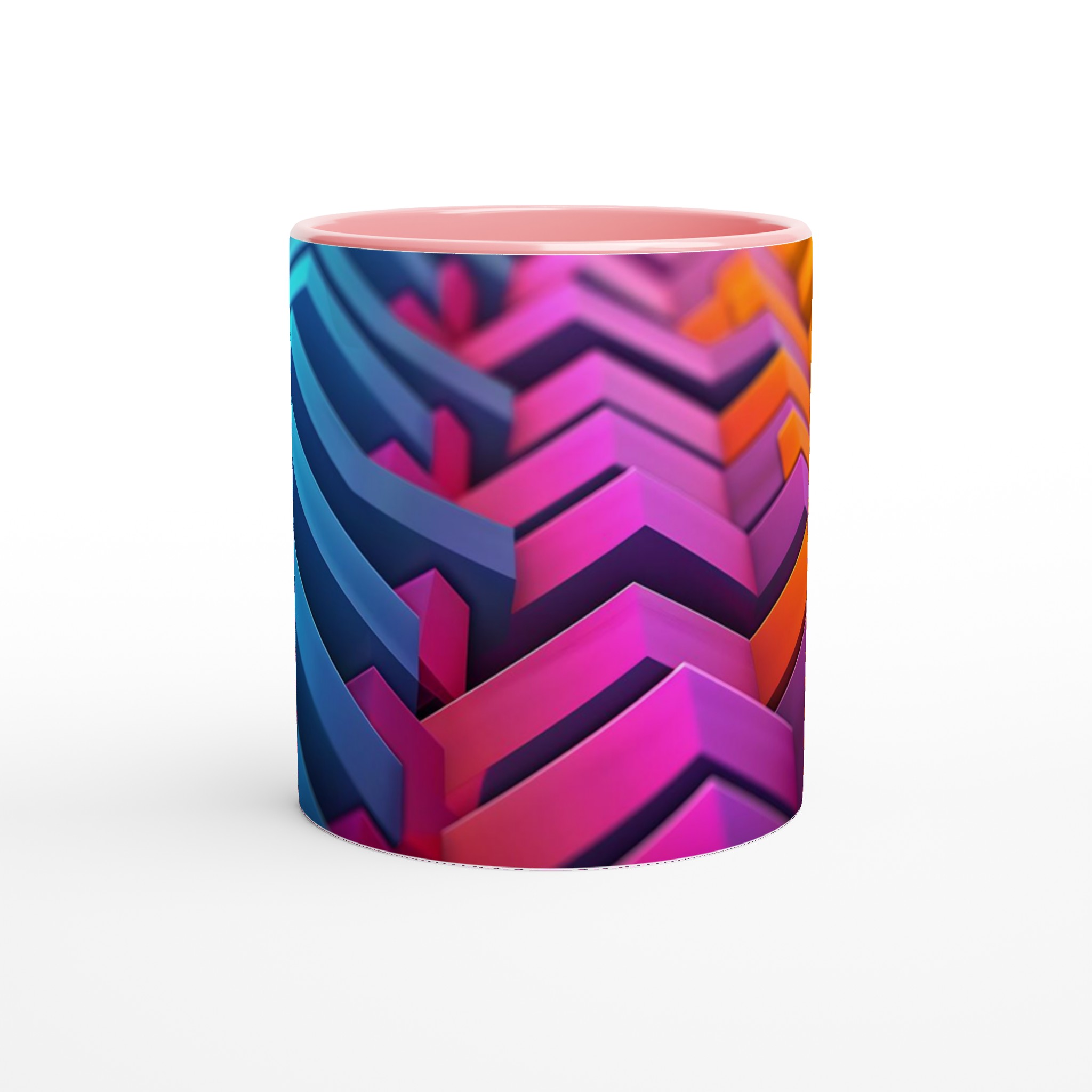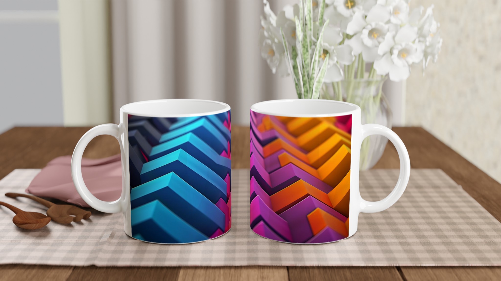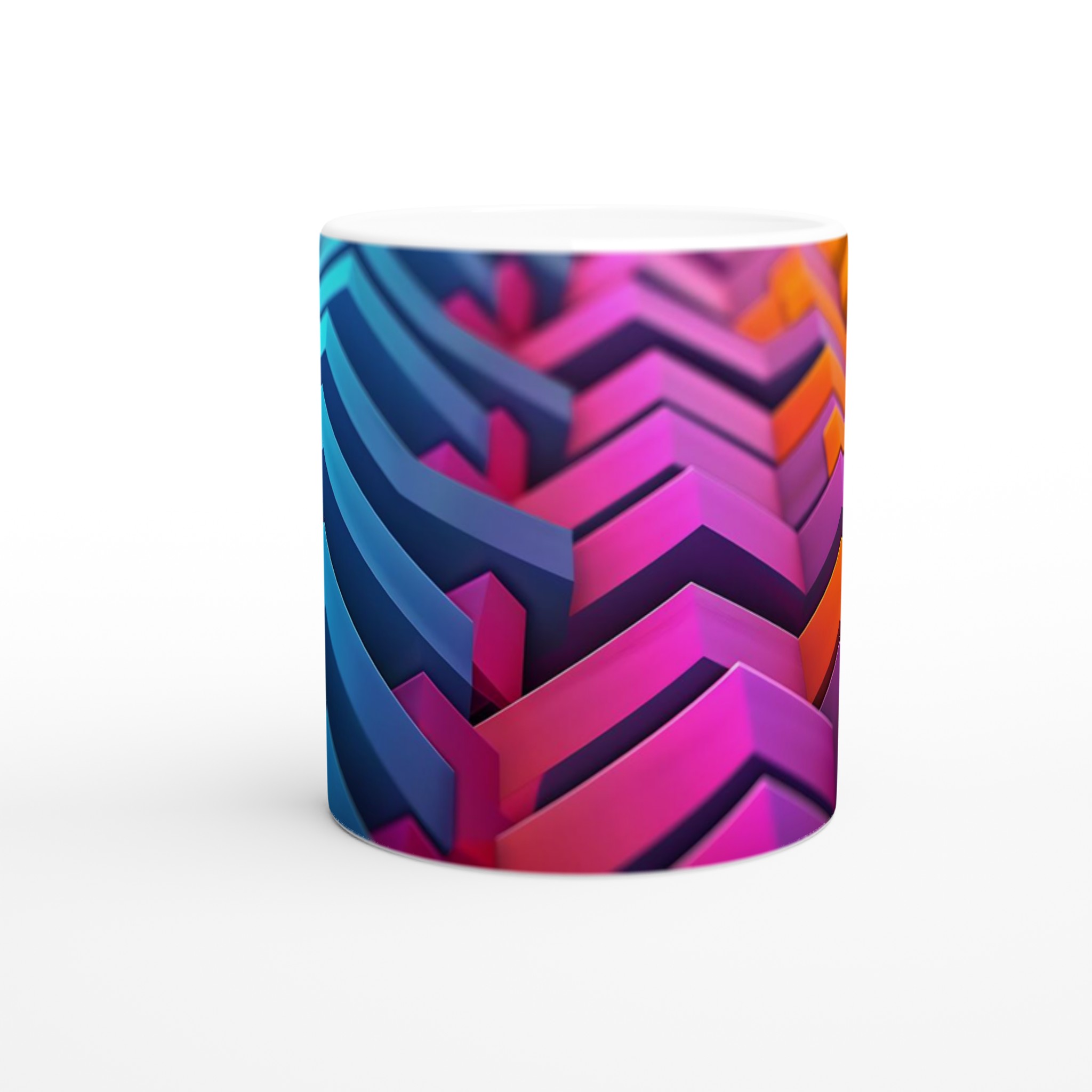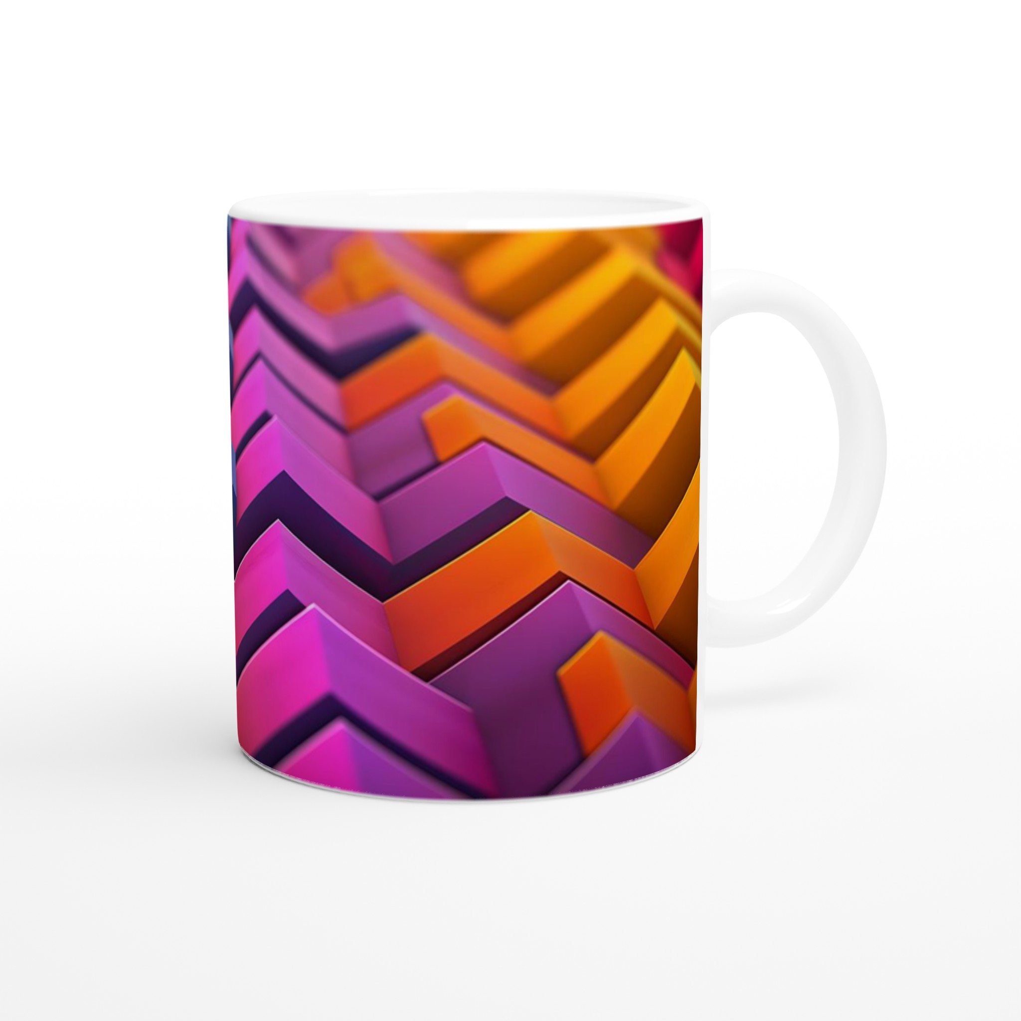 Väck dina sinnen varje morgon med denna stilrena och vackra keramikmugg, prydd med ett hypnotiserande abstrakt chevronmönster. Den livfulla färgpaletten av blått, rosa, lila och orange skapar en modern och energisk känsla, perfekt för att kickstarta dagen med morgonkaffet, en värmande kopp te eller en härlig varm choklad. Den blanka vita ytan ser till att det dynamiska trycket framträder klart och färgstarkt, vilket gör muggen till en riktig favorit i vardagen.