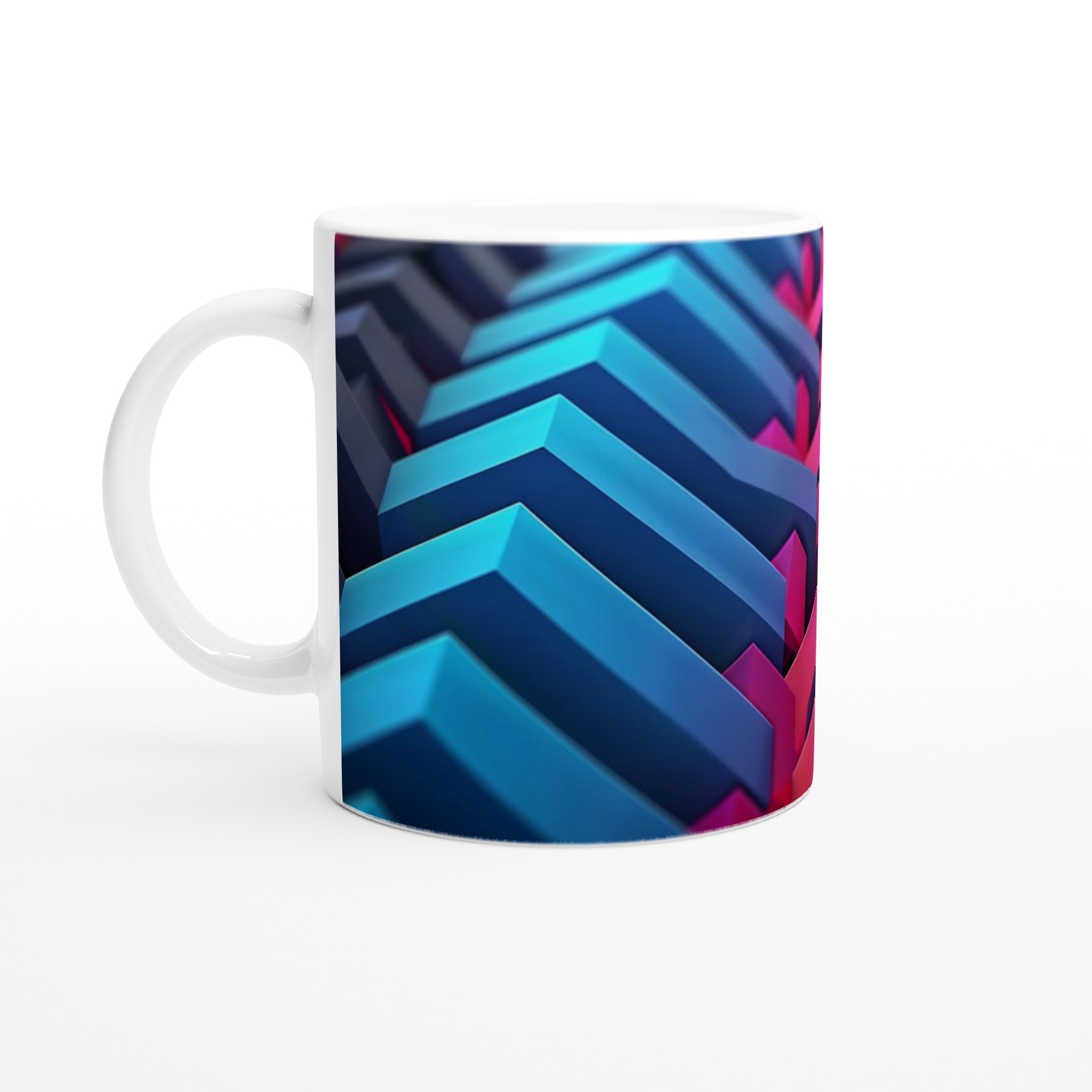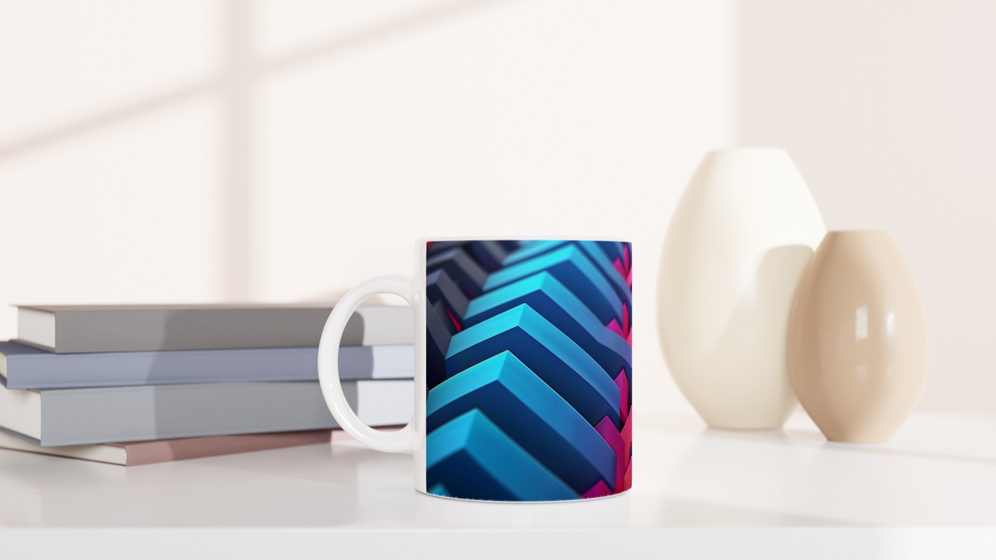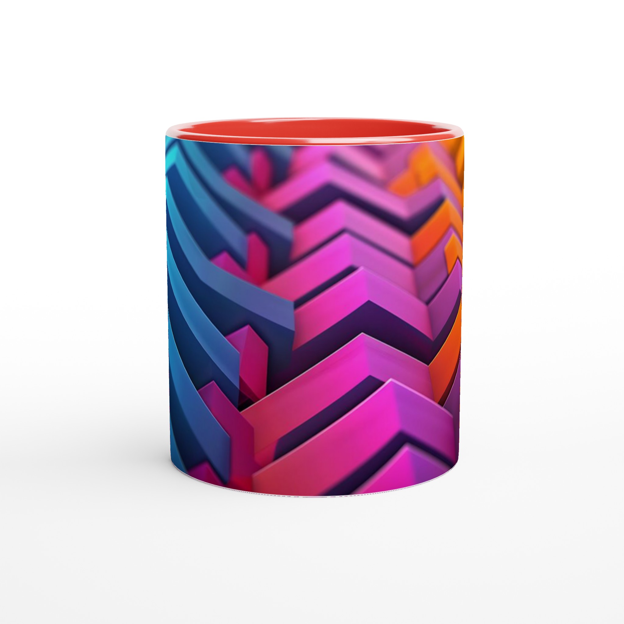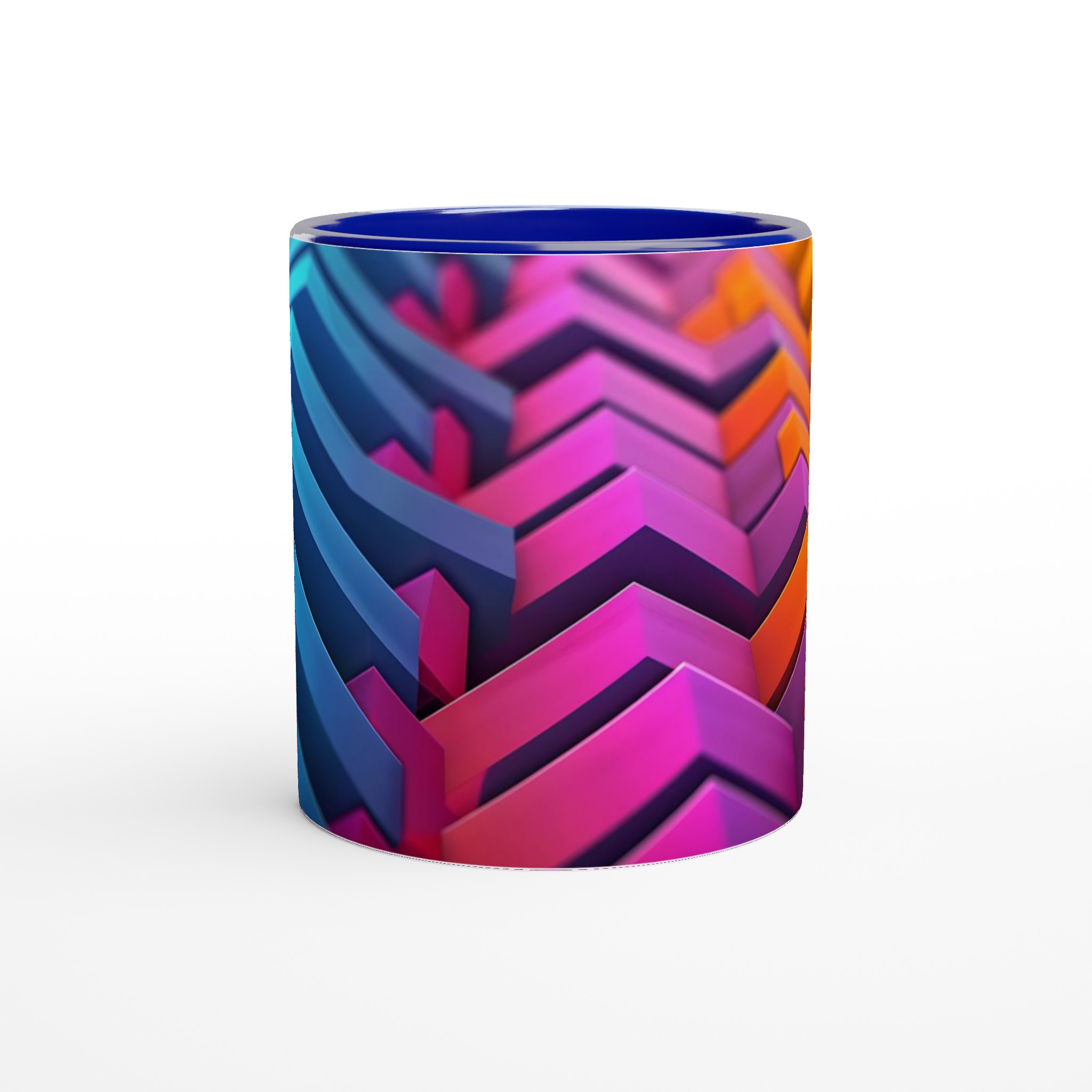 Väck dina sinnen varje morgon med denna stilrena och vackra keramikmugg, prydd med ett hypnotiserande abstrakt chevronmönster. Den livfulla färgpaletten av blått, rosa, lila och orange skapar en modern och energisk känsla, perfekt för att kickstarta dagen med morgonkaffet, en värmande kopp te eller en härlig varm choklad. Den blanka vita ytan ser till att det dynamiska trycket framträder klart och färgstarkt, vilket gör muggen till en riktig favorit i vardagen.
