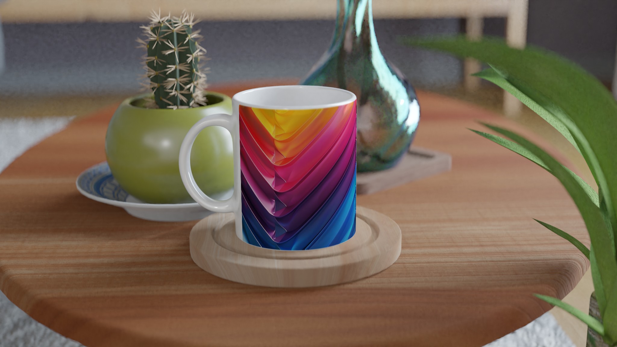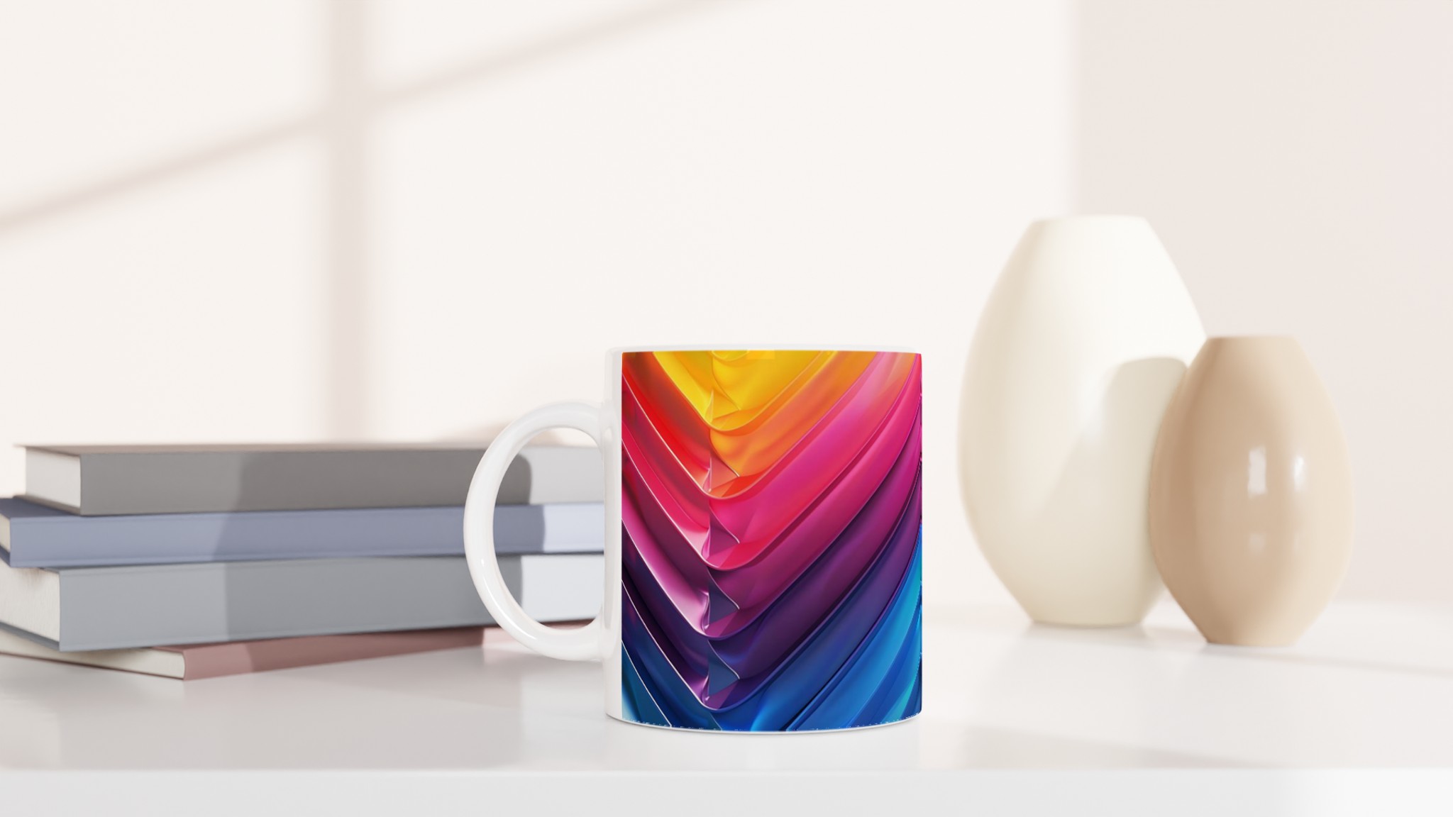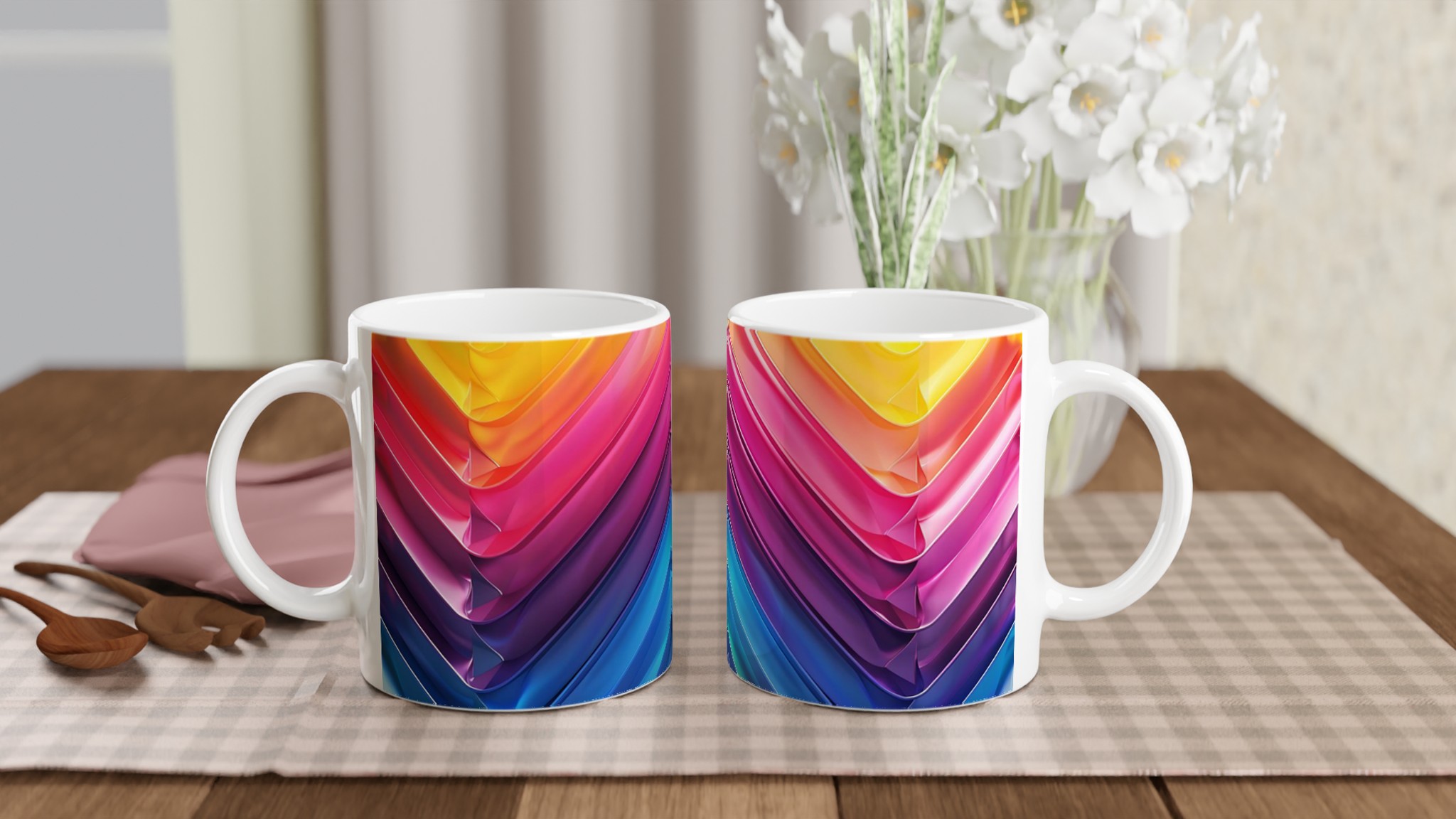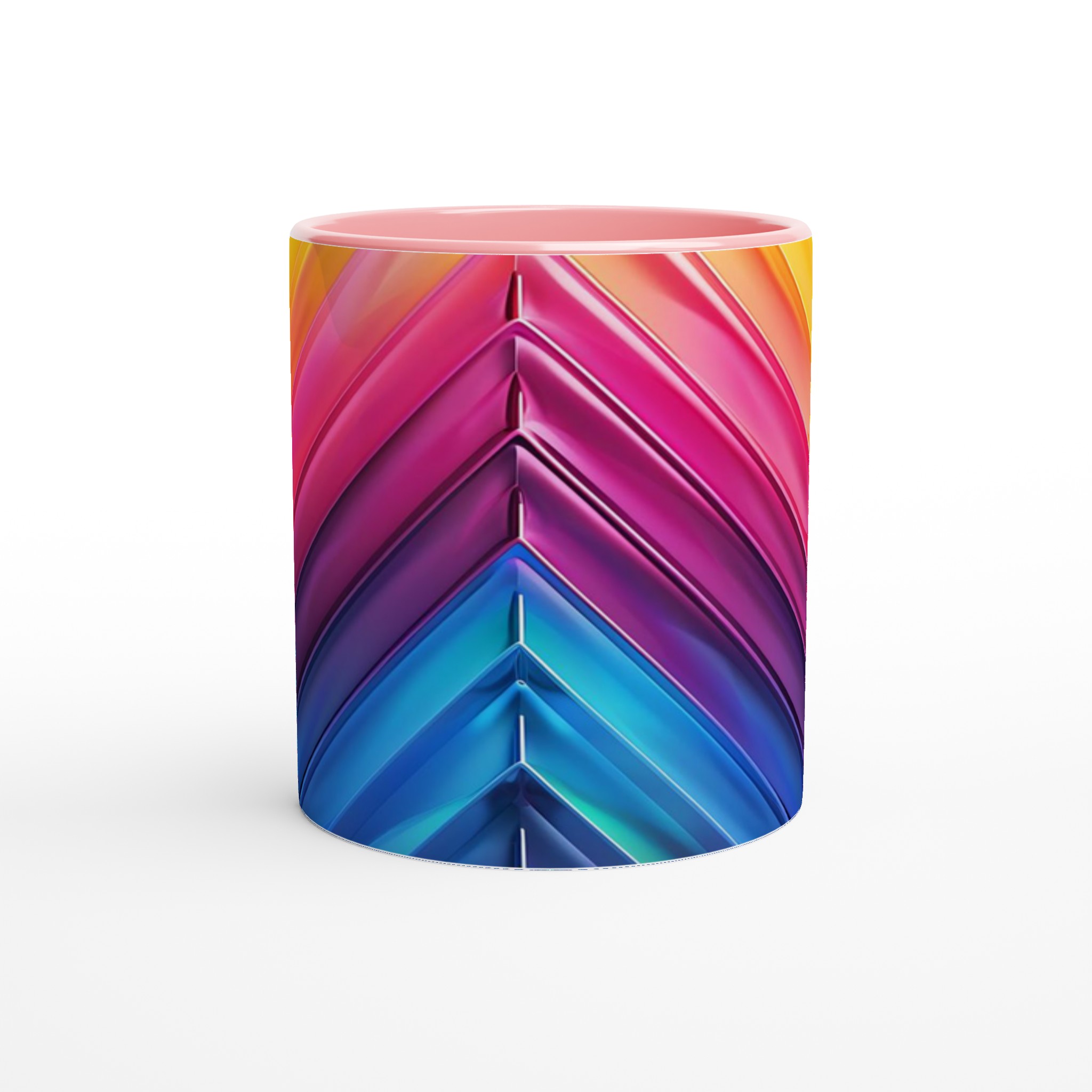 Fånga dagens energi med vår Abstrakt Chevron Keramiska Mugg, där levande färggradienter möter modern design. Denna stilrena och vackra keramikmugg är perfekt för alla dagens stunder – morgonkaffet, en värmande kopp te eller en härlig varm choklad. Med dess dynamiska färgsättning från soligt gult till djupa blå toner, skapar den en känsla av rörelse och modern elegans som livar upp varje paus. Den blanka vita ytan gör att trycken framträder klart och färgstarkt, vilket gör muggen till en riktig favorit i vardagen. Tack vare den höga kvaliteten behåller trycket sin lyster även efter många omgångar i både mikrovågsugn och diskmaskin.
