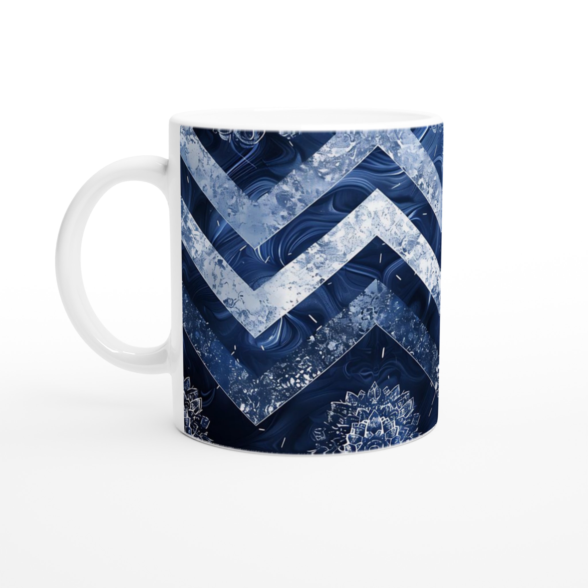 Inspirerad av den mystiska skönheten hos djupa hav och frostiga nätter, har denna mugg en slående abstrakt chevronmönster i nyanser av djupt indigo och ljusblått, accentuerat med intrikata mandalaliknande detaljer. Den blanka vita ytan ger ett skarpt och levande tryck som verkligen sticker ut, oavsett om det är en personlig design, ett roligt citat eller en present till någon du tycker om.