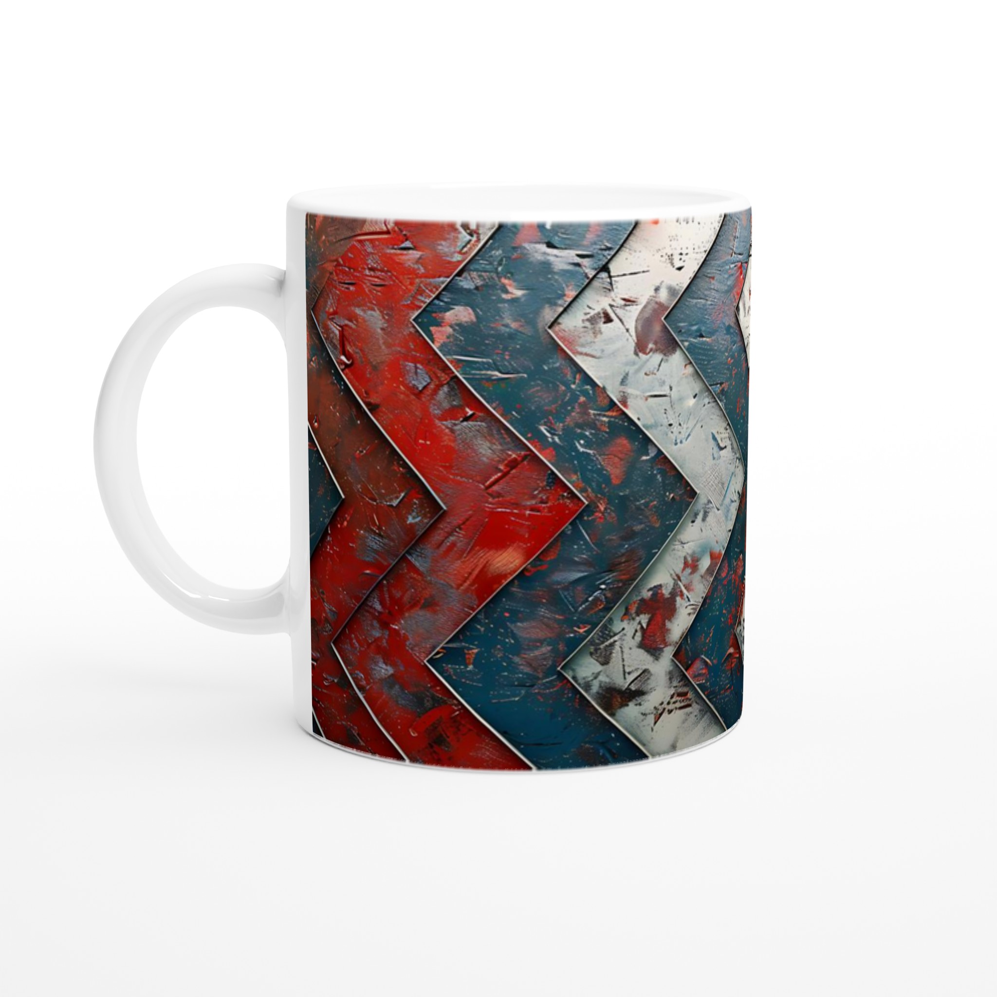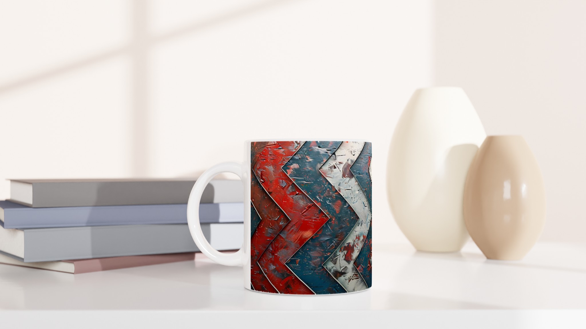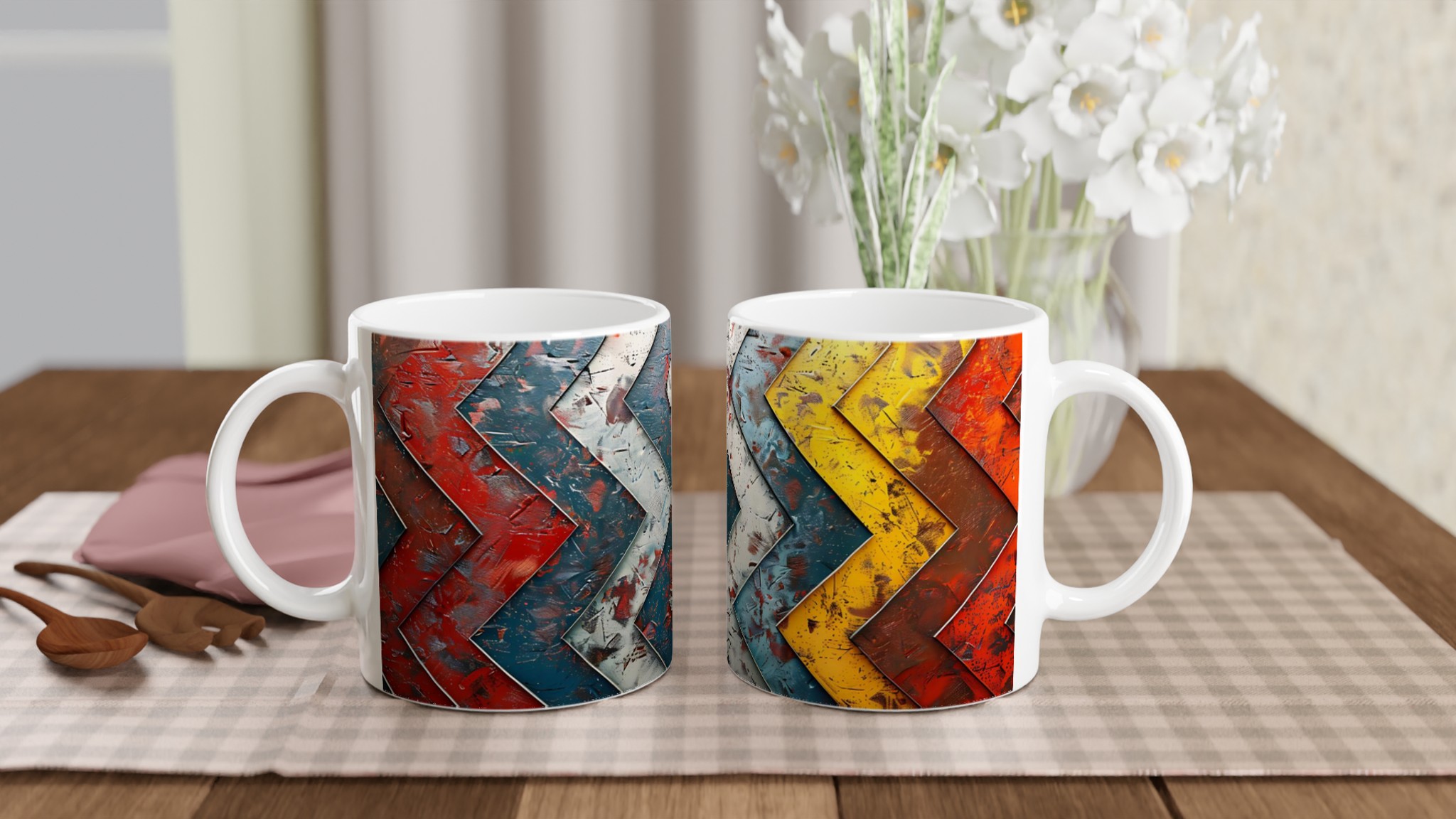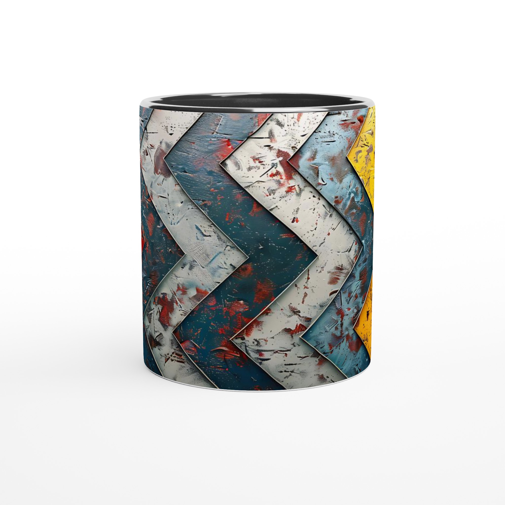 Lyft din fikapaus med denna iögonfallande keramikmugg som kombinerar konstnärlig stil med vardagsfunktionalitet. Med ett dynamiskt abstrakt chevronmönster och en rik palett av färger, är denna mugg mer än bara en dryckesbehållare – den är ett statement. Varje klunk blir en upplevelse, vare sig det är ditt morgonkaffe, en lugnande kopp te eller en lyxig varm choklad.