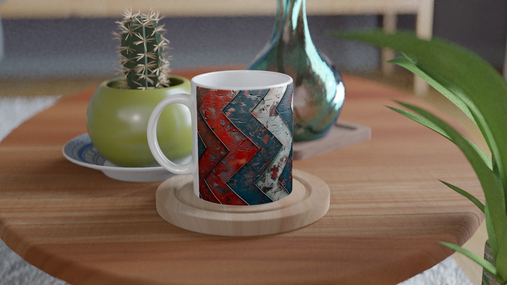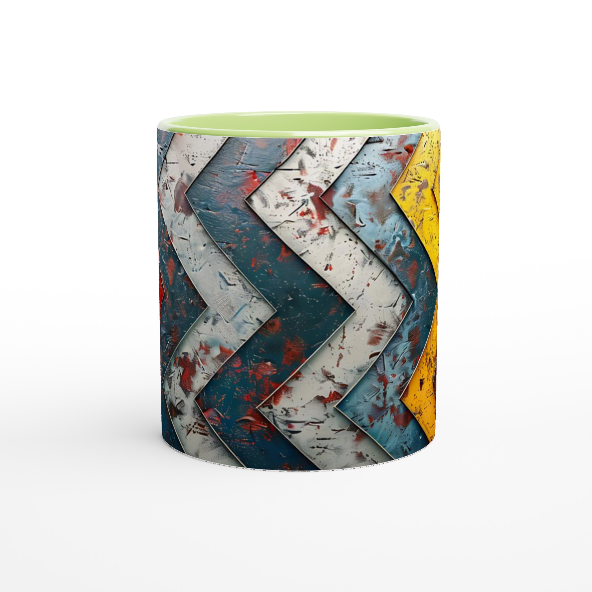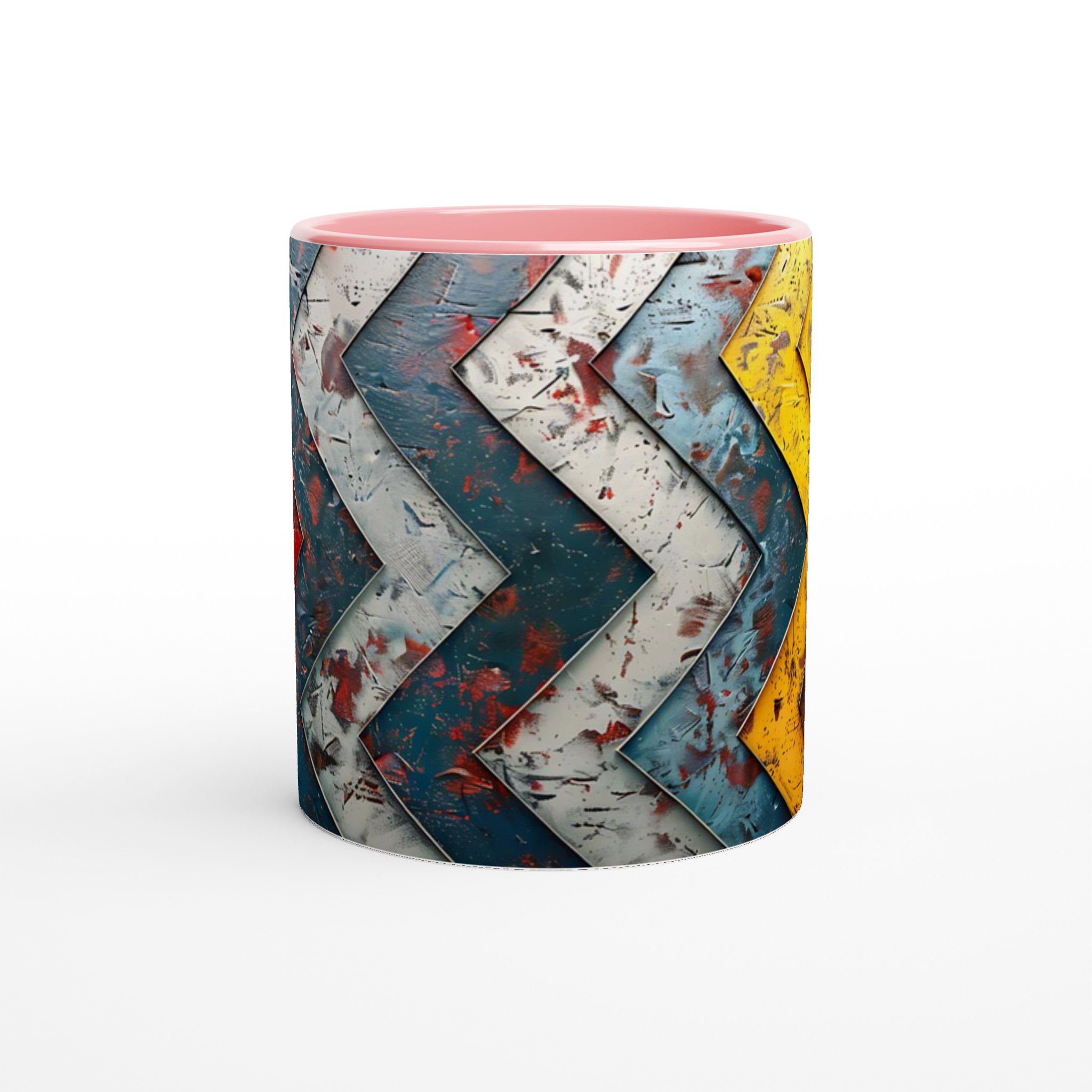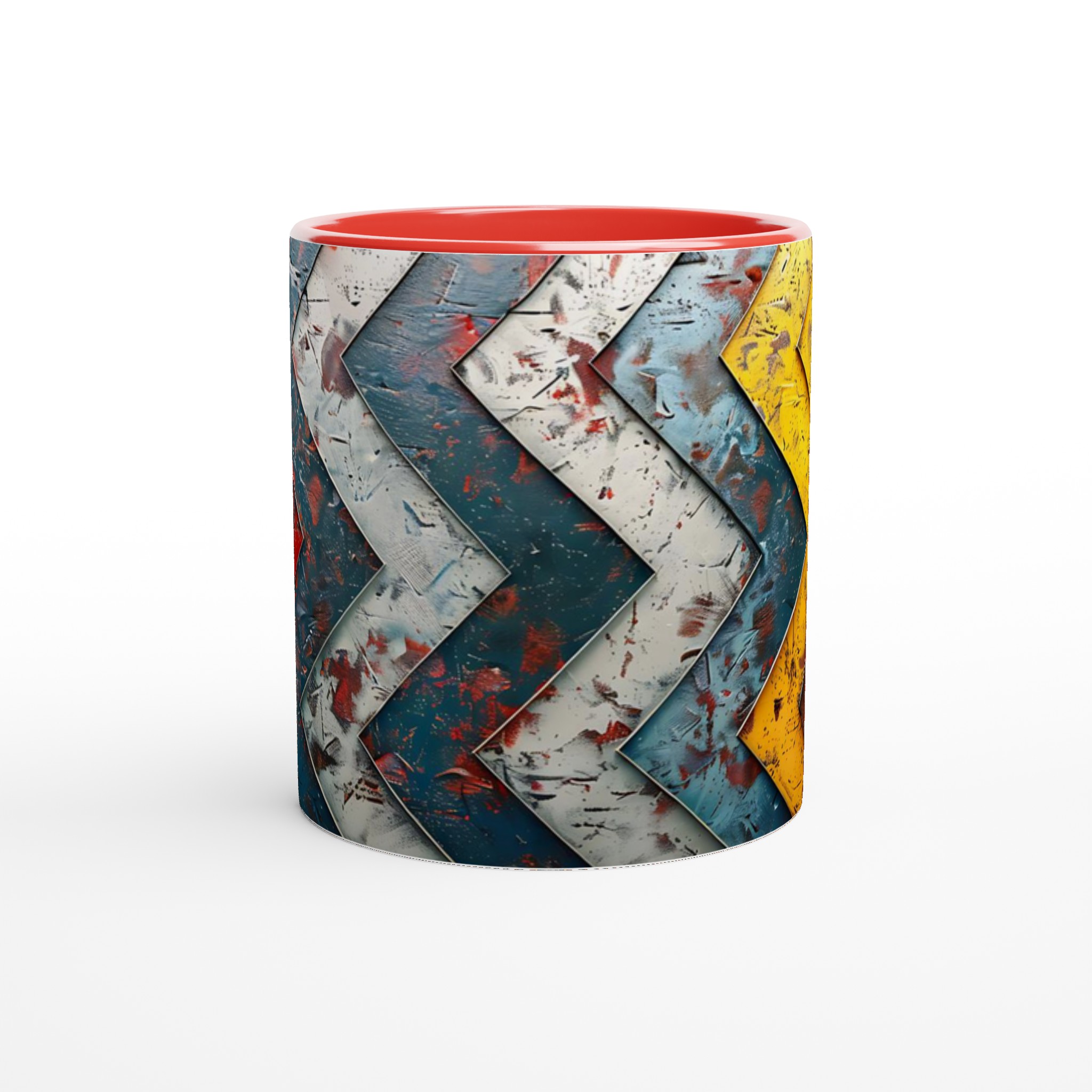 Lyft din fikapaus med denna iögonfallande keramikmugg som kombinerar konstnärlig stil med vardagsfunktionalitet. Med ett dynamiskt abstrakt chevronmönster och en rik palett av färger, är denna mugg mer än bara en dryckesbehållare – den är ett statement. Varje klunk blir en upplevelse, vare sig det är ditt morgonkaffe, en lugnande kopp te eller en lyxig varm choklad.