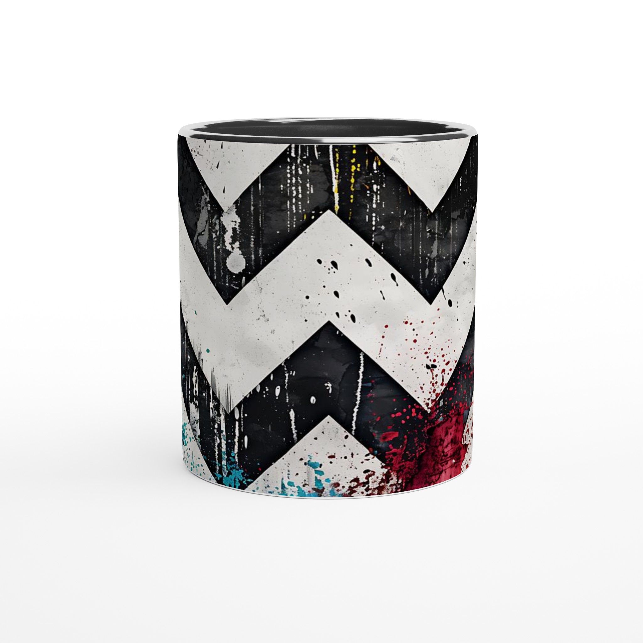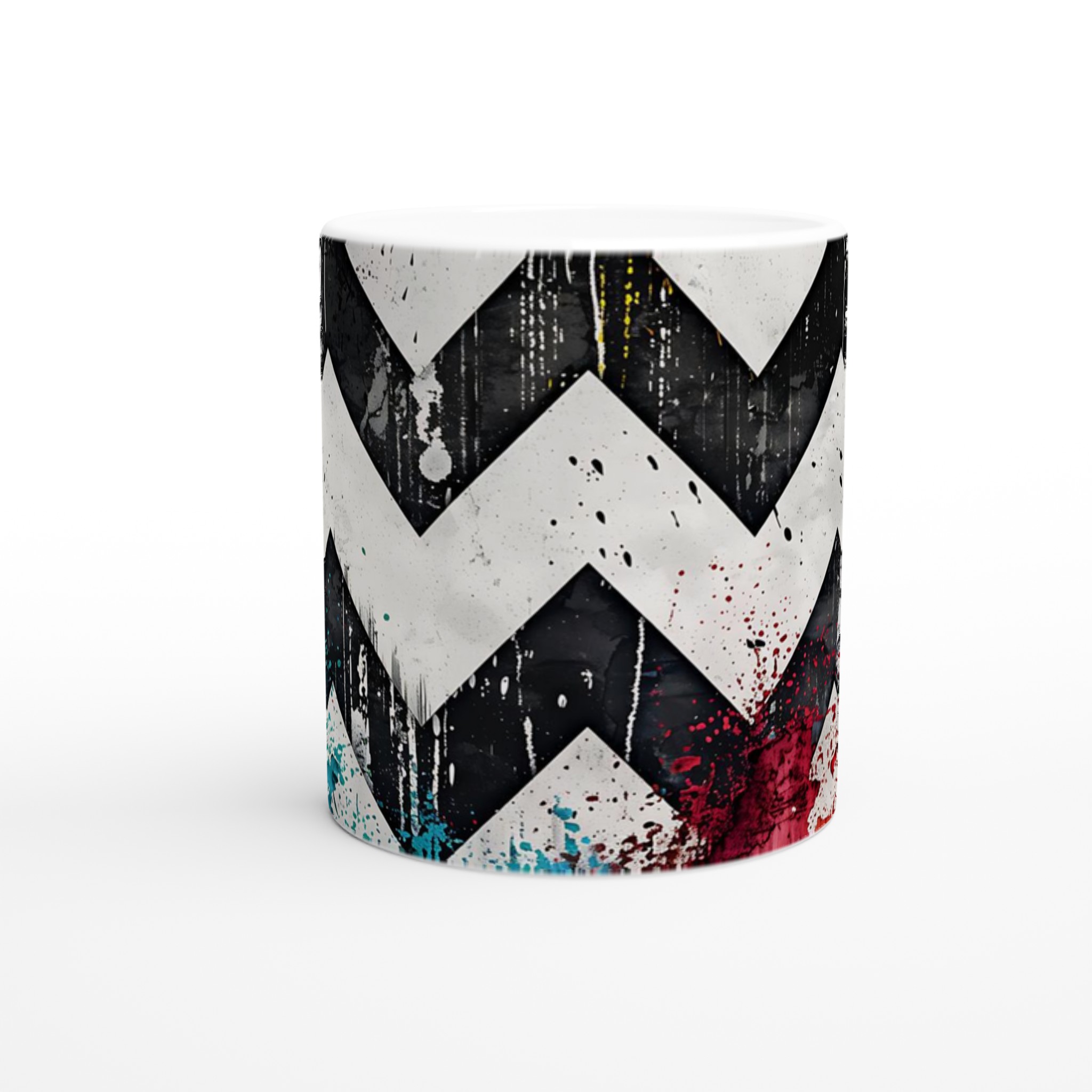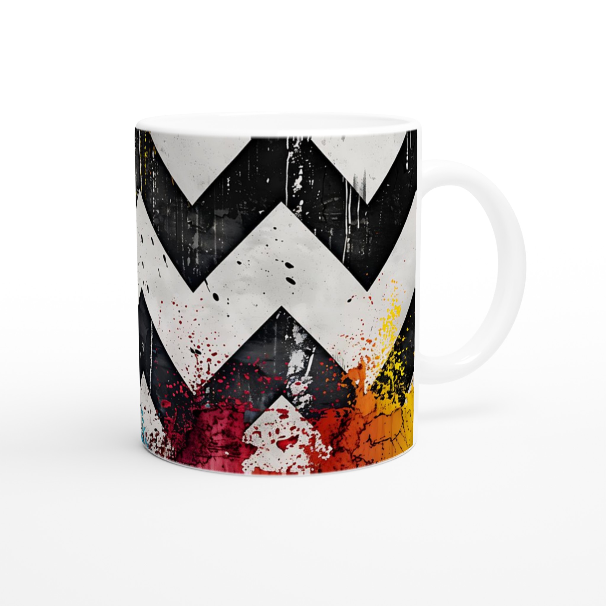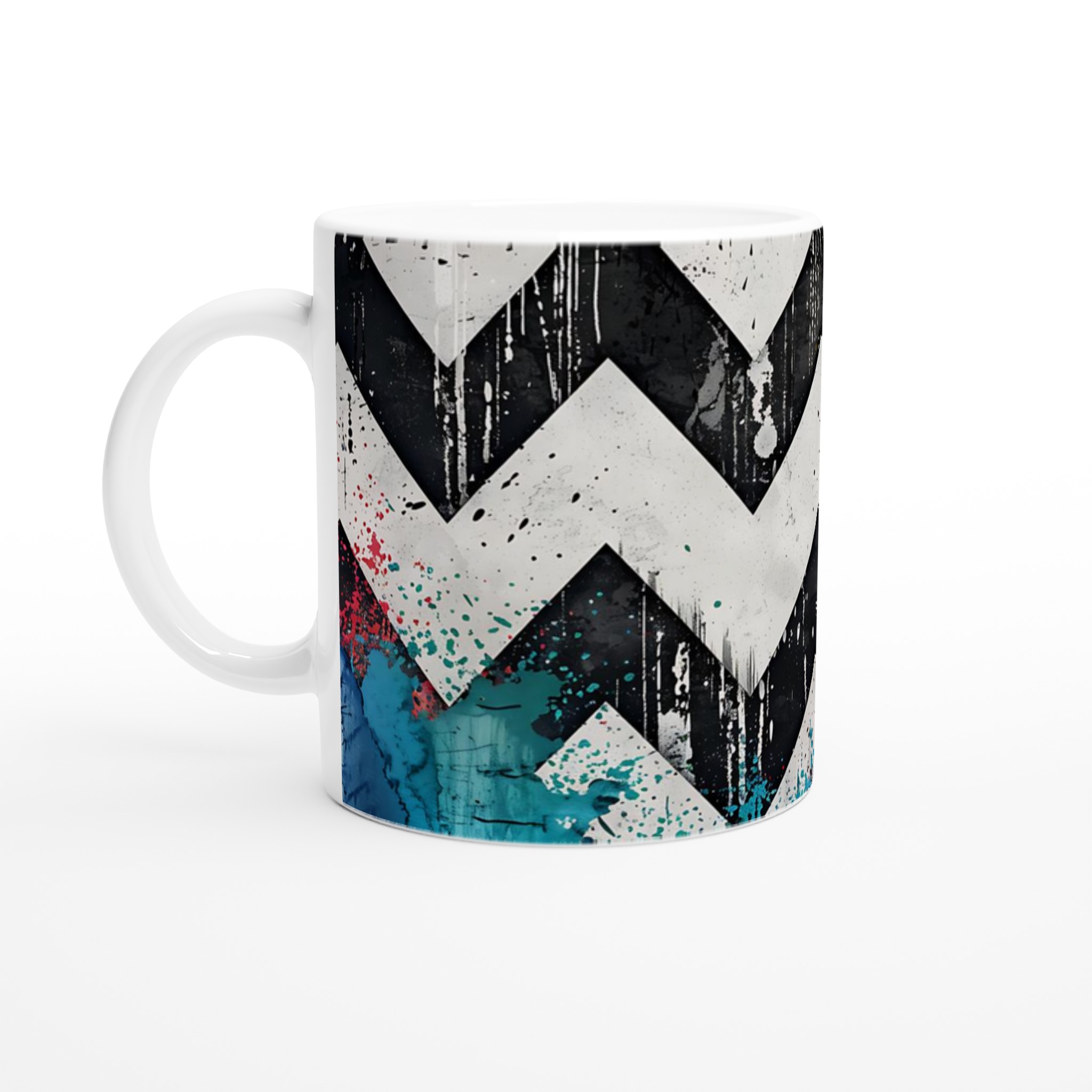 Lyft din vardagsrutin med vår iögonfallande Abstrakta Chevron Mugg. Inspirerad av urban konst och modern design, blandar denna mugg djärva svarta och vita chevronmönster med energiska stänk av levande färg. Det är den perfekta muggen för att liva upp din morgonkaffestund, njuta av en lugnande kopp te eller varva ner med en varm choklad – varje klunk blir en upplevelse för sinnena.