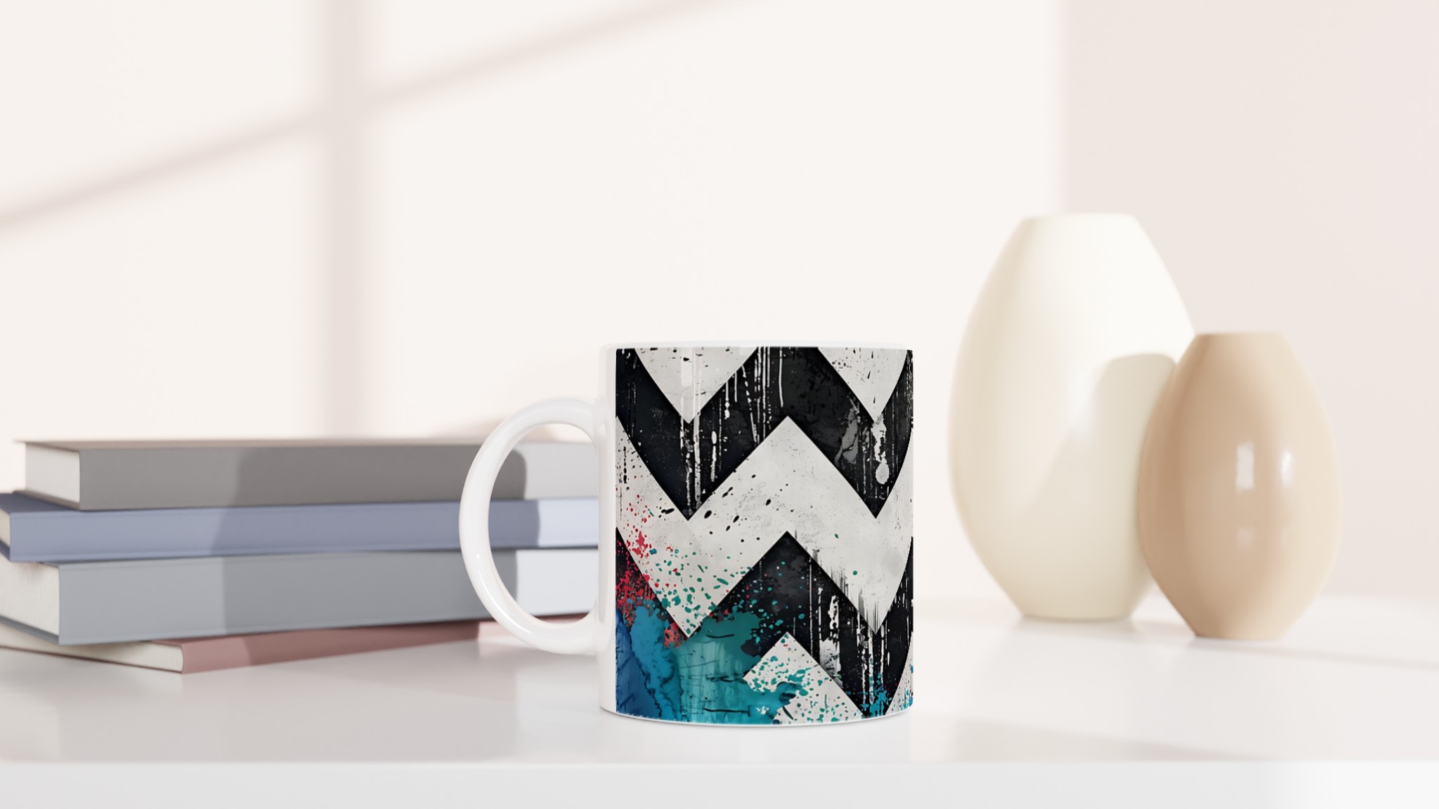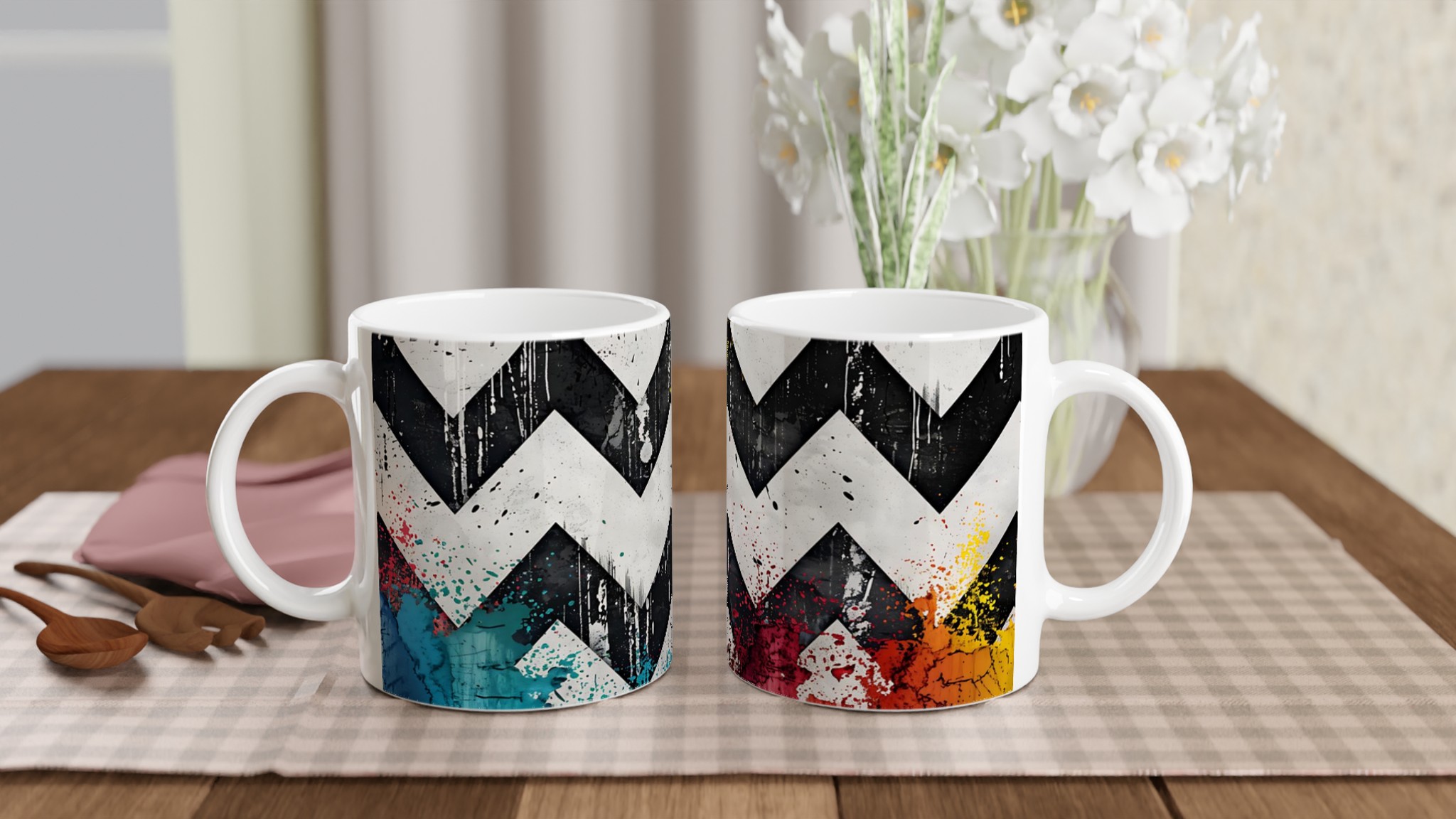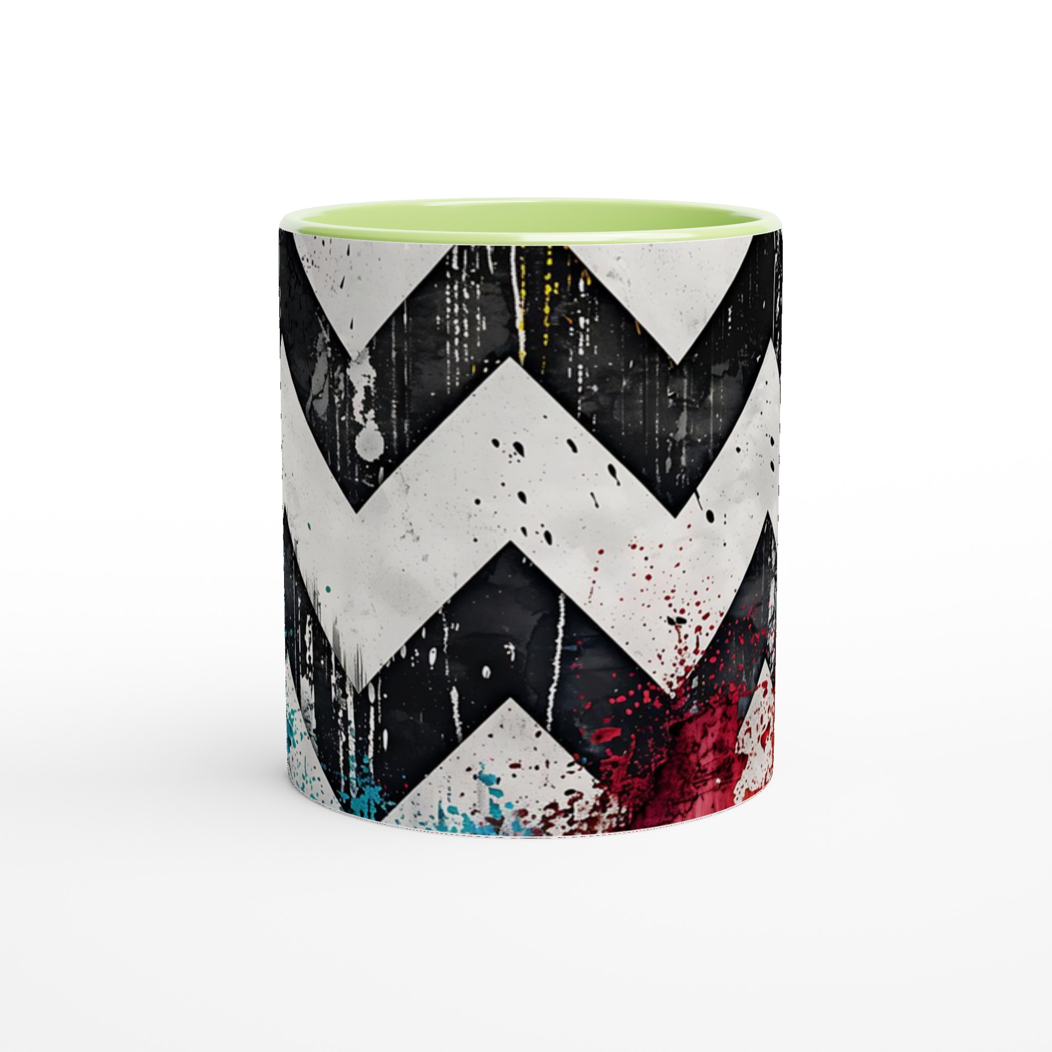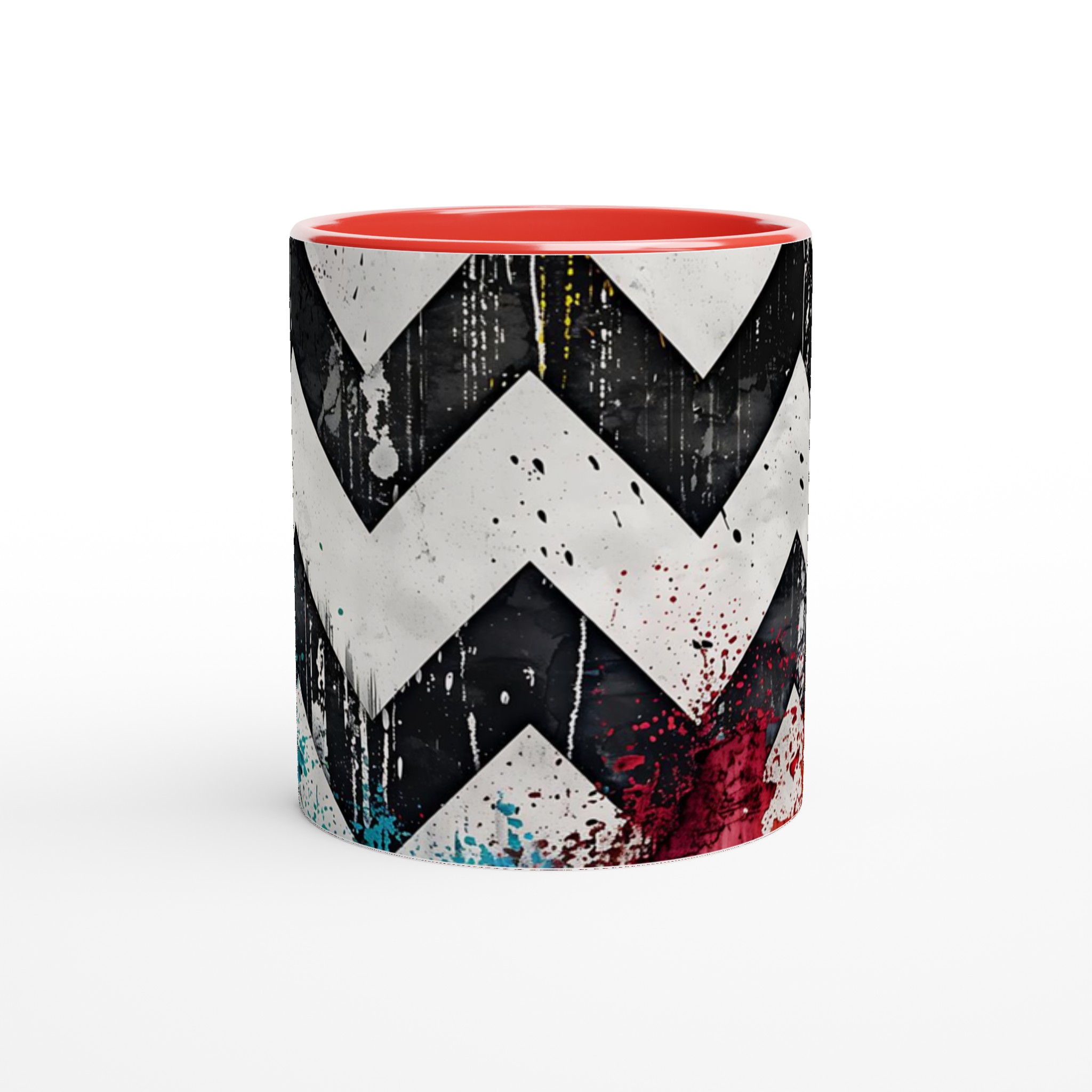 Lyft din vardagsrutin med vår iögonfallande Abstrakta Chevron Mugg. Inspirerad av urban konst och modern design, blandar denna mugg djärva svarta och vita chevronmönster med energiska stänk av levande färg. Det är den perfekta muggen för att liva upp din morgonkaffestund, njuta av en lugnande kopp te eller varva ner med en varm choklad – varje klunk blir en upplevelse för sinnena.