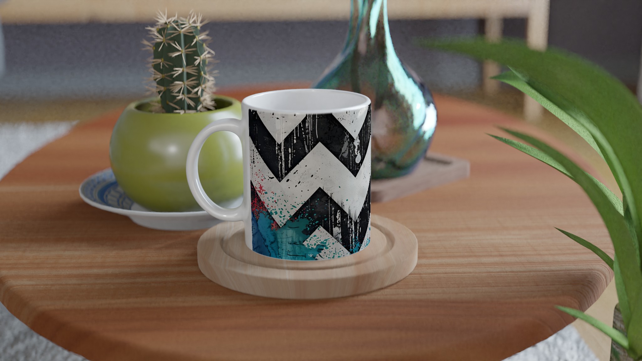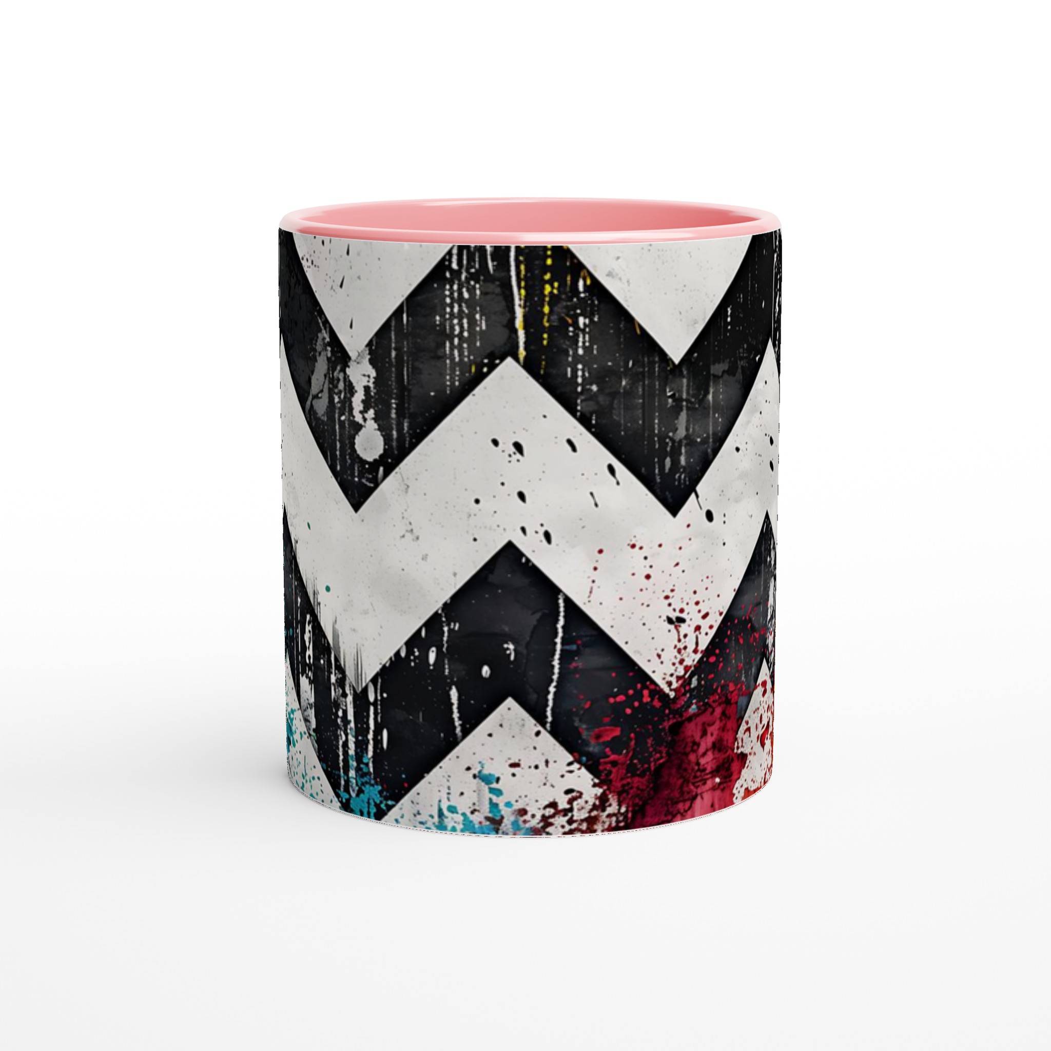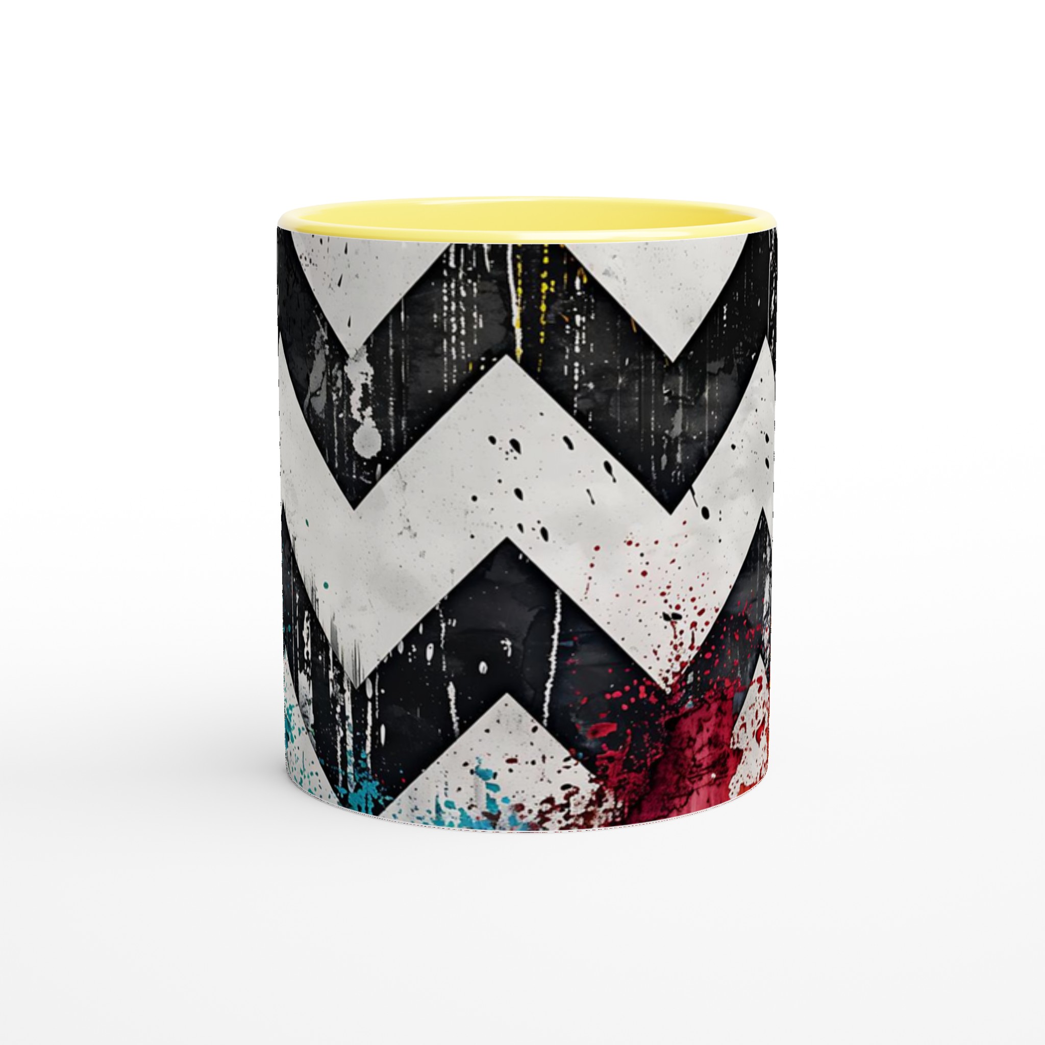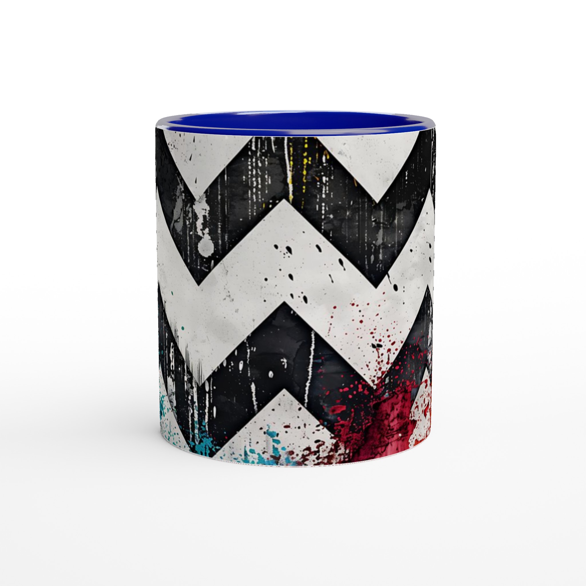 Lyft din vardagsrutin med vår iögonfallande Abstrakta Chevron Mugg. Inspirerad av urban konst och modern design, blandar denna mugg djärva svarta och vita chevronmönster med energiska stänk av levande färg. Det är den perfekta muggen för att liva upp din morgonkaffestund, njuta av en lugnande kopp te eller varva ner med en varm choklad – varje klunk blir en upplevelse för sinnena.