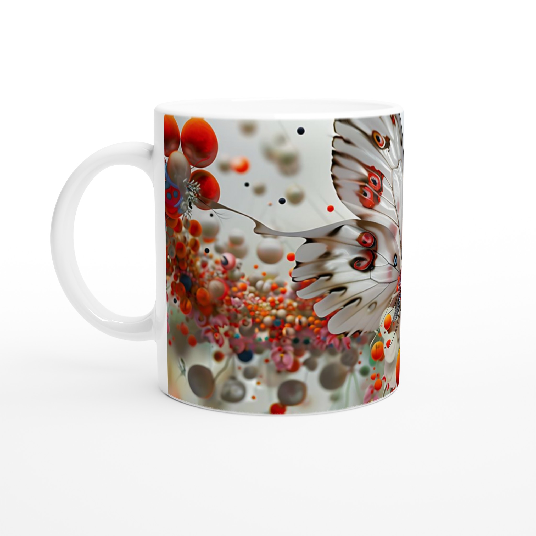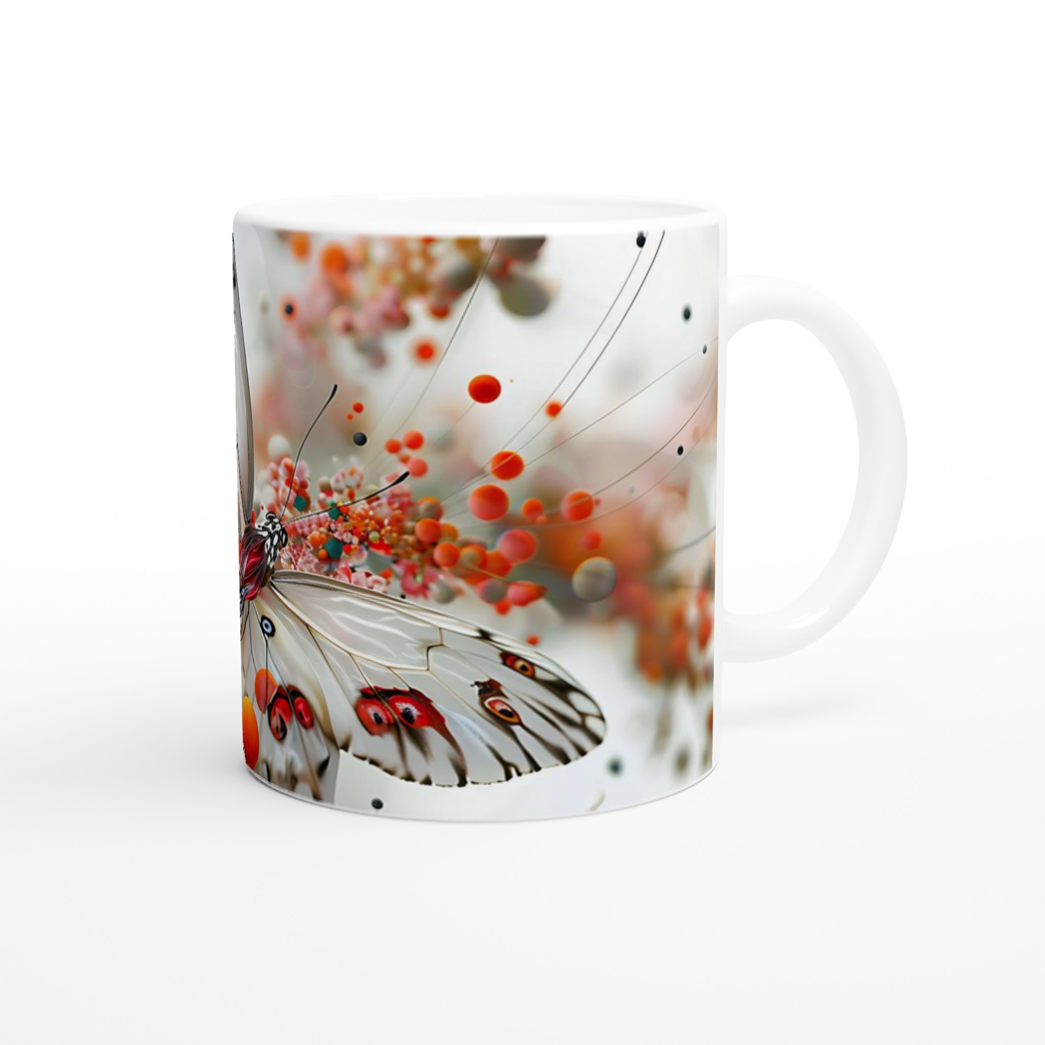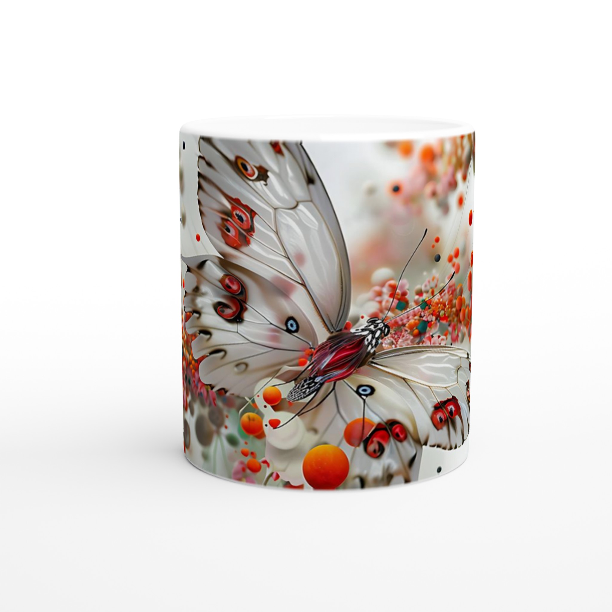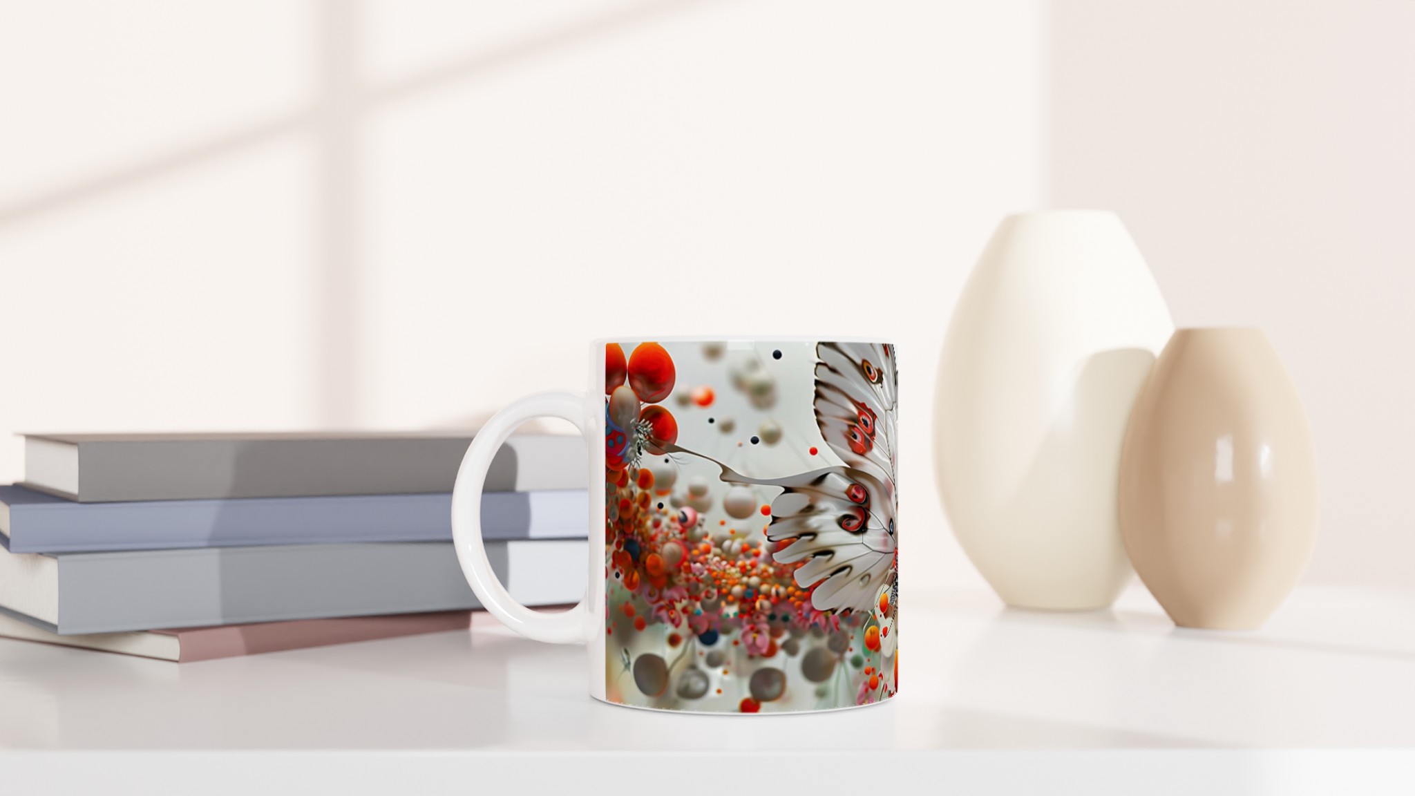 Låt fantasin flöda med denna unika keramiska mugg, prydd med ett abstrakt fjärilsmotiv som fångar ögat med sina livfulla orangea, röda och vita toner. Denna mugg blir snabbt en vardagsfavorit, perfekt för morgonkaffet, kvällens varma choklad eller när du bara vill njuta av en kopp te. Den blanka ytan framhäver trycket med klara och levande färger, som håller sig fina även efter många turer i mikron och diskmaskinen.