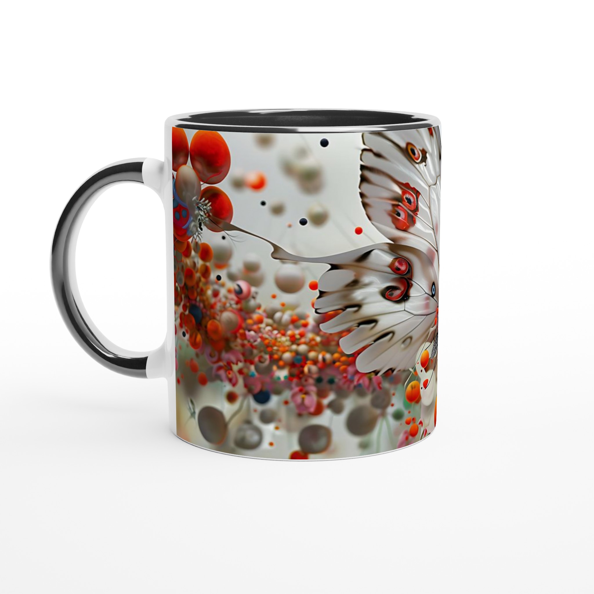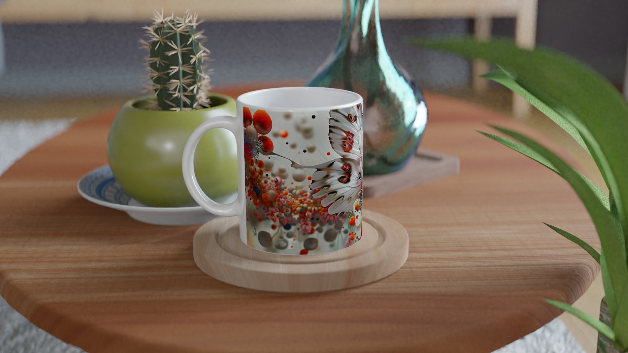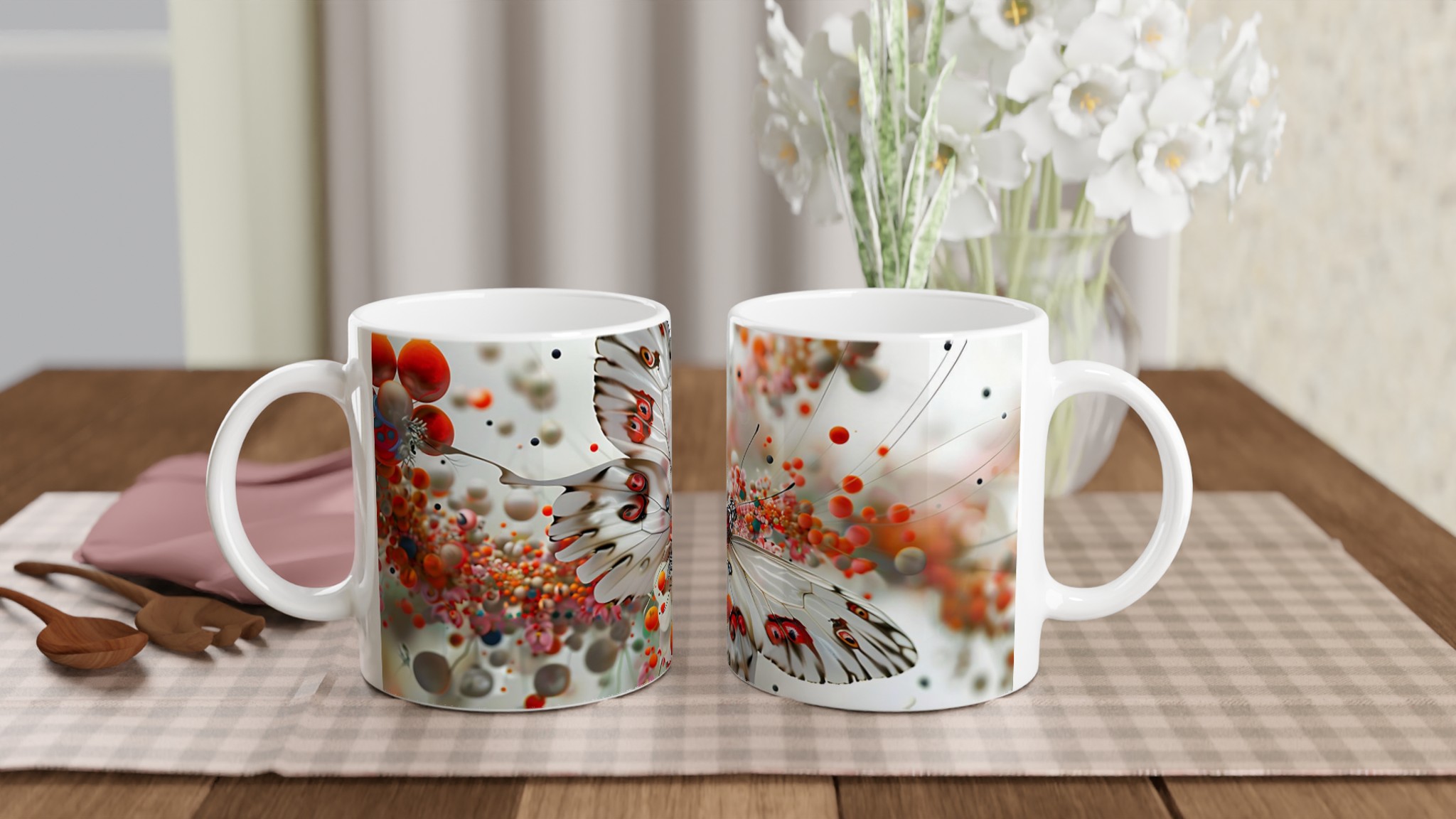 Låt fantasin flöda med denna unika keramiska mugg, prydd med ett abstrakt fjärilsmotiv som fångar ögat med sina livfulla orangea, röda och vita toner. Denna mugg blir snabbt en vardagsfavorit, perfekt för morgonkaffet, kvällens varma choklad eller när du bara vill njuta av en kopp te. Den blanka ytan framhäver trycket med klara och levande färger, som håller sig fina även efter många turer i mikron och diskmaskinen.