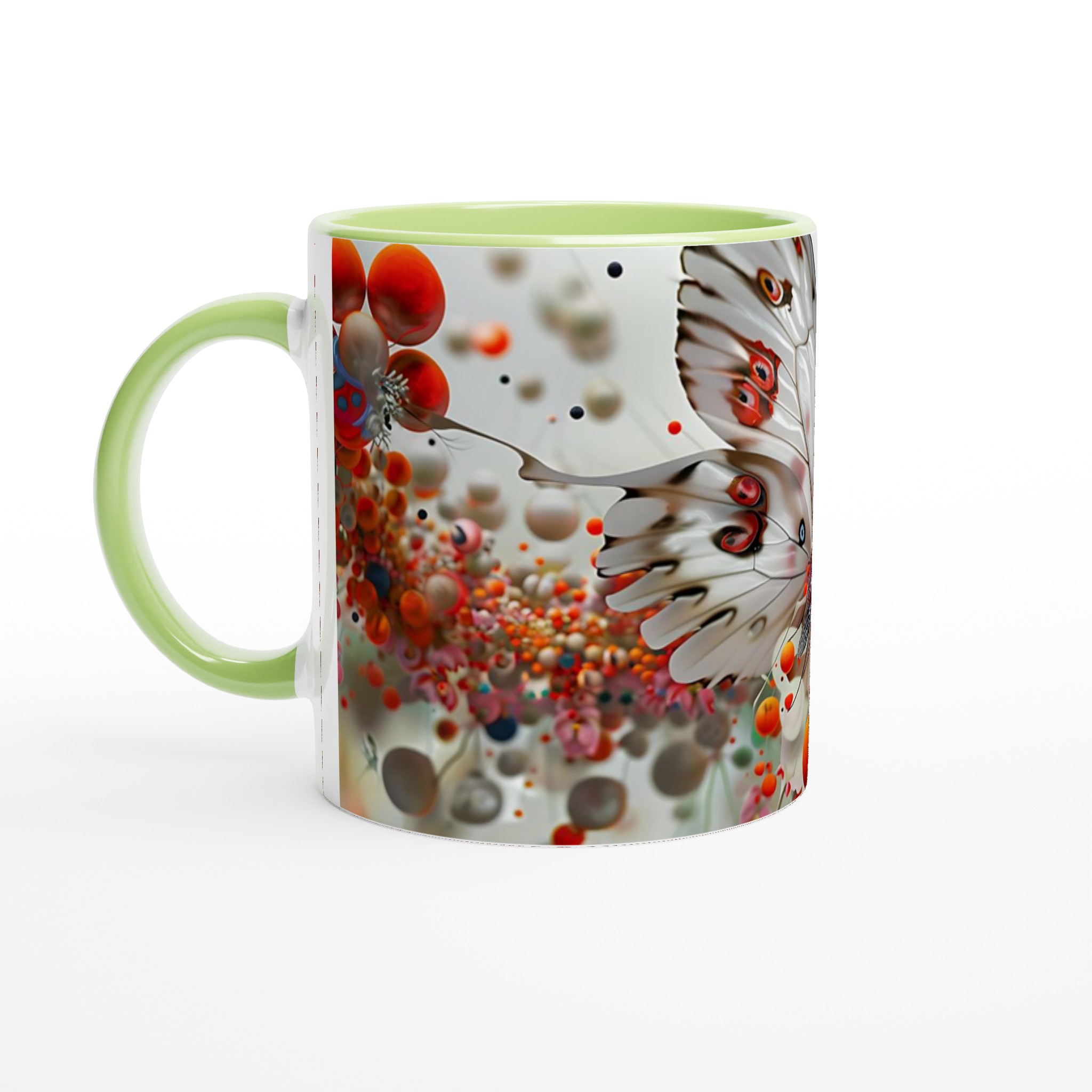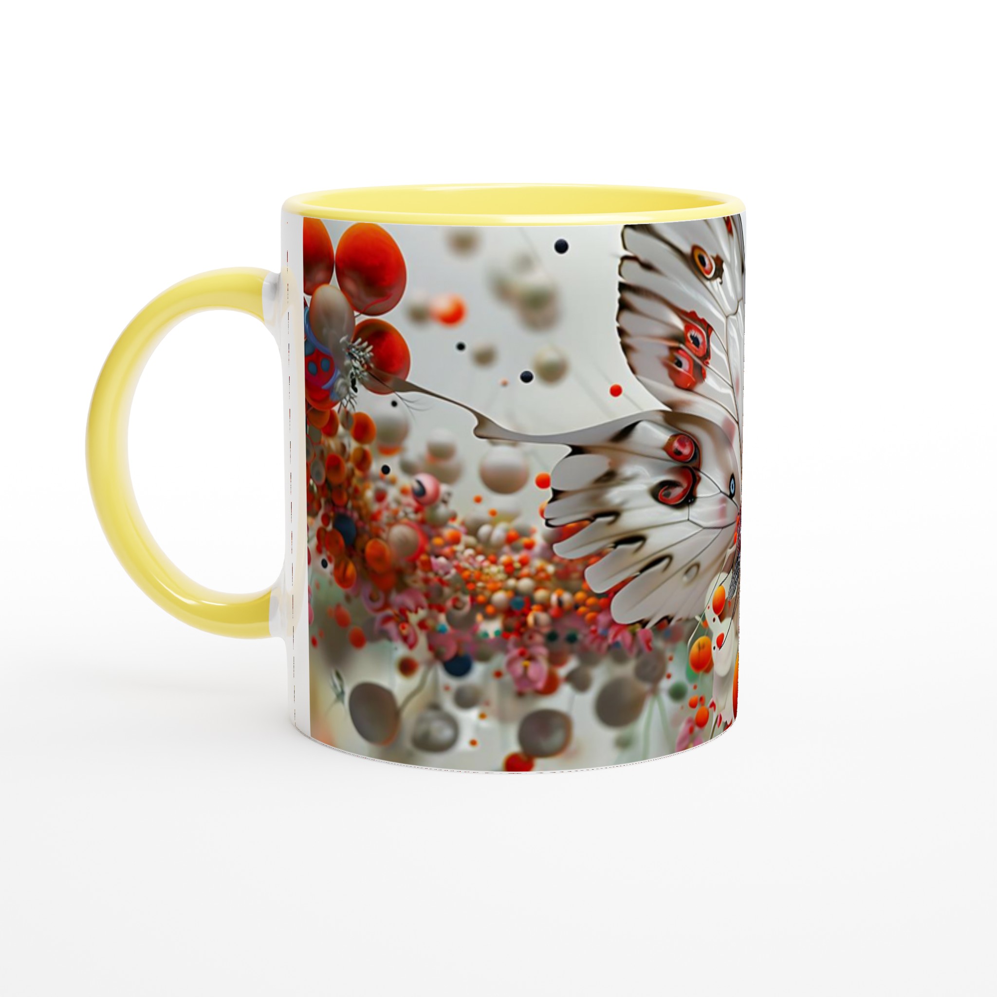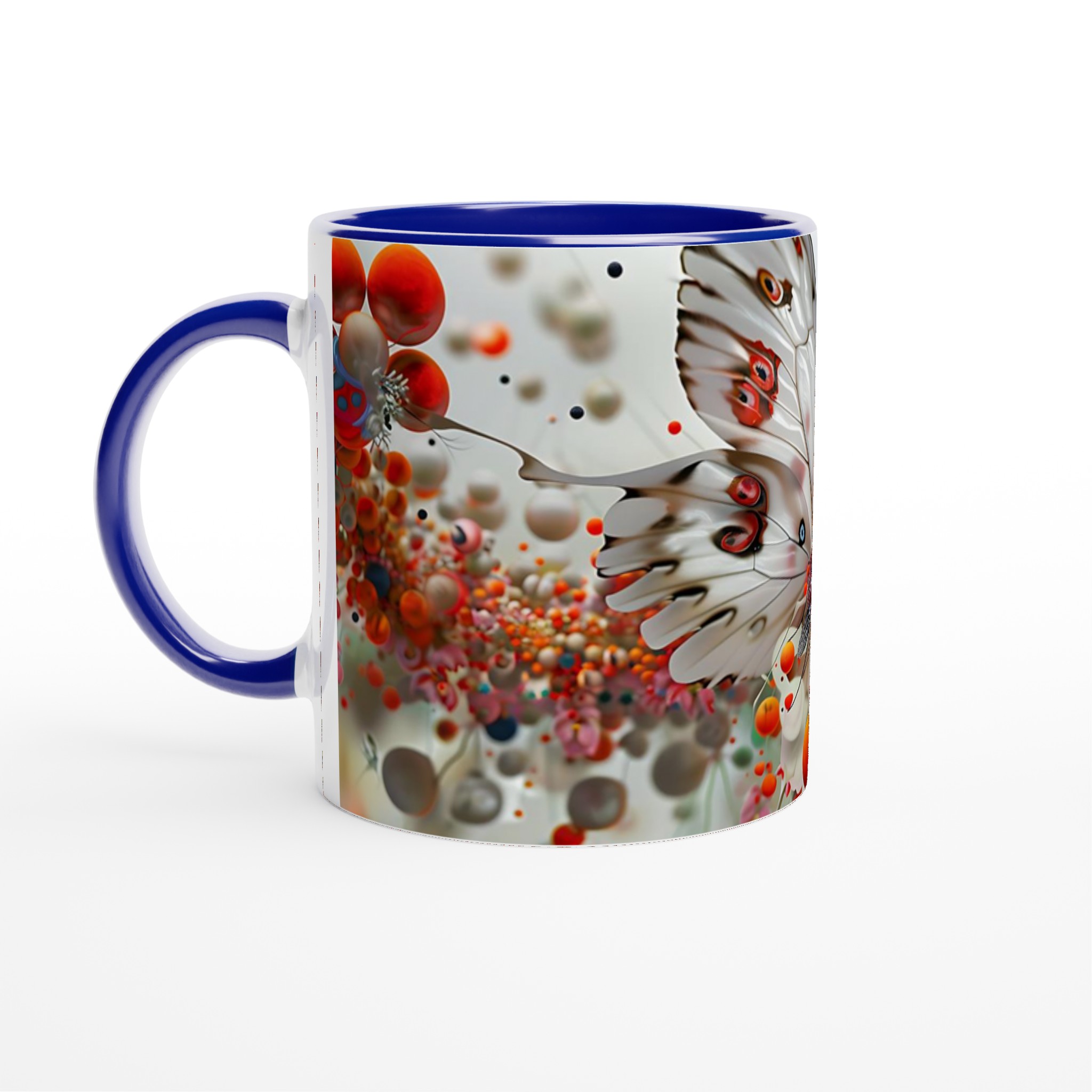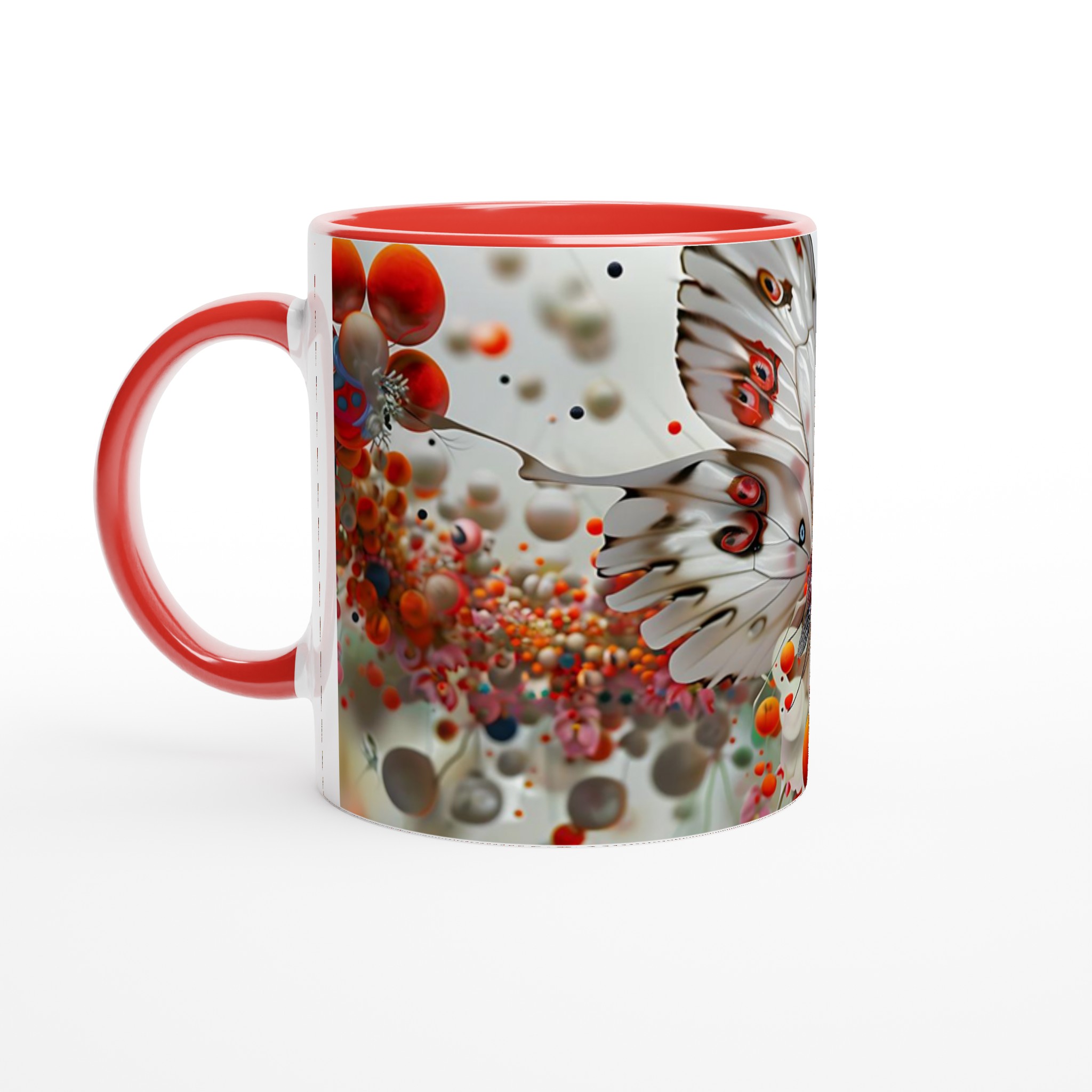 Låt fantasin flöda med denna unika keramiska mugg, prydd med ett abstrakt fjärilsmotiv som fångar ögat med sina livfulla orangea, röda och vita toner. Denna mugg blir snabbt en vardagsfavorit, perfekt för morgonkaffet, kvällens varma choklad eller när du bara vill njuta av en kopp te. Den blanka ytan framhäver trycket med klara och levande färger, som håller sig fina även efter många turer i mikron och diskmaskinen.