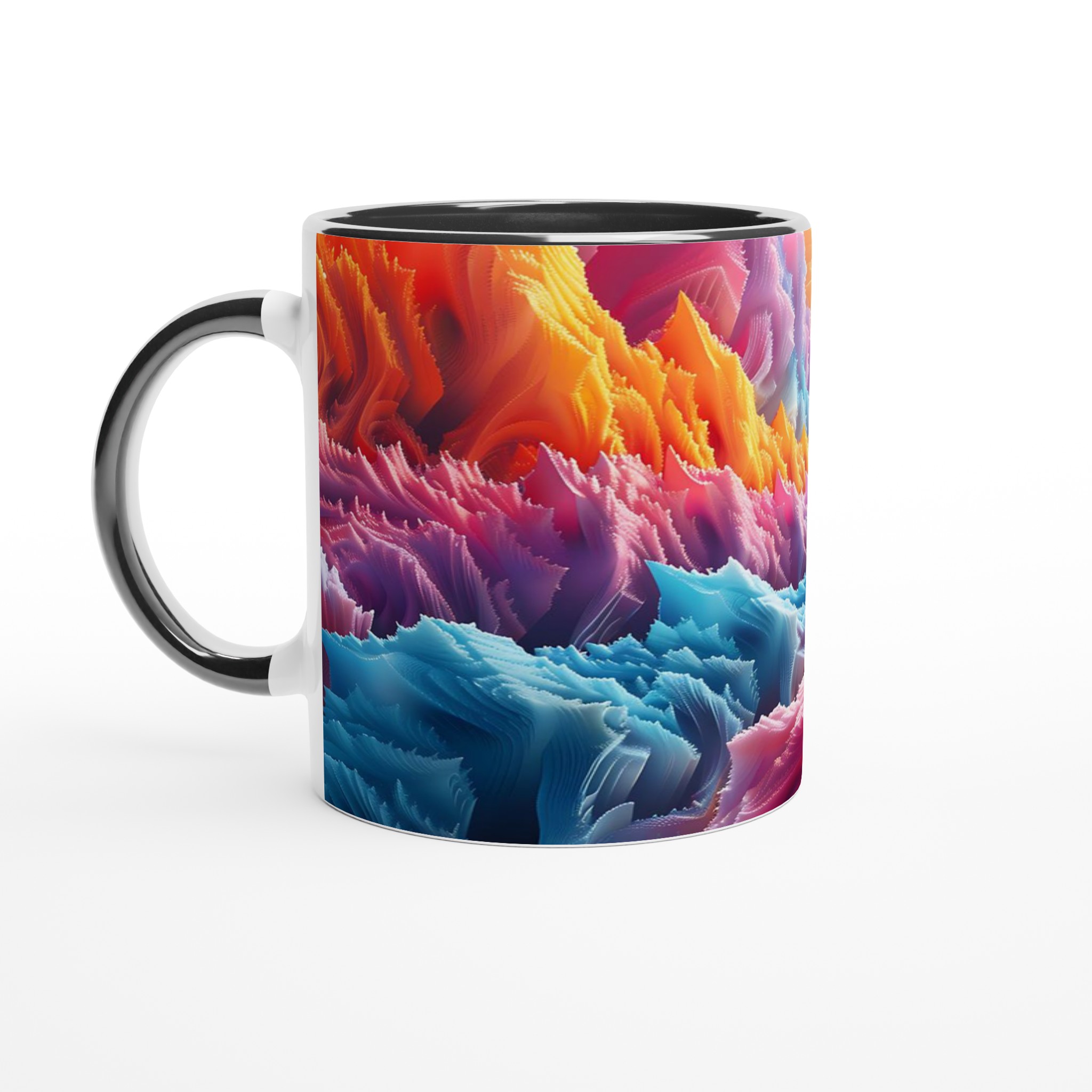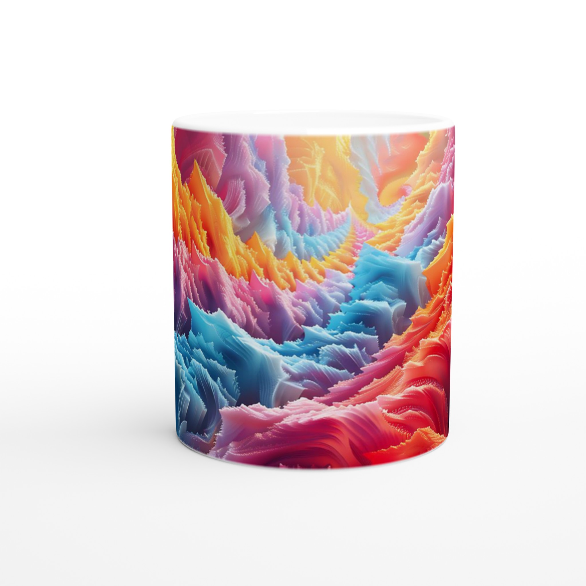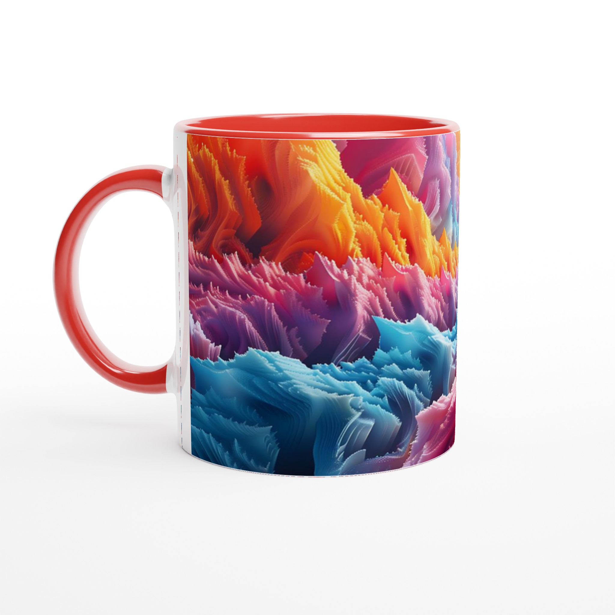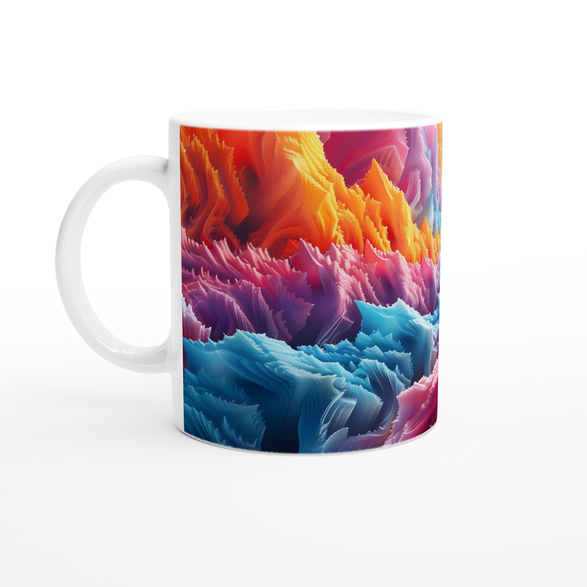 Denna iögonfallande keramiska mugg förvandlar din fikastund till en konstupplevelse. Med ett abstrakt och dynamiskt mönster i regnbågens alla färger – från varma röda och orangea toner till svala blå och lila nyanser – blir den här muggen snabbt en favorit. Perfekt för morgonkaffet, kvällens varma choklad eller när du bara vill njuta av en kopp te. Den blanka ytan gör att trycken framhävs med klara och levande färger, som håller sig fina även efter många turer i mikron och diskmaskinen.