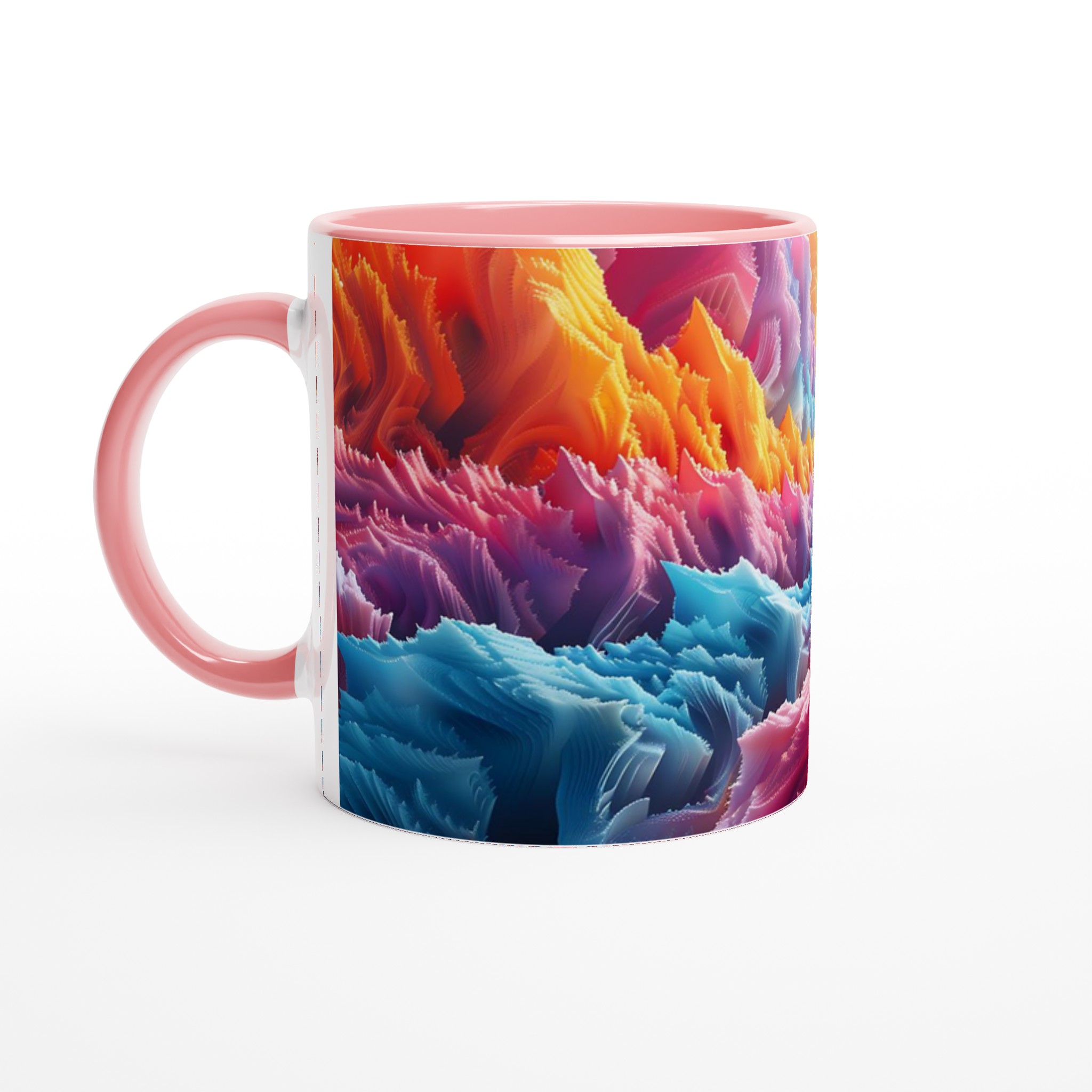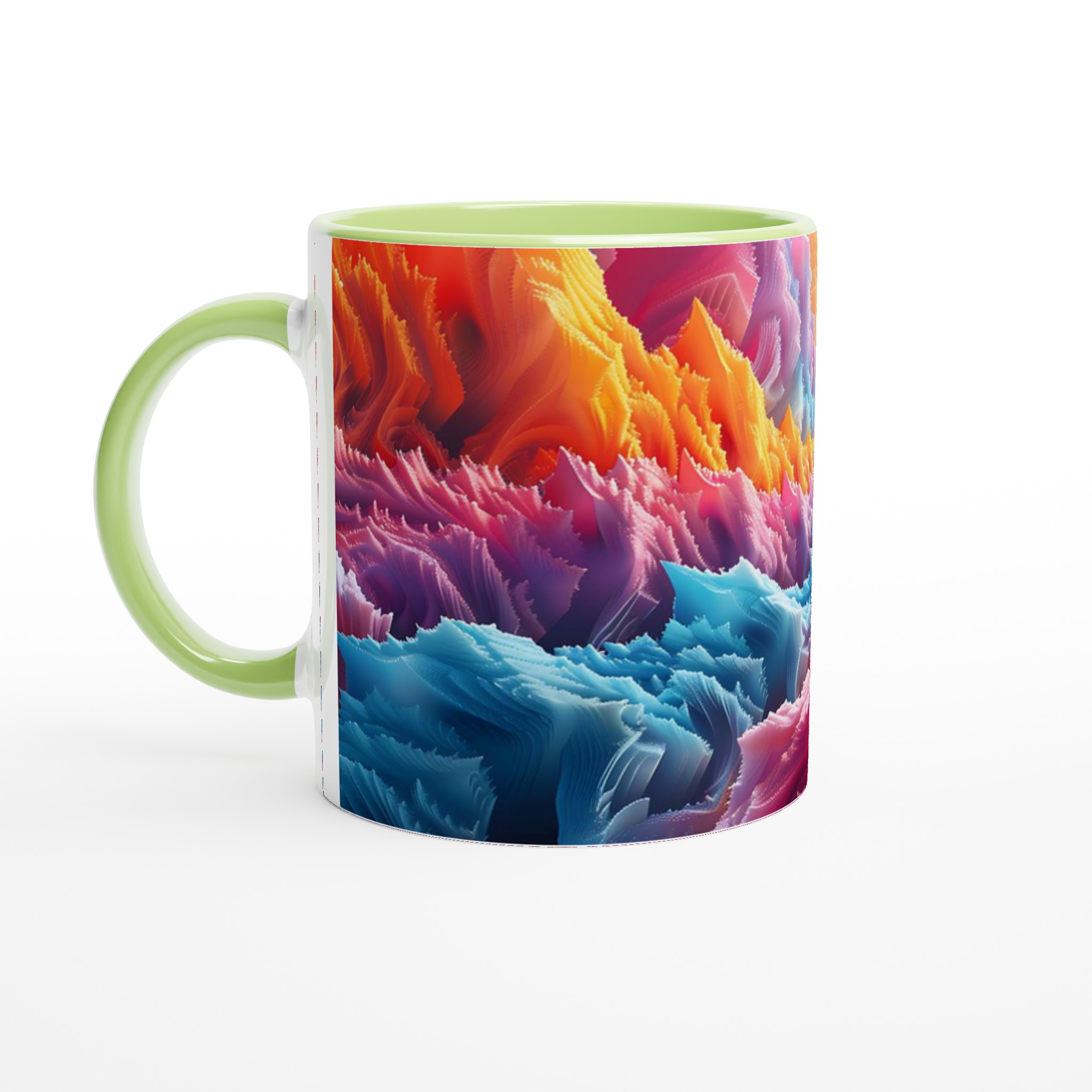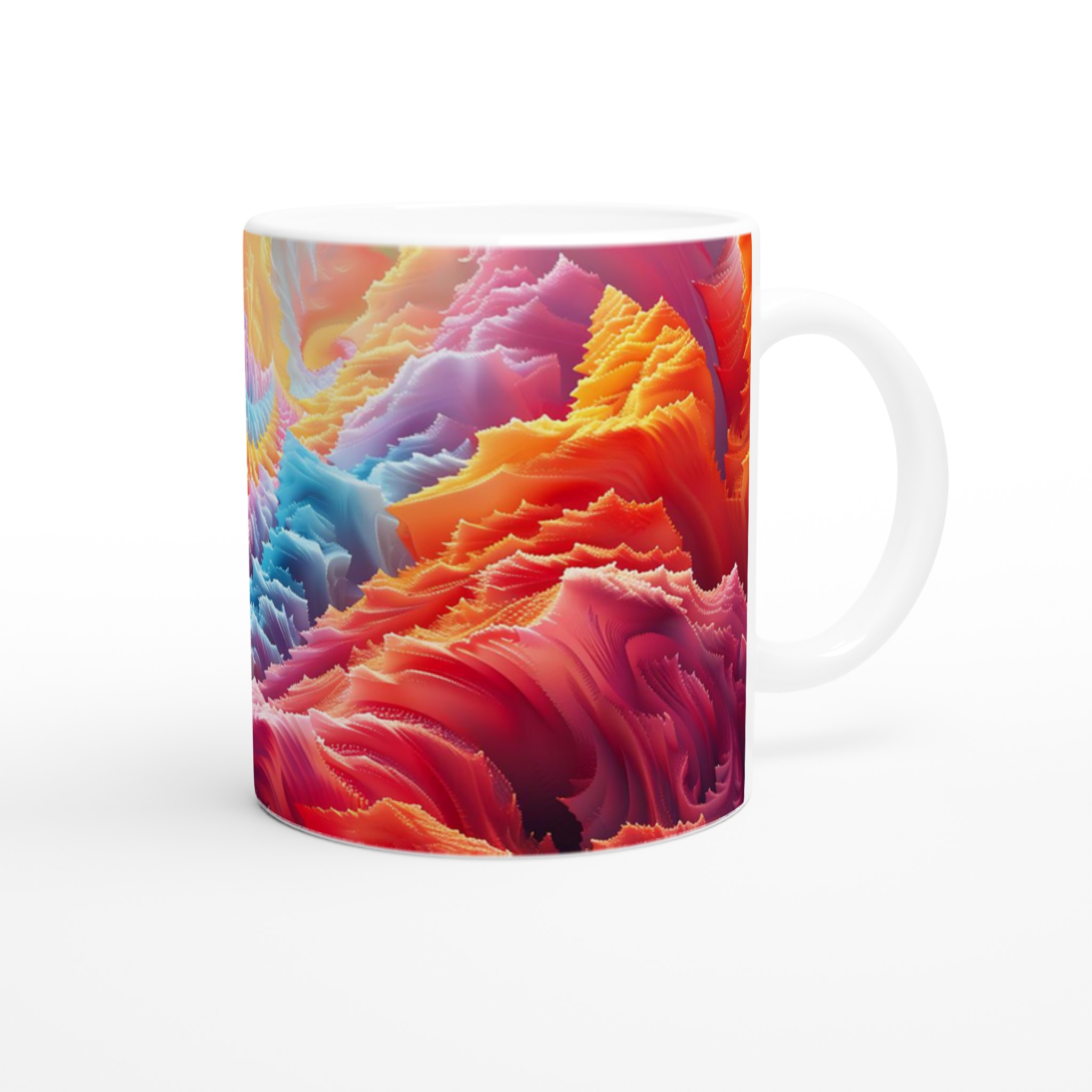 Denna iögonfallande keramiska mugg förvandlar din fikastund till en konstupplevelse. Med ett abstrakt och dynamiskt mönster i regnbågens alla färger – från varma röda och orangea toner till svala blå och lila nyanser – blir den här muggen snabbt en favorit. Perfekt för morgonkaffet, kvällens varma choklad eller när du bara vill njuta av en kopp te. Den blanka ytan gör att trycken framhävs med klara och levande färger, som håller sig fina även efter många turer i mikron och diskmaskinen.