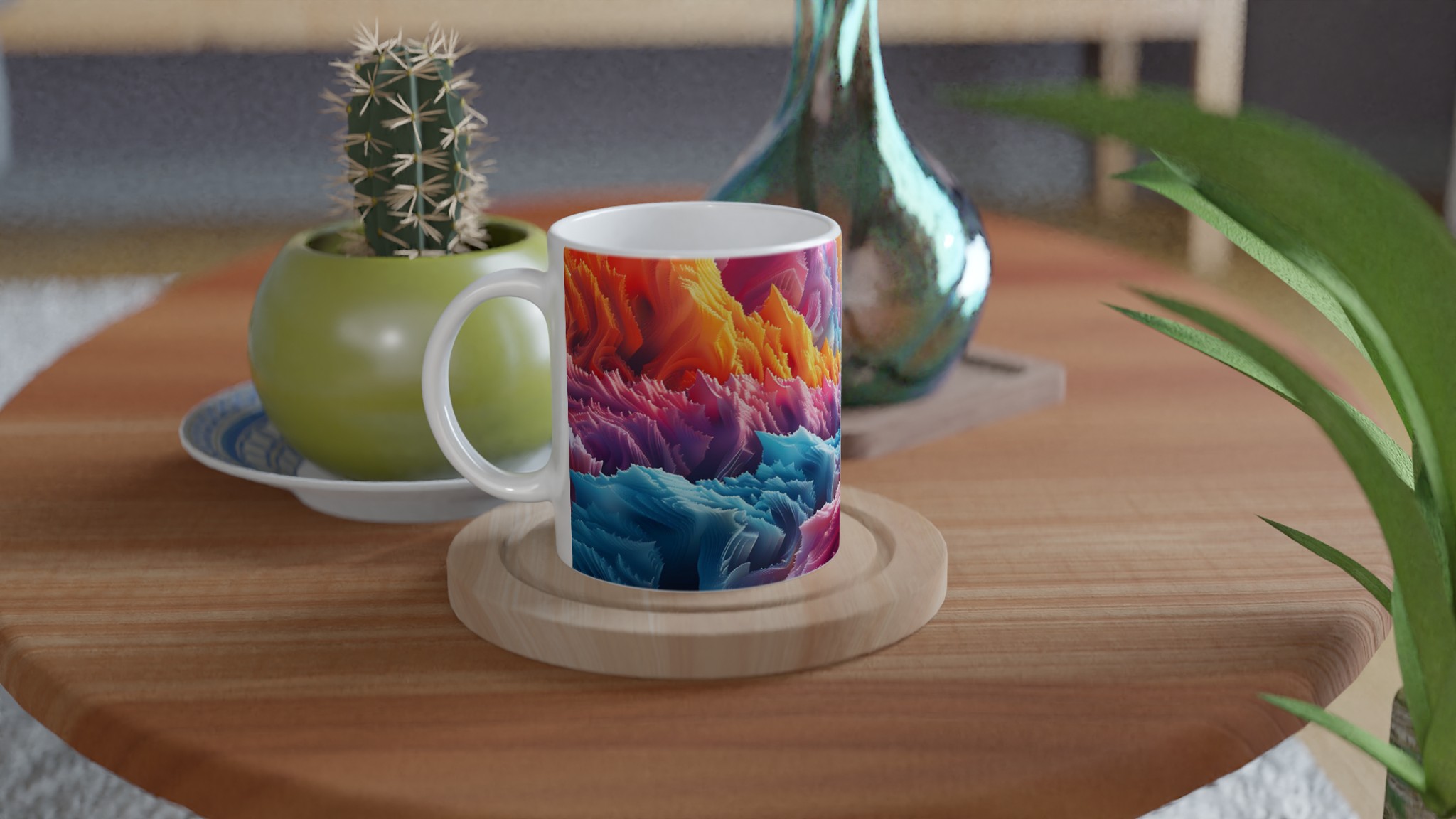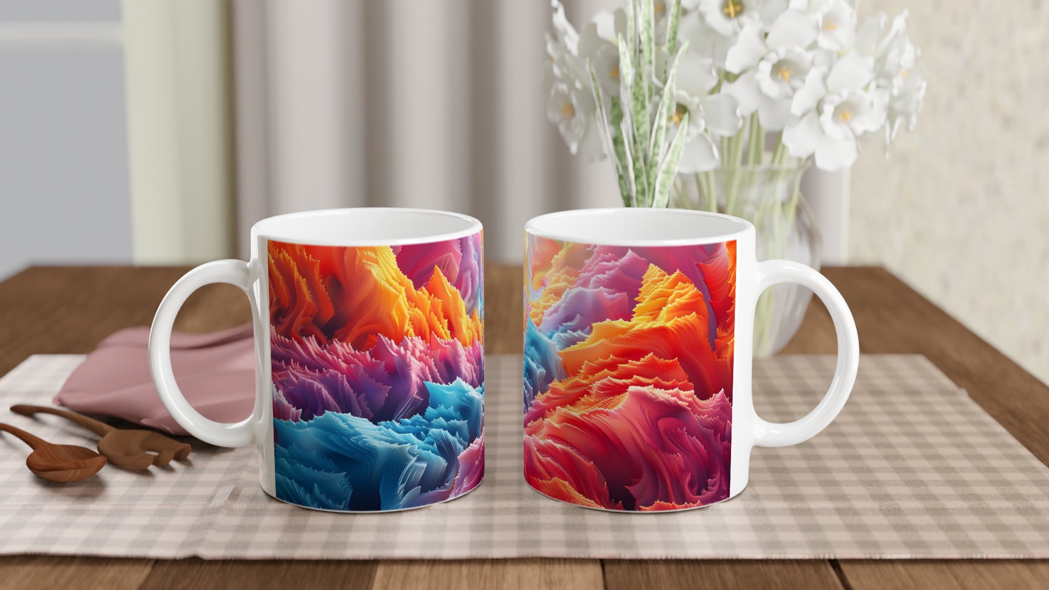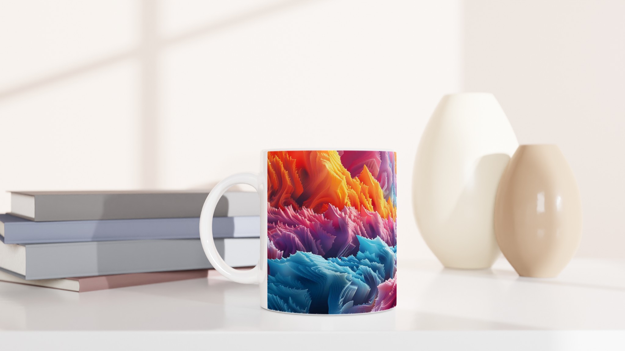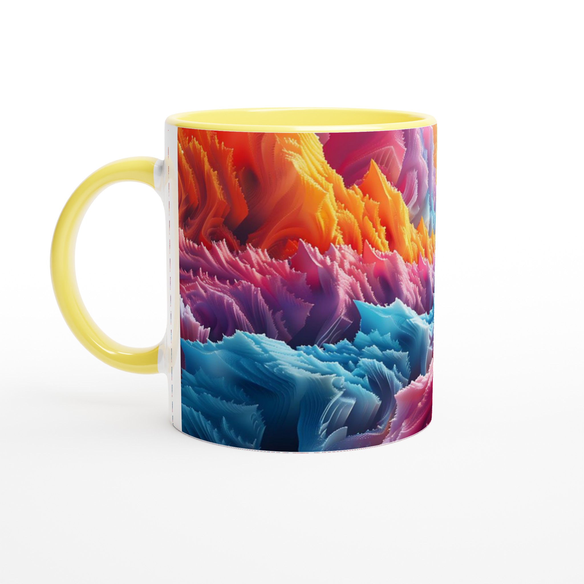 Denna iögonfallande keramiska mugg förvandlar din fikastund till en konstupplevelse. Med ett abstrakt och dynamiskt mönster i regnbågens alla färger – från varma röda och orangea toner till svala blå och lila nyanser – blir den här muggen snabbt en favorit. Perfekt för morgonkaffet, kvällens varma choklad eller när du bara vill njuta av en kopp te. Den blanka ytan gör att trycken framhävs med klara och levande färger, som håller sig fina även efter många turer i mikron och diskmaskinen.