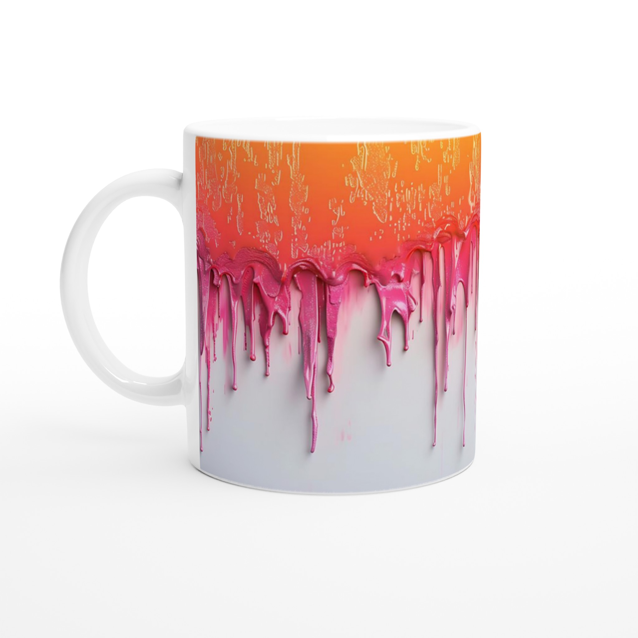 Inspirerad av modern abstrakt konst med neonrosa droppar som flödar över en varm orange gradient, fångar denna mugg uppmärksamheten och lägger till en lekfull men sofistikerad touch till din dryckesupplevelse. Den blanka vita ytan ger ett skarpt och levande tryck som verkligen sticker ut, oavsett om det är en personlig design, ett roligt citat eller en present till någon du tycker om.
