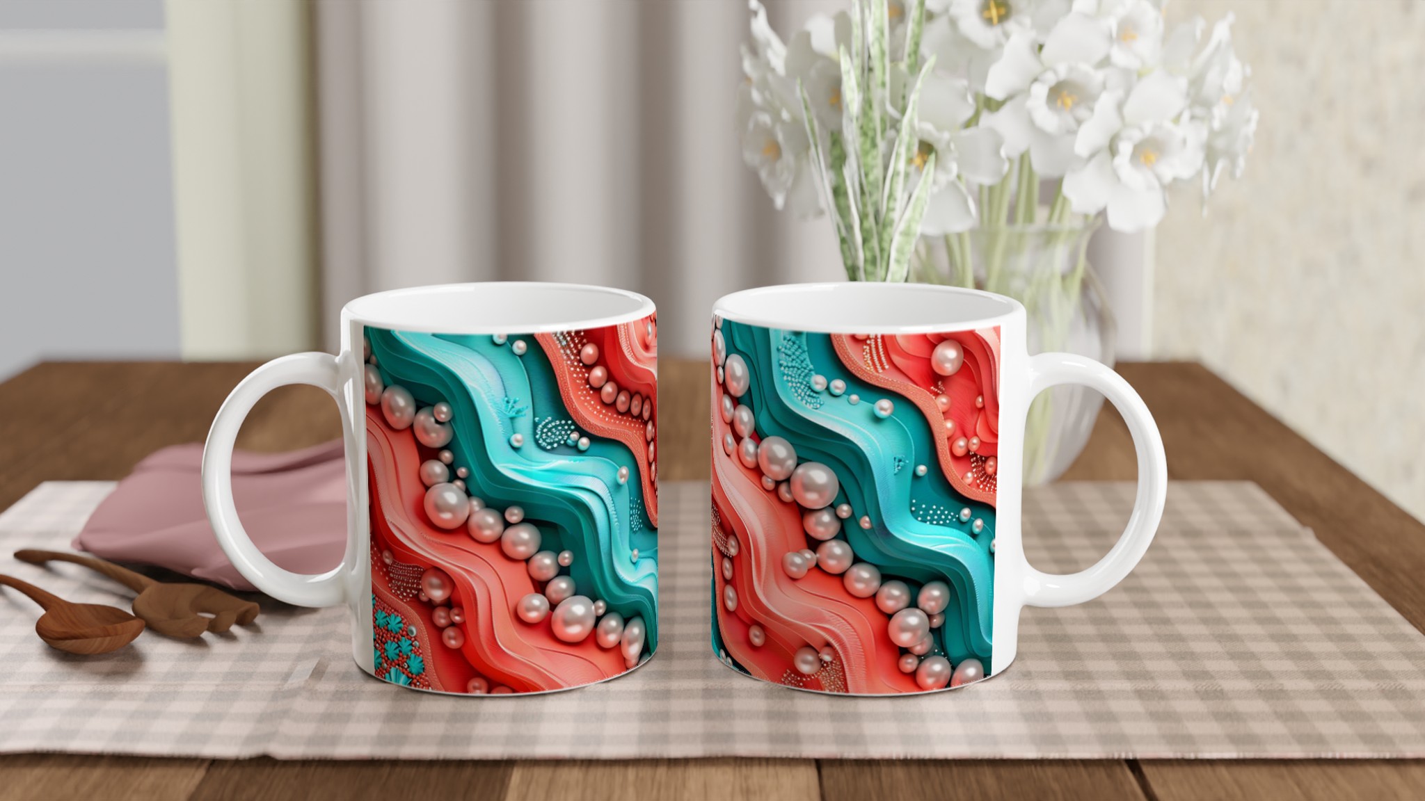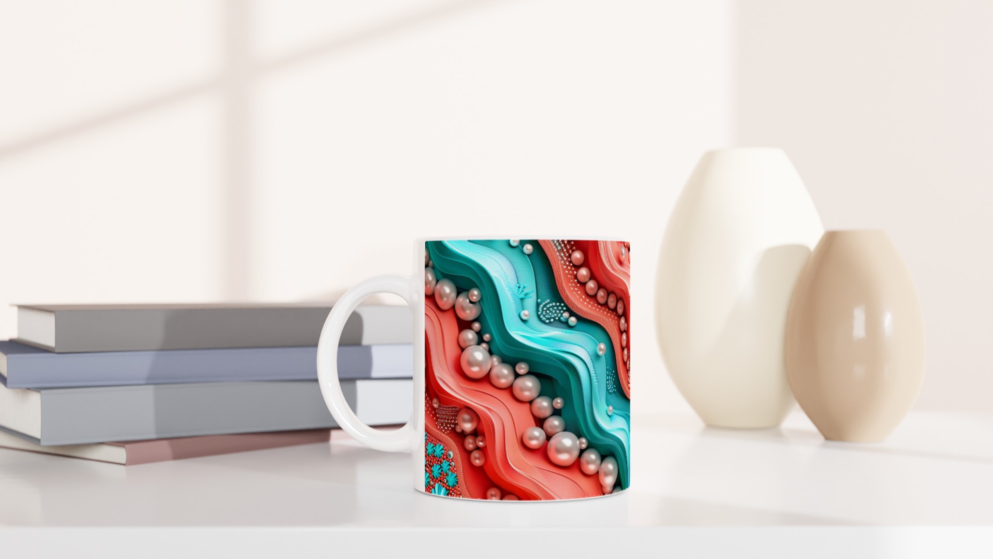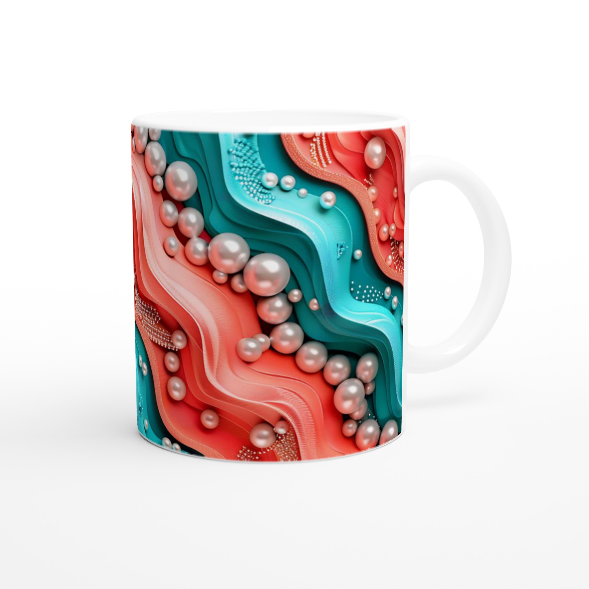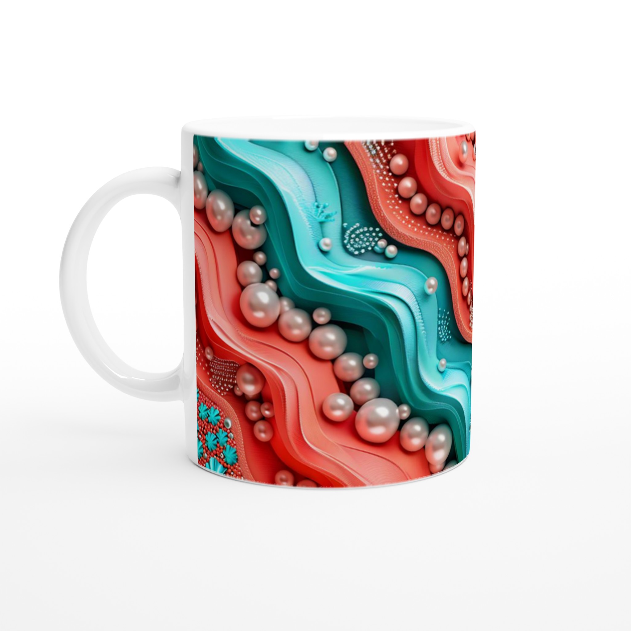 Föreställ dig att du håller en bit av havets mystiska skönhet i din hand varje morgon. Denna unika keramikmugg fångar den organiska och böljande charmen hos ett abstrakt korallrev, med sin livliga palett av turkos och korallröda nyanser, elegant accentuerade av pärlliknande former som glänser mot ytan. Det är inte bara en mugg, utan ett konstverk som förvandlar din fikapaus till en stund av lugn och inspiration, oavsett om du njuter av morgonkaffet, en värmande kopp te eller en härlig varm choklad.
