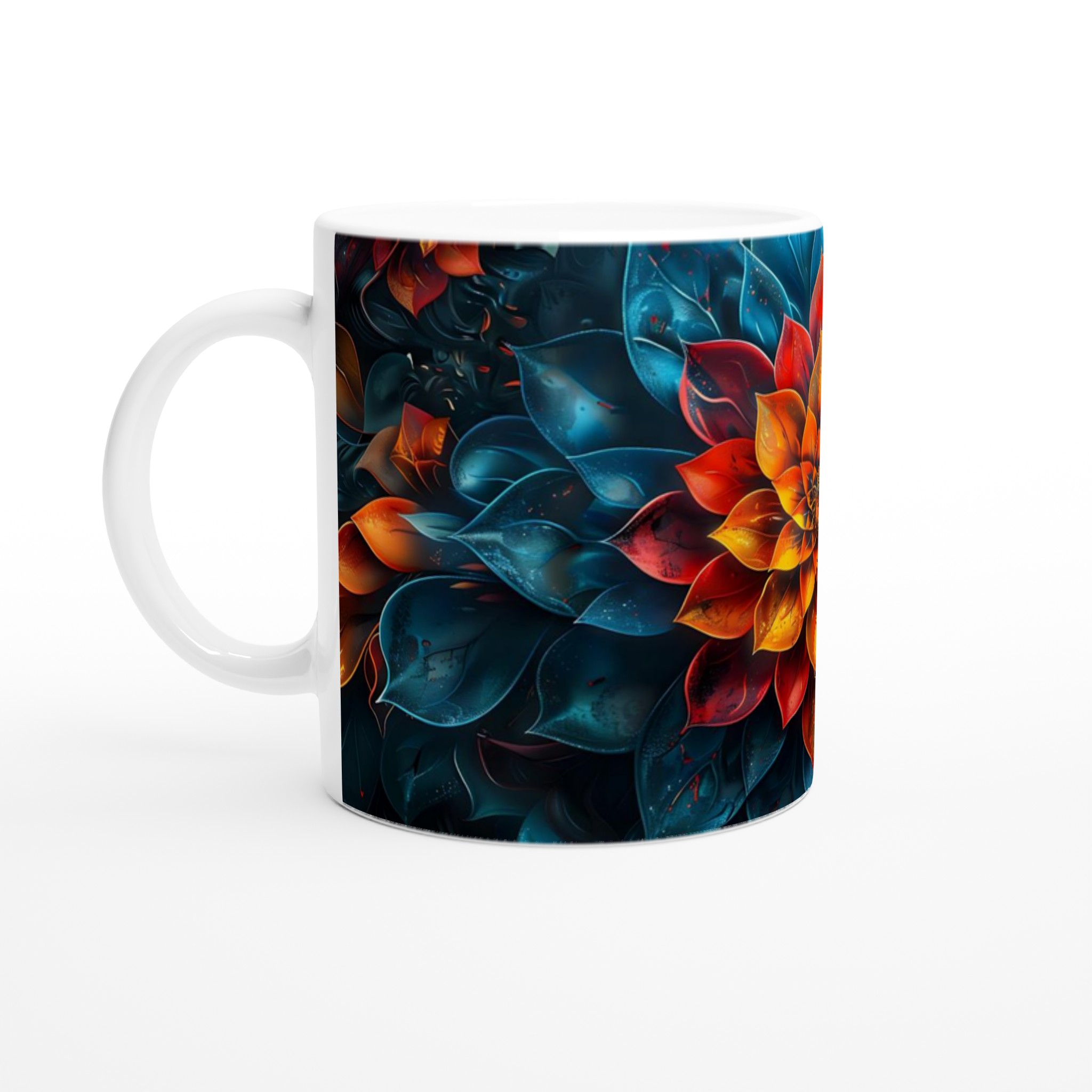 Vakna upp till en explosion av färg med denna abstrakta mandala-mugg, inspirerad av den dramatiska skönheten hos eldiga toner och djupa vattenblå nyanser. Denna stilrena och vackra keramikmugg är perfekt för alla dagens stunder – morgonkaffet, en värmande kopp te eller en härlig varm choklad. Designen, som påminner om en blommas intrikata kronblad i levande rött, orange och guld mot en mystisk turkos och djupblå bakgrund, förvandlar varje sipp till en konstnärlig upplevelse.