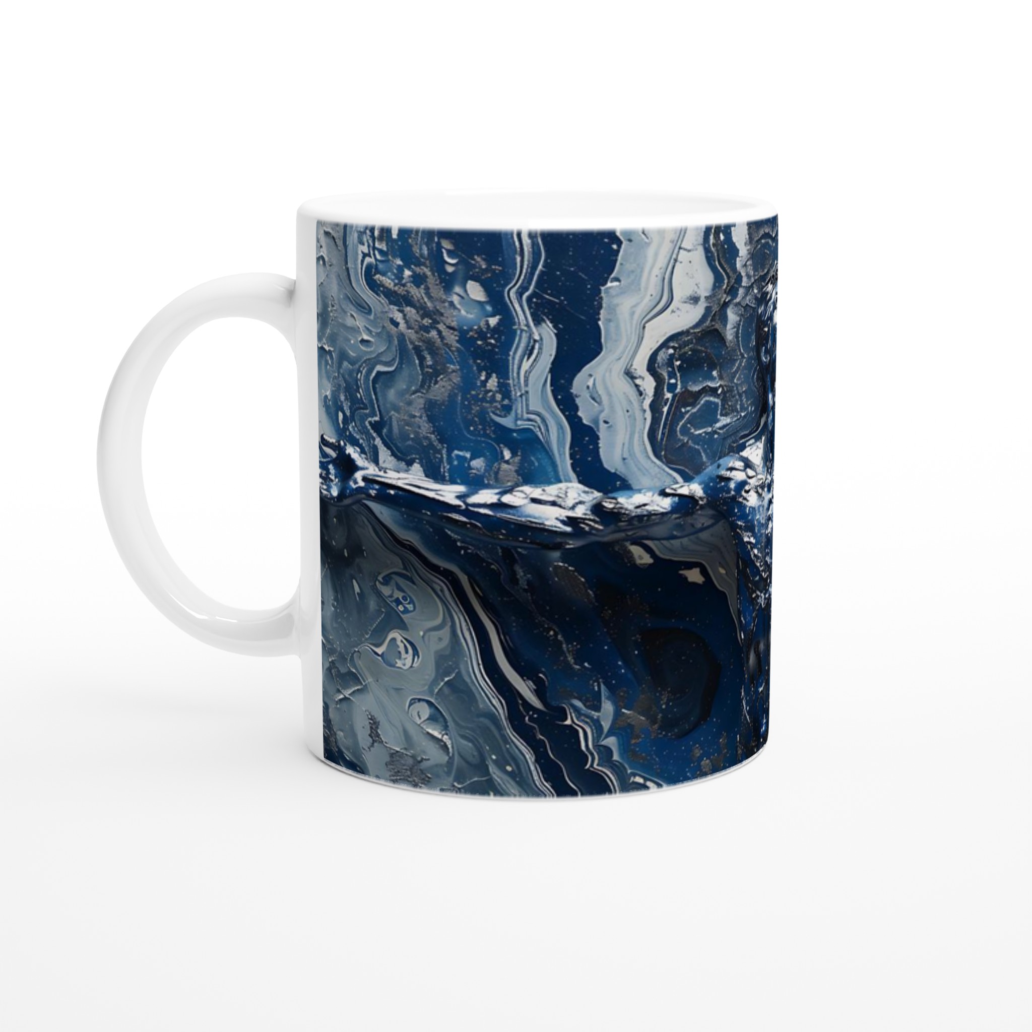 Låt dig svepas med av den hypnotiska skönheten hos vår abstrakta marblingdesign, inspirerad av virvlande mörkblå och silvernyanser. Denna mugg är inte bara en behållare för din favoritdryck, utan ett konstverk som tillför en touch av modern elegans till din dag. Varje virvel och nyans fångar ögat och skapar en känsla av lugn och dynamik.