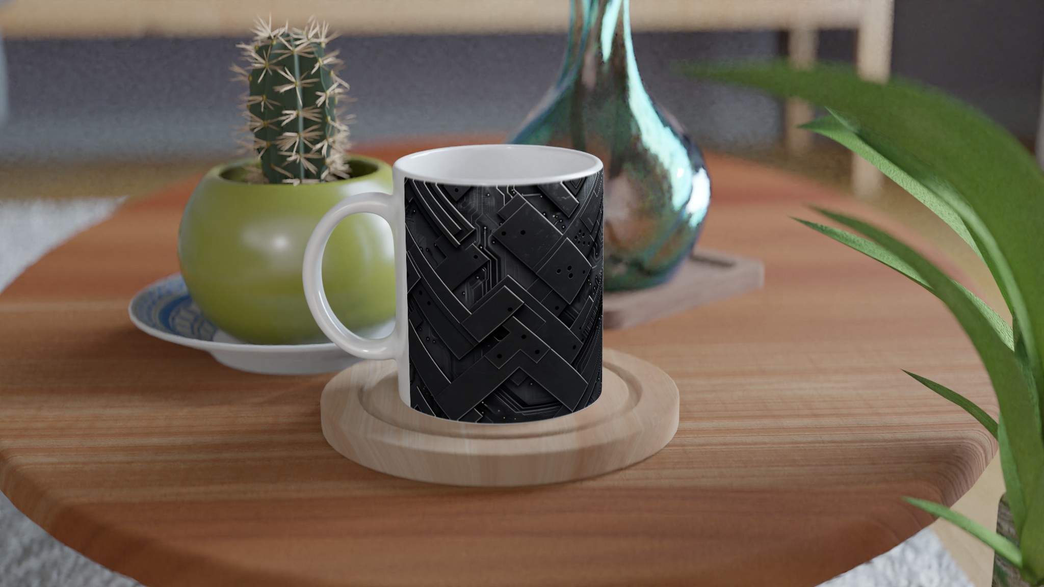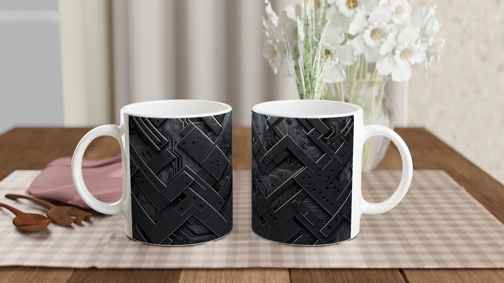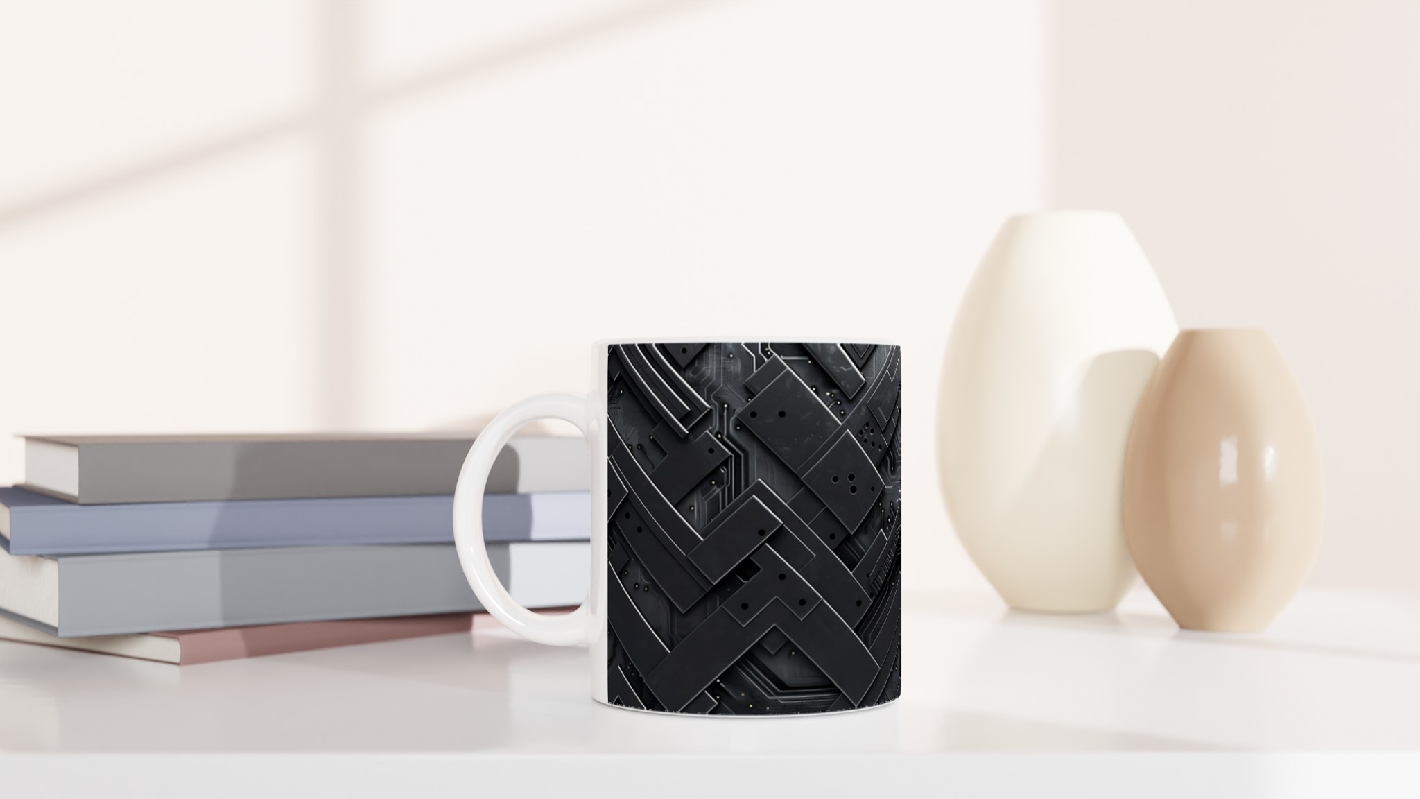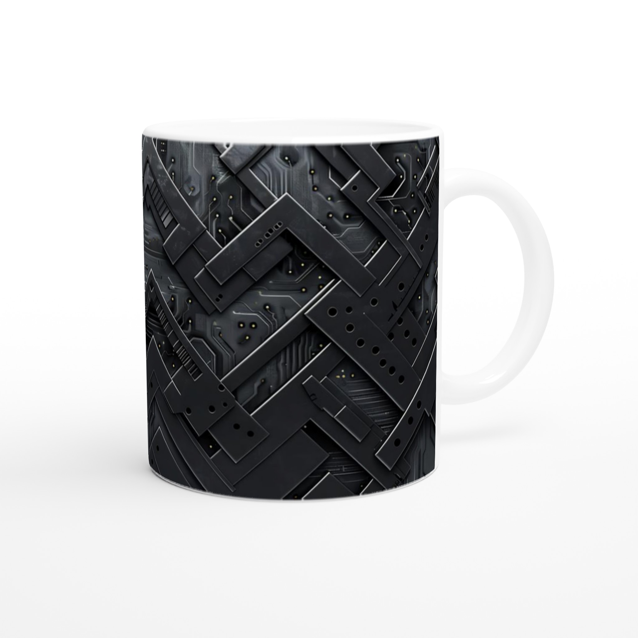 Lyft din vardagsrutin med vår stilrena keramikmugg, prydd med en fängslande abstrakt mörk cirkulär design som ger en modern och sofistikerad känsla till varje paus. Denna mugg är perfekt för alla dagens stunder – morgonkaffet, en värmande kopp te eller en härlig varm choklad. Den blanka vita ytan gör att trycken framträder klart och färgstarkt, vilket gör muggen till en riktig favorit i vardagen. Tack vare den höga kvaliteten behåller trycket sin lyster även efter många omgångar i både mikrovågsugn och diskmaskin.