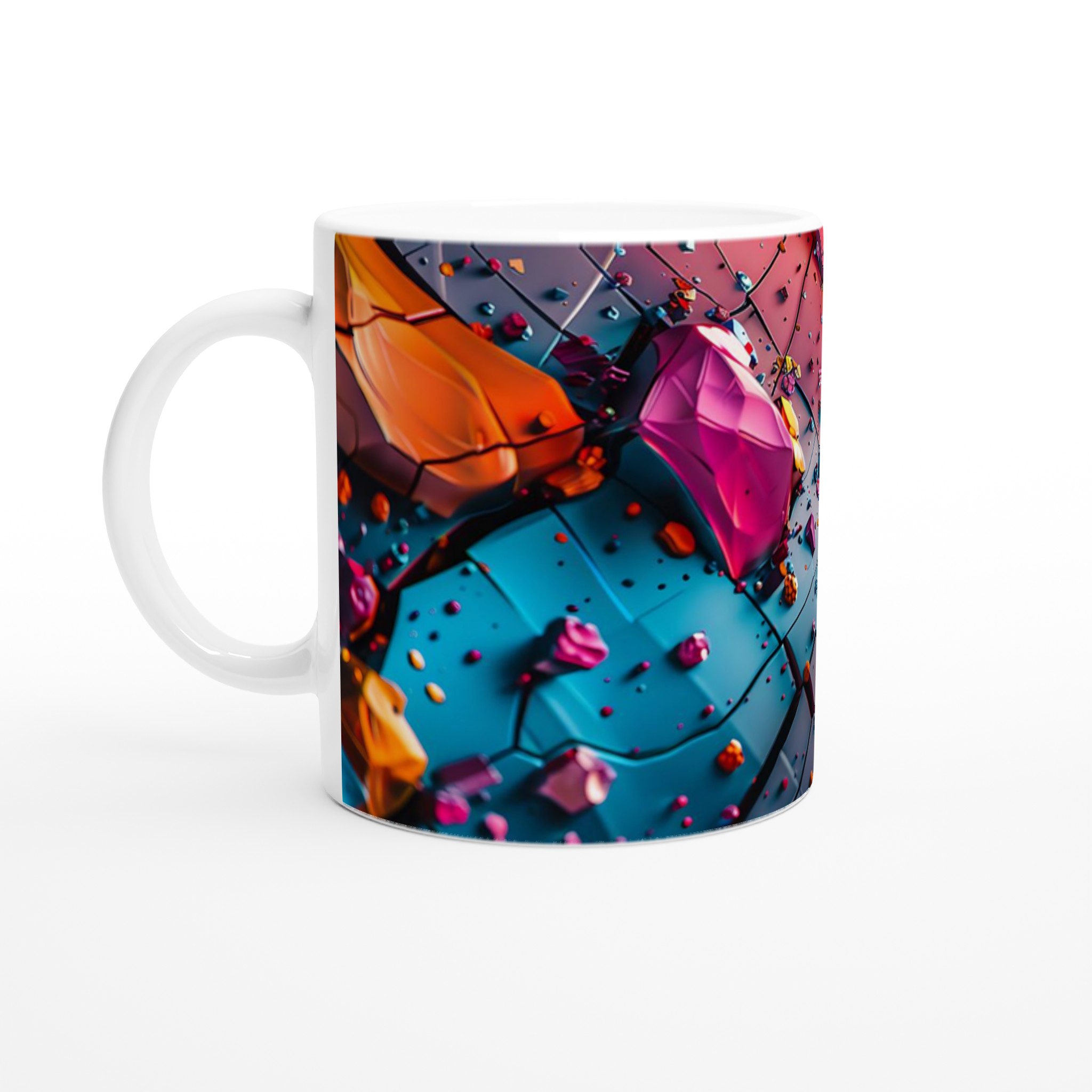 Inspirerad av den dynamiska energin och den rika färgpaletten av en abstrakt mosaik, blir denna mugg en explosion av form och färg för din vardag. De glittrande nyanserna av turkos, orange och fuchsia skapar en känsla av lekfull elegans, perfekt för att kickstarta morgonen eller liva upp eftermiddagsfikat. Den blanka vita ytan ger ett skarpt och levande tryck som verkligen sticker ut, oavsett om det är en personlig design, ett roligt citat eller en present till någon du tycker om.