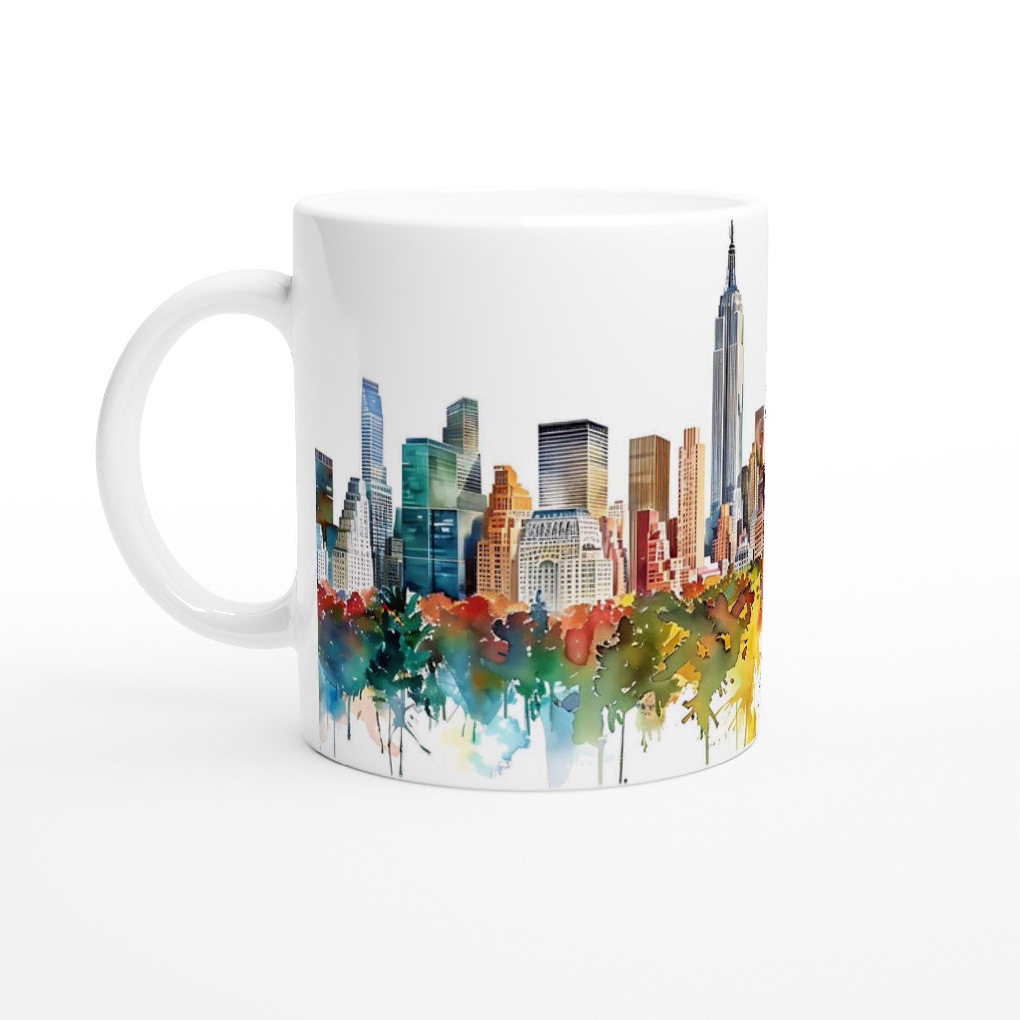 Lyft varje kaffestund med vår premium keramikmugg – stilren, hållbar och skapad för att låta ditt motiv glänsa. Denna mugg förvandlar din dryckesupplevelse med en färgstark akvarell-tolkning av New York Citys ikoniska skyline, smältande ner i en levande explosion av gröna, gula och röda toner. Den unika designen ger varje morgon en dos av konstnärlig inspiration och stadspuls.