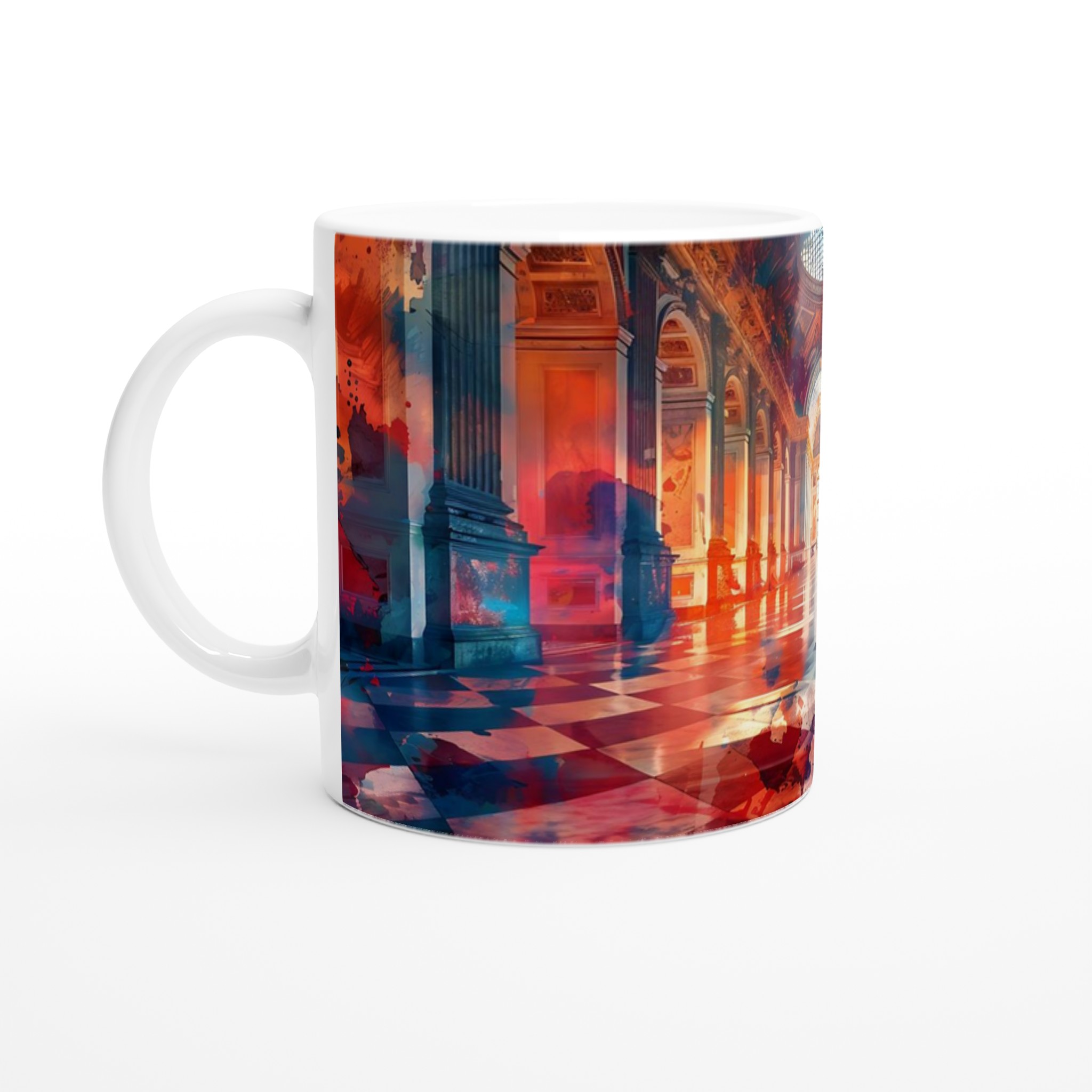 Inspirerad av det majestätiska och drömlika i ett abstrakt palats, bjuder denna mugg in till en värld av färg och fantasi. Den blanka vita ytan ger ett skarpt och levande tryck som verkligen sticker ut, oavsett om det är en personlig design, ett roligt citat eller en present till någon du tycker om. Varje klunk blir en upplevelse, omsluten av en design som talar till själen.