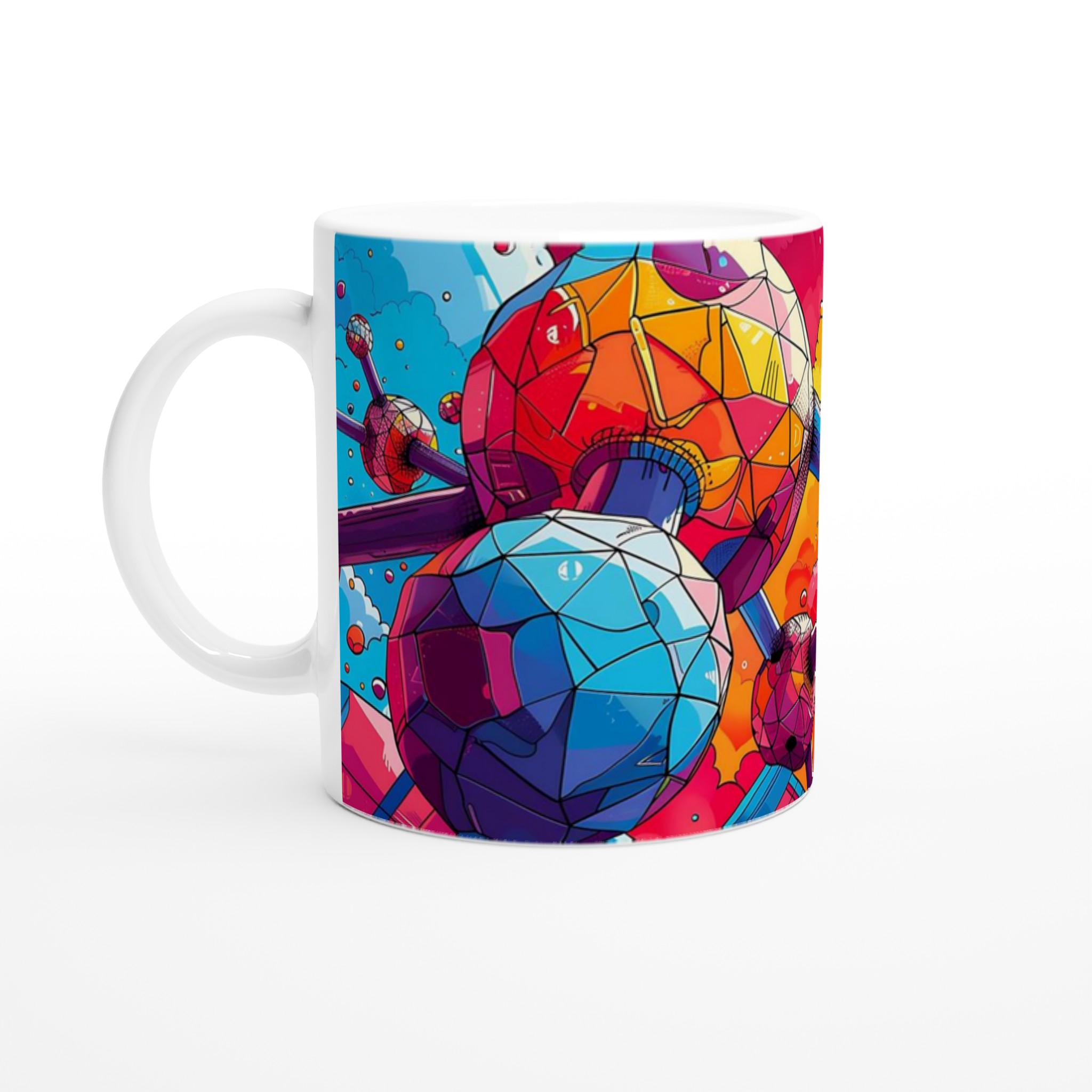 Lyft varje kaffestund med vår premium keramikmugg – stilren, hållbar och skapad för att låta ditt motiv glänsa. Inspirerad av dynamisk pop art och komplexa atomstrukturer, fångar denna mugg energin och kreativiteten hos en modern konstnärs studio. De djärva, geometriska formerna i livfulla nyanser av rött, blått, gult och rosa skapar en fängslande visuell upplevelse som förvandlar din dryckesstund till en konstpaus. Dess blanka vita yta ger ett skarpt och levande tryck som verkligen sticker ut, oavsett om det är en personlig design, ett roligt citat eller en present till någon du tycker om.
