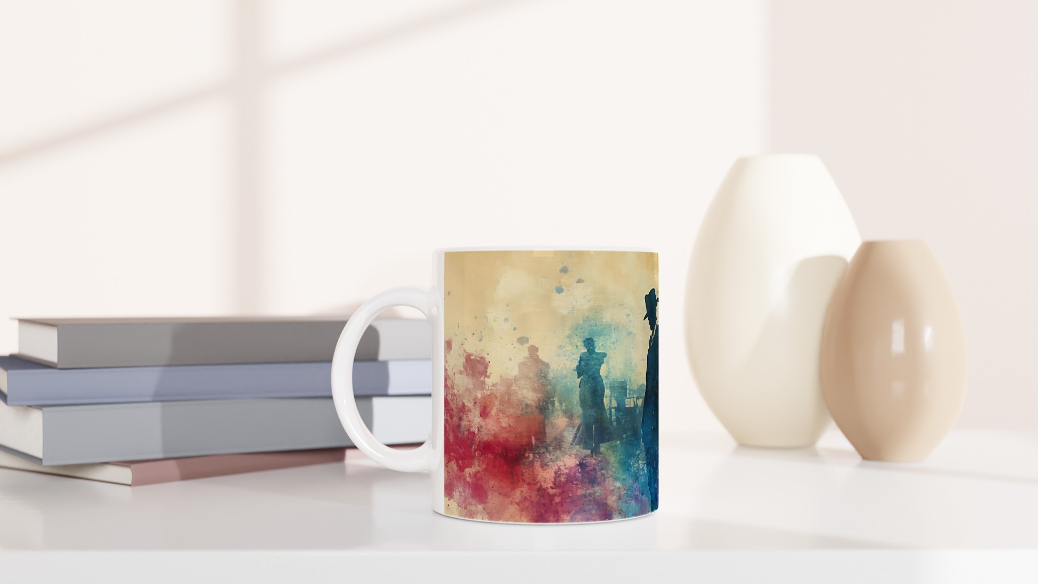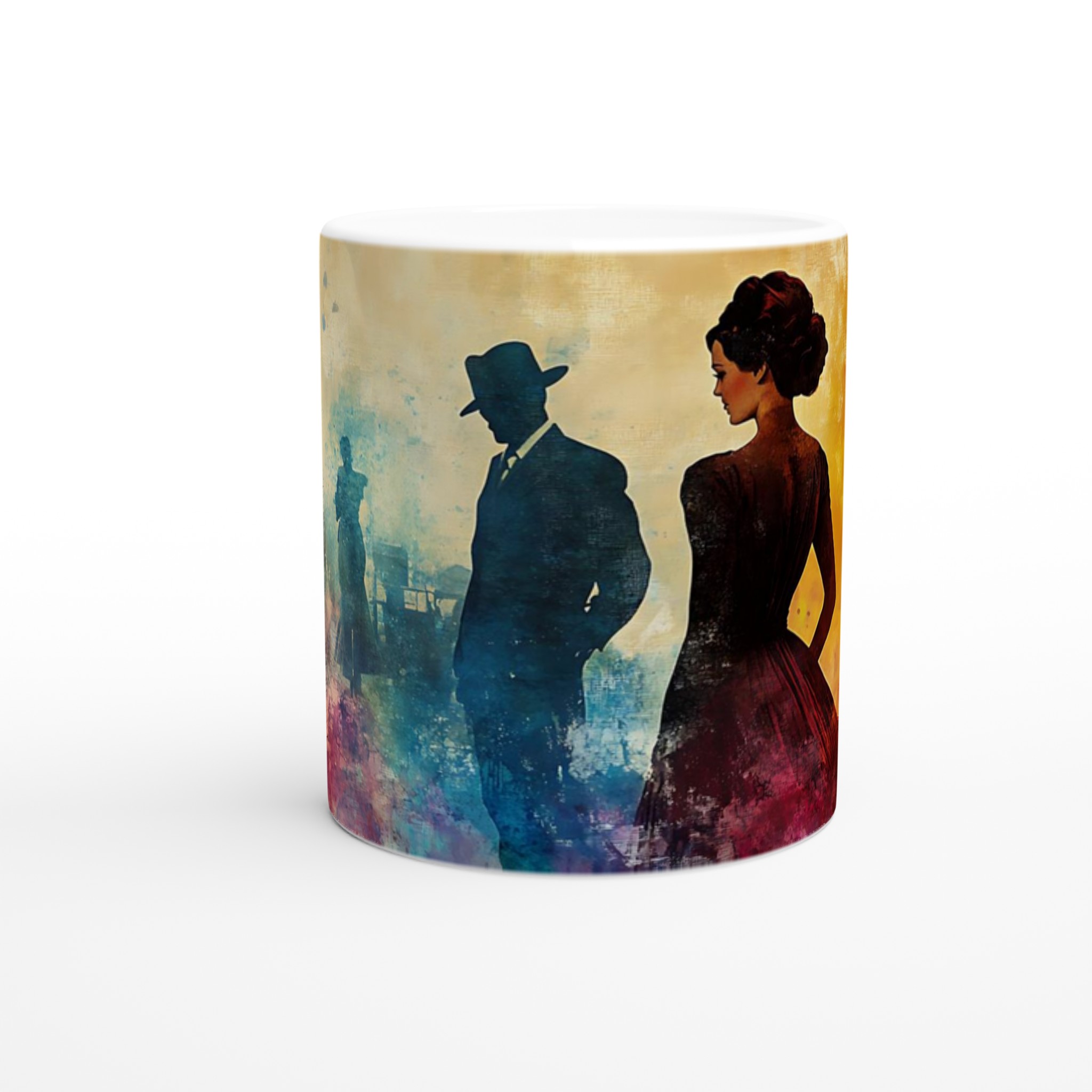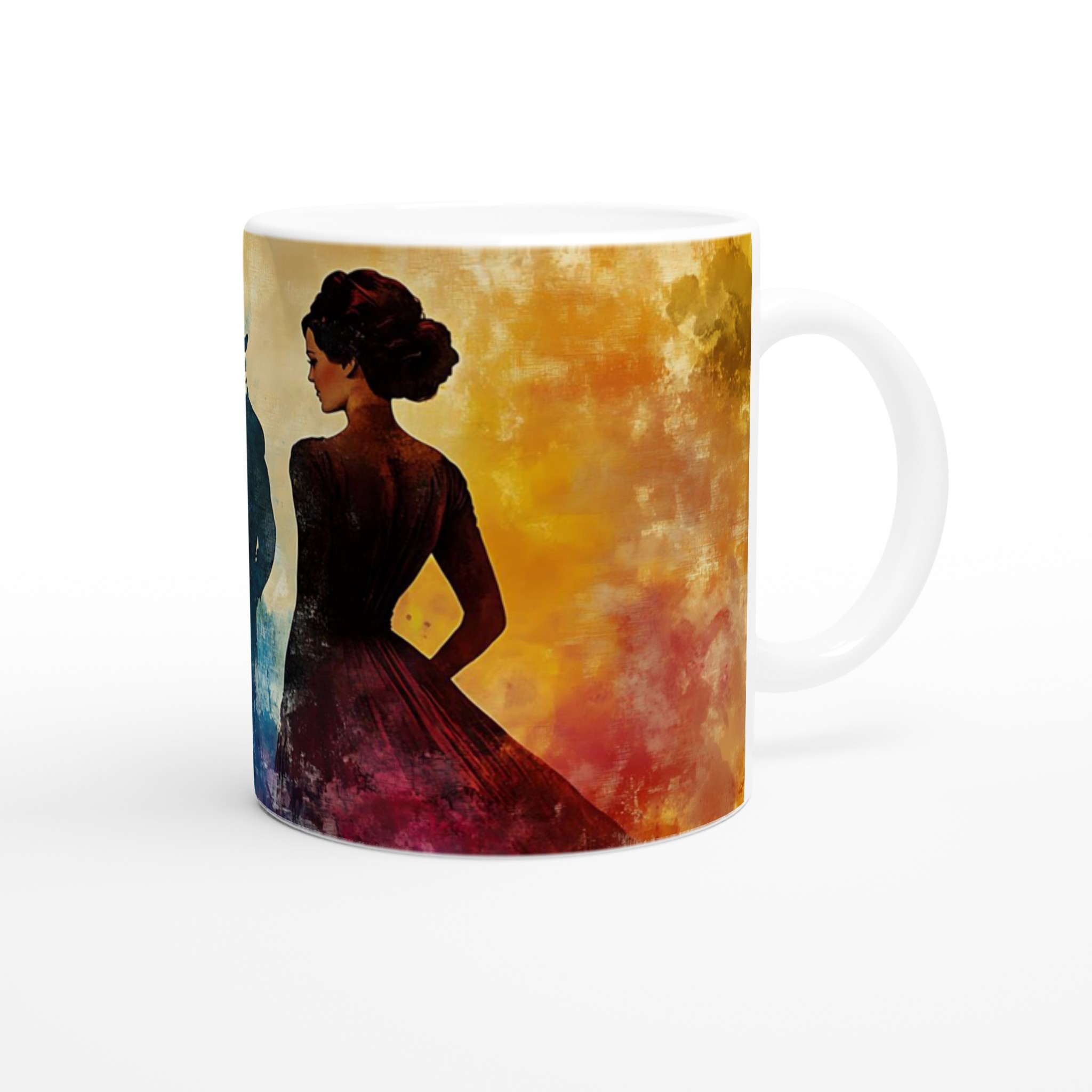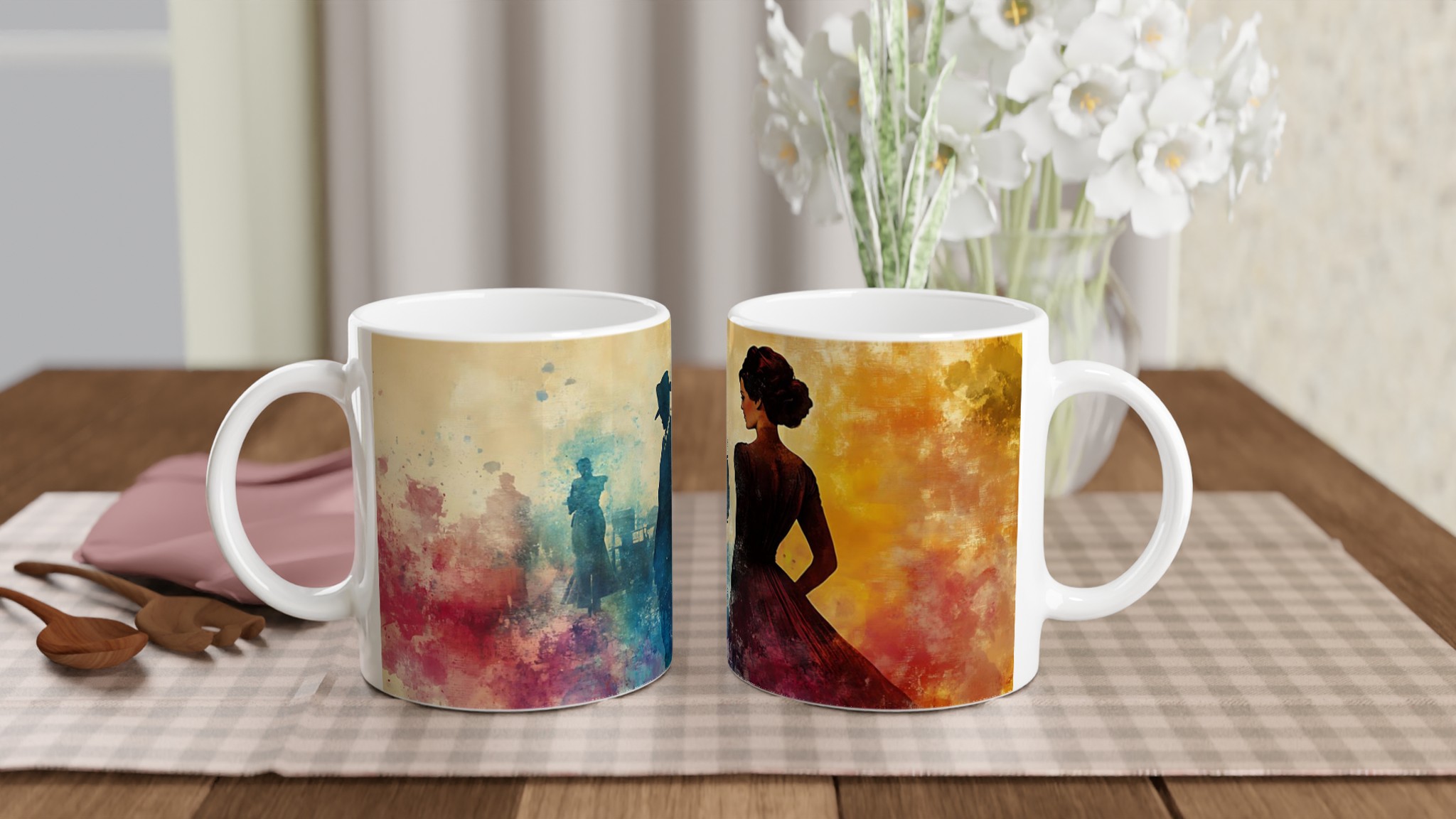 Denna unika mugg fångar en abstrakt konstnärlig stil, där silhuetter möter explosioner av färg i en dynamisk sammansättning. Inspirerad av klassisk elegans och modern akvarellkonst, skapar den en känsla av mystik och rörelse – perfekt för den som uppskattar konst och drama i vardagen. Den blanka vita ytan ger ett skarpt och levande tryck som verkligen sticker ut, oavsett om det är en personlig design, ett roligt citat eller en present till någon du tycker om.
