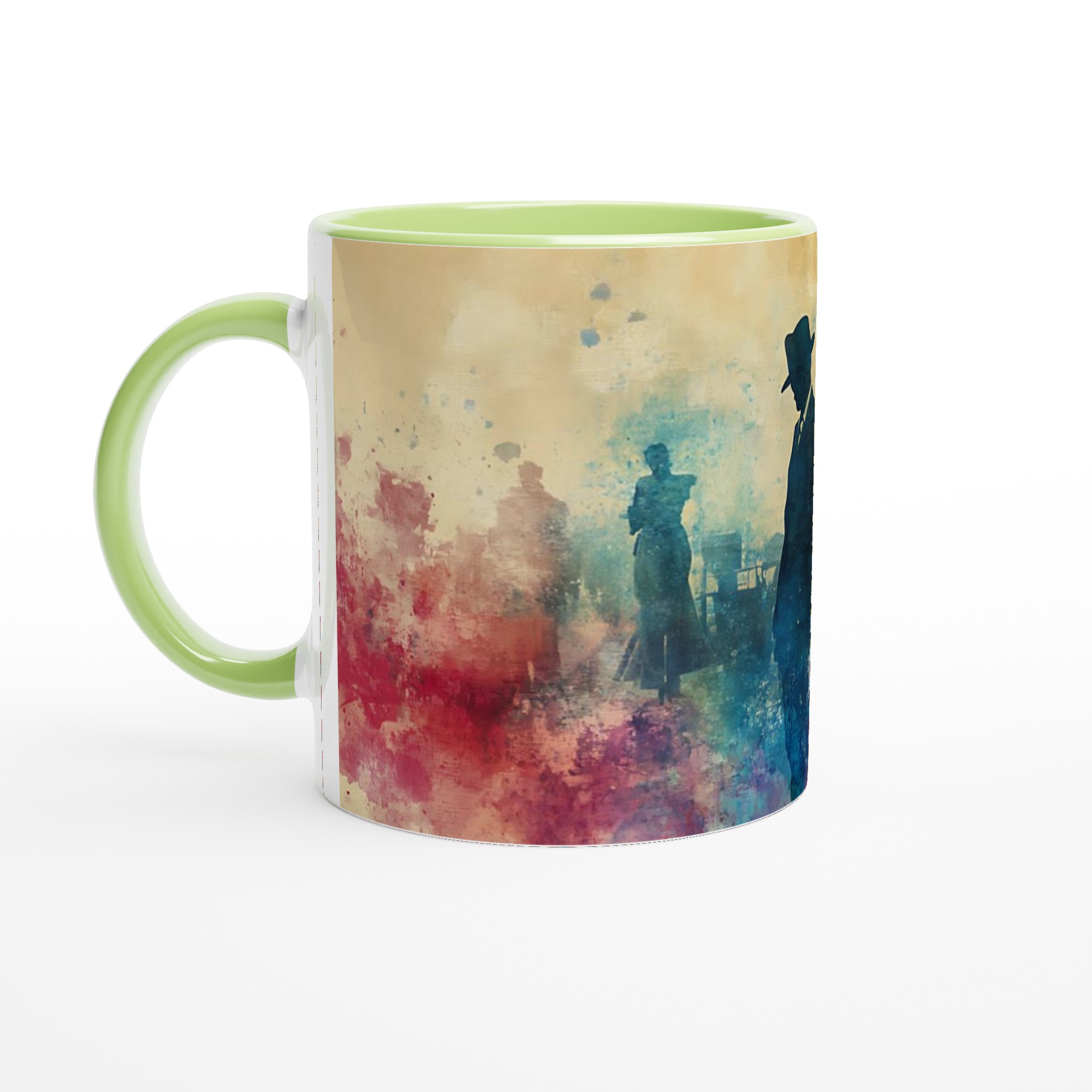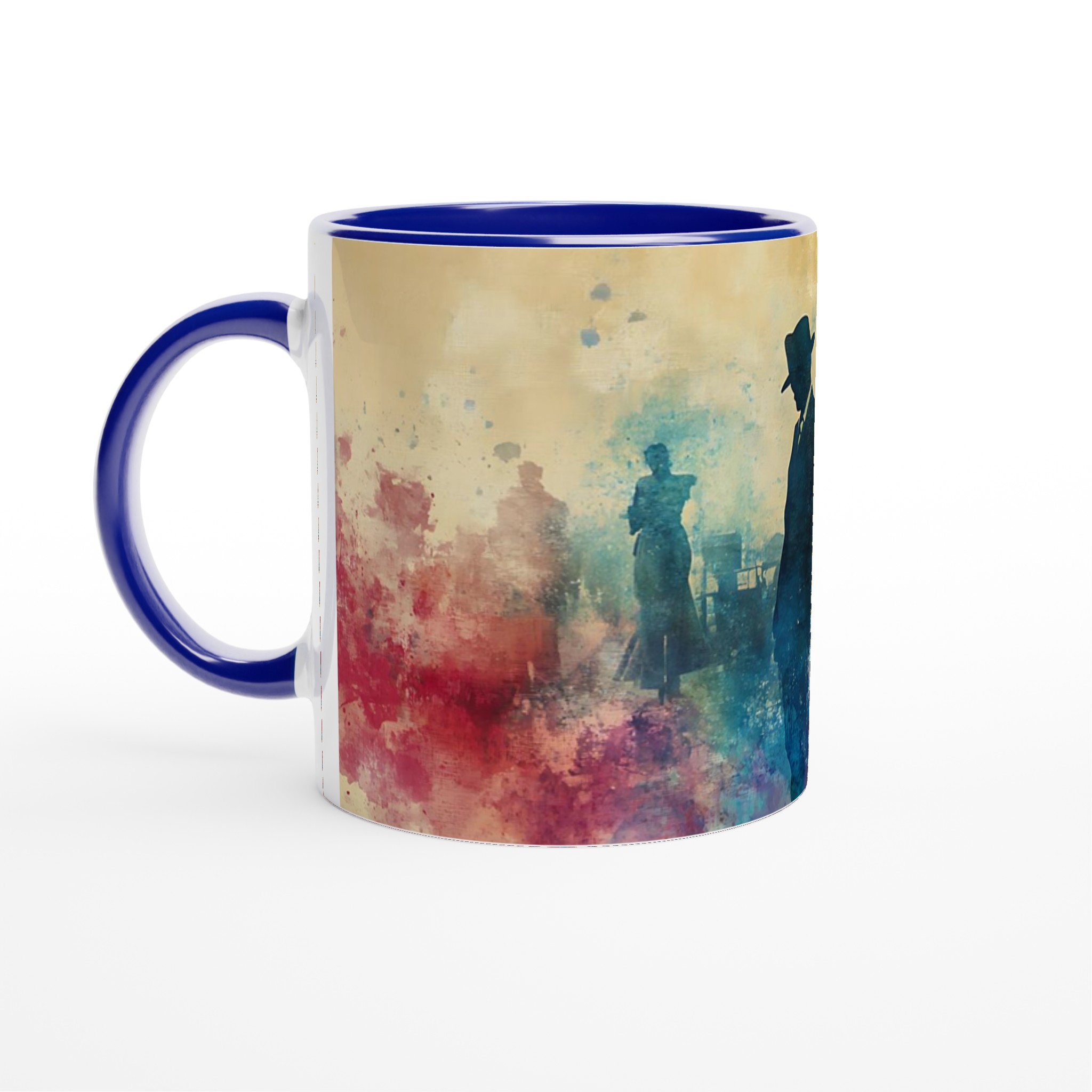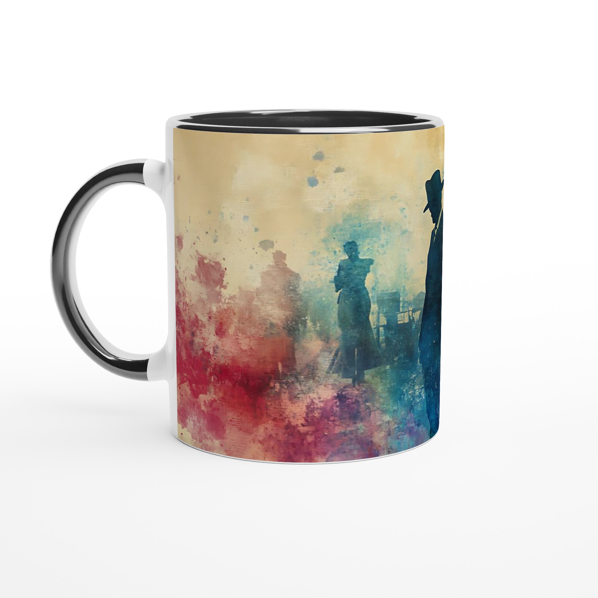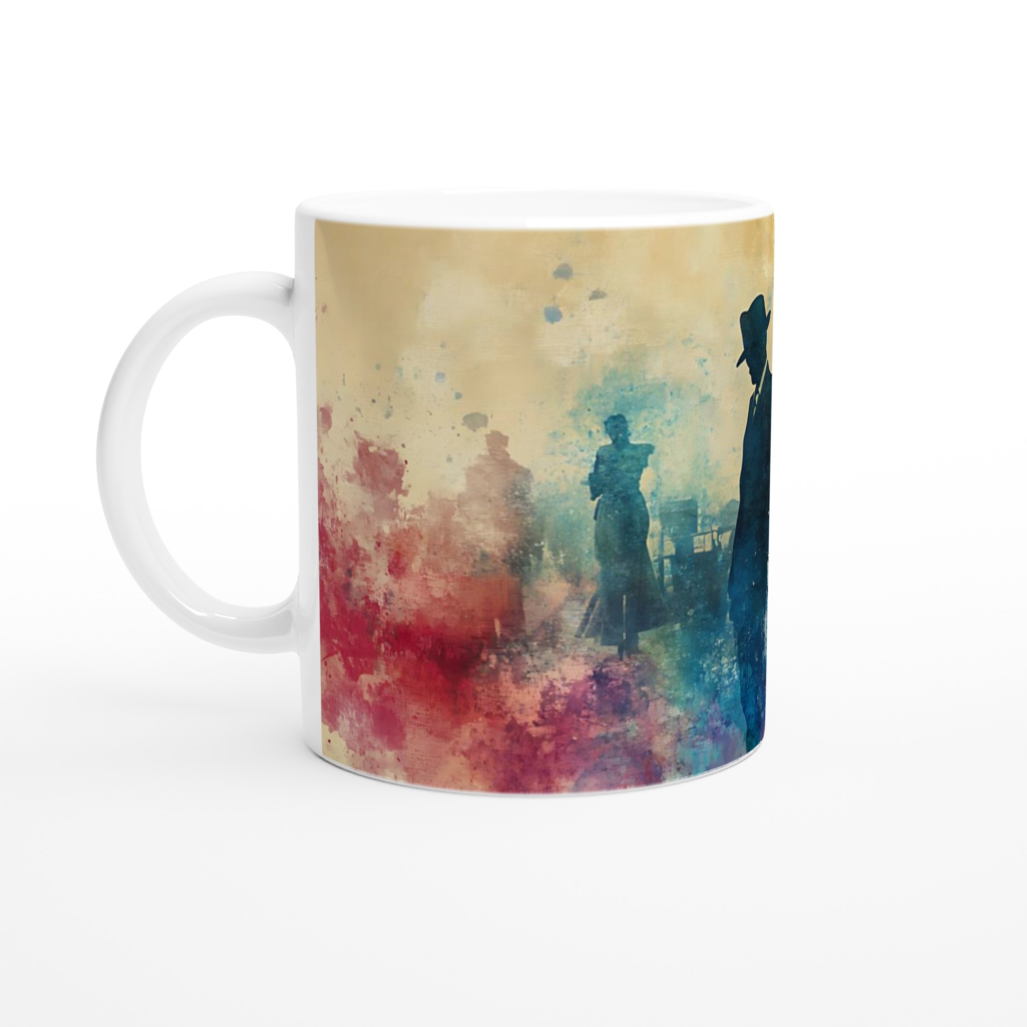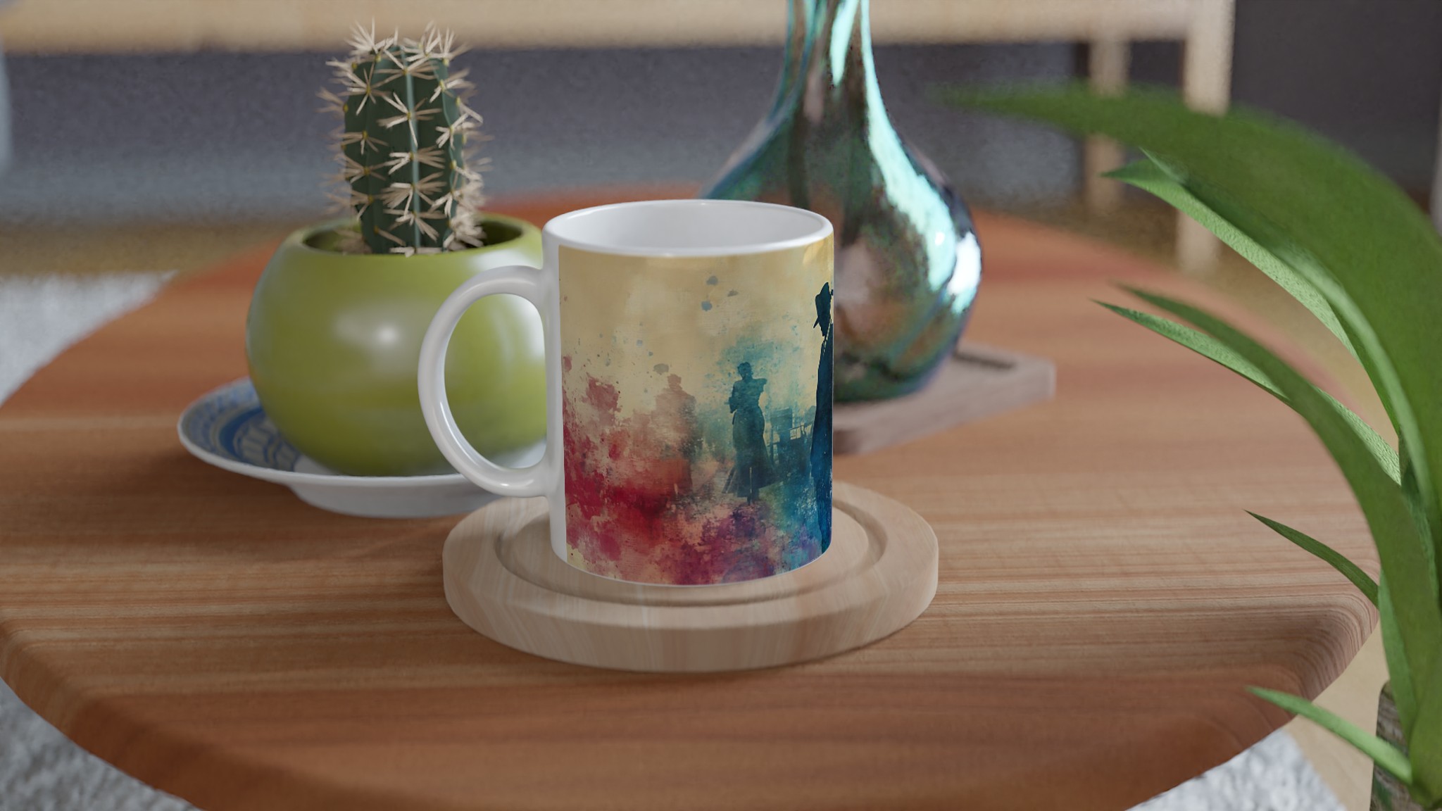 Denna unika mugg fångar en abstrakt konstnärlig stil, där silhuetter möter explosioner av färg i en dynamisk sammansättning. Inspirerad av klassisk elegans och modern akvarellkonst, skapar den en känsla av mystik och rörelse – perfekt för den som uppskattar konst och drama i vardagen. Den blanka vita ytan ger ett skarpt och levande tryck som verkligen sticker ut, oavsett om det är en personlig design, ett roligt citat eller en present till någon du tycker om.