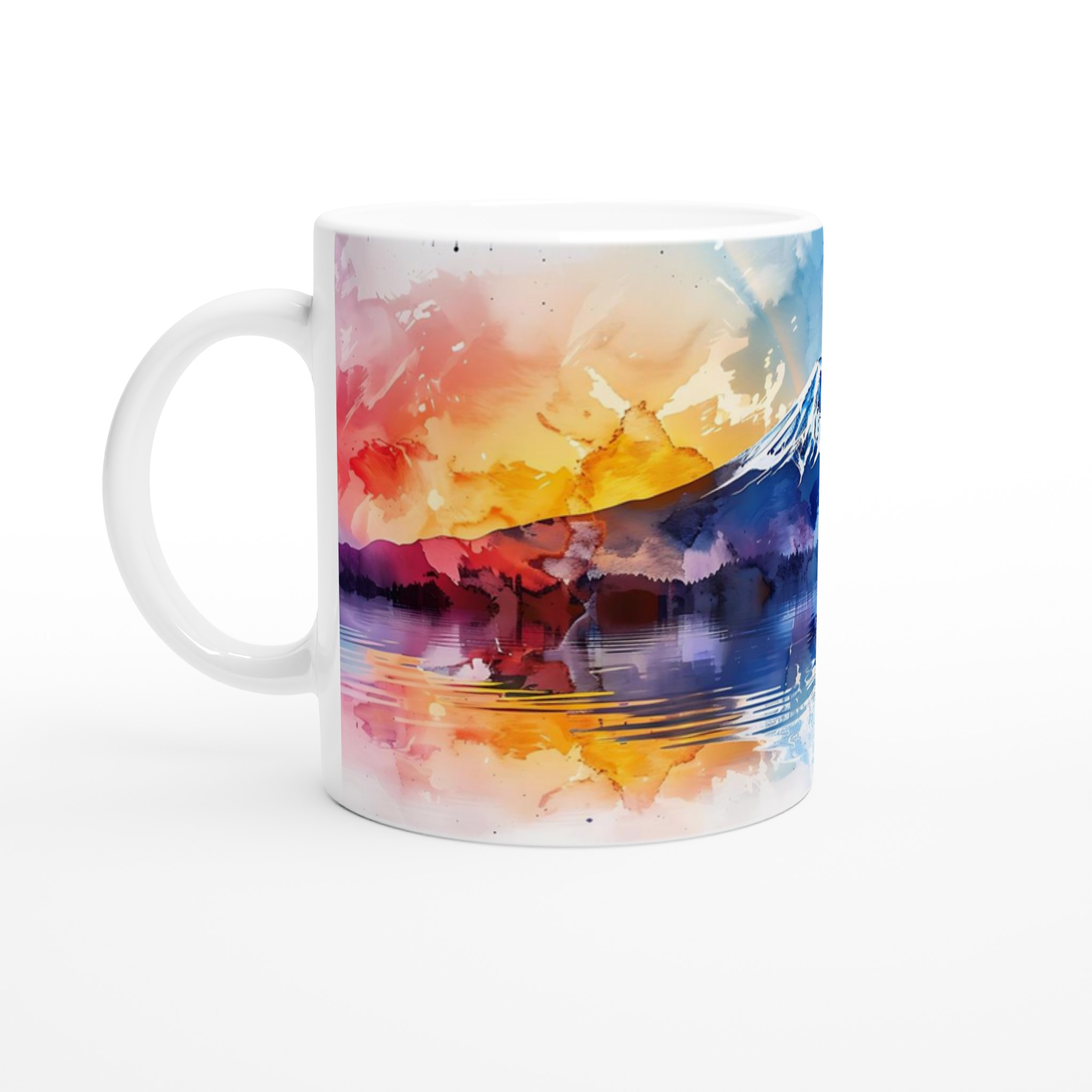 Låt den eteriska skönheten från berget Fuji i en abstrakt solnedgång inspirera dina dagliga pauser. Denna unika design, präglad av levande akvarelltoner i rosa, orange, blått och lila, fångar lugnet och dramatiken i naturen. Den blanka vita ytan ger ett skarpt och levande tryck som verkligen sticker ut, oavsett om det är en personlig design, ett roligt citat eller en present till någon du tycker om.