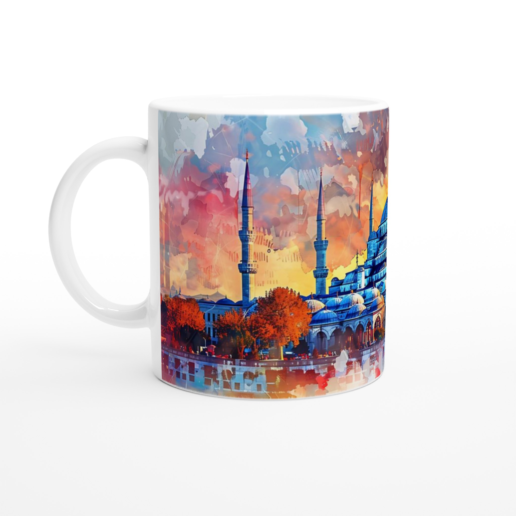 Inspirerad av Istanbuls majestätiska arkitektur mot en glödande solnedgång i akvarellstil, fångar denna mugg en drömsk och konstnärlig känsla. Den blanka vita ytan ger ett skarpt och levande tryck som verkligen sticker ut, oavsett om det är en personlig design, ett roligt citat eller en present till någon du tycker om.