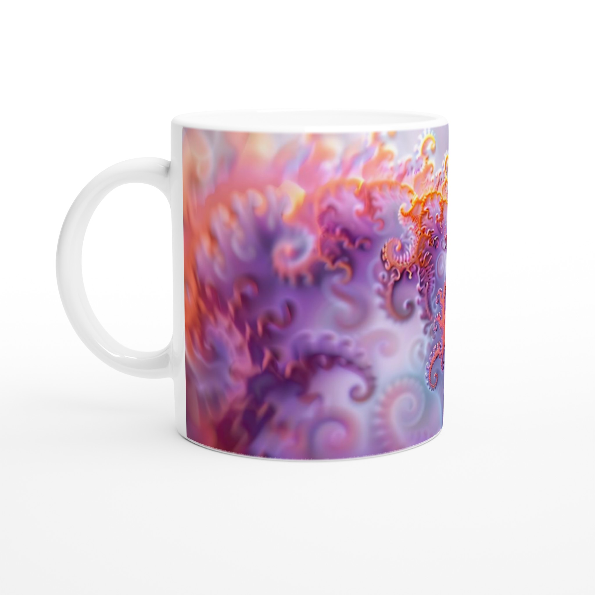Låt dig inspireras av de drömska och organiska spiralmönstren, med deras mjuka lila, rosa och apelsinfärgade nyanser som påminner om naturens egna konstverk. Vår 11oz keramiska mugg är den perfekta duken för att spegla din unika stil. Välj bland ett spektrum av sju färgstarka keramiska toner – från klassiskt vit och djupt svart till lekfullt gul, rosa, grön, röd och blå – för att perfekt matcha din personlighet eller inredning. Varje färg är noggrant utvald för att komplettera den blanka finishen och säkerställa att ditt valda motiv framträder med exceptionell klarhet och livfullhet.