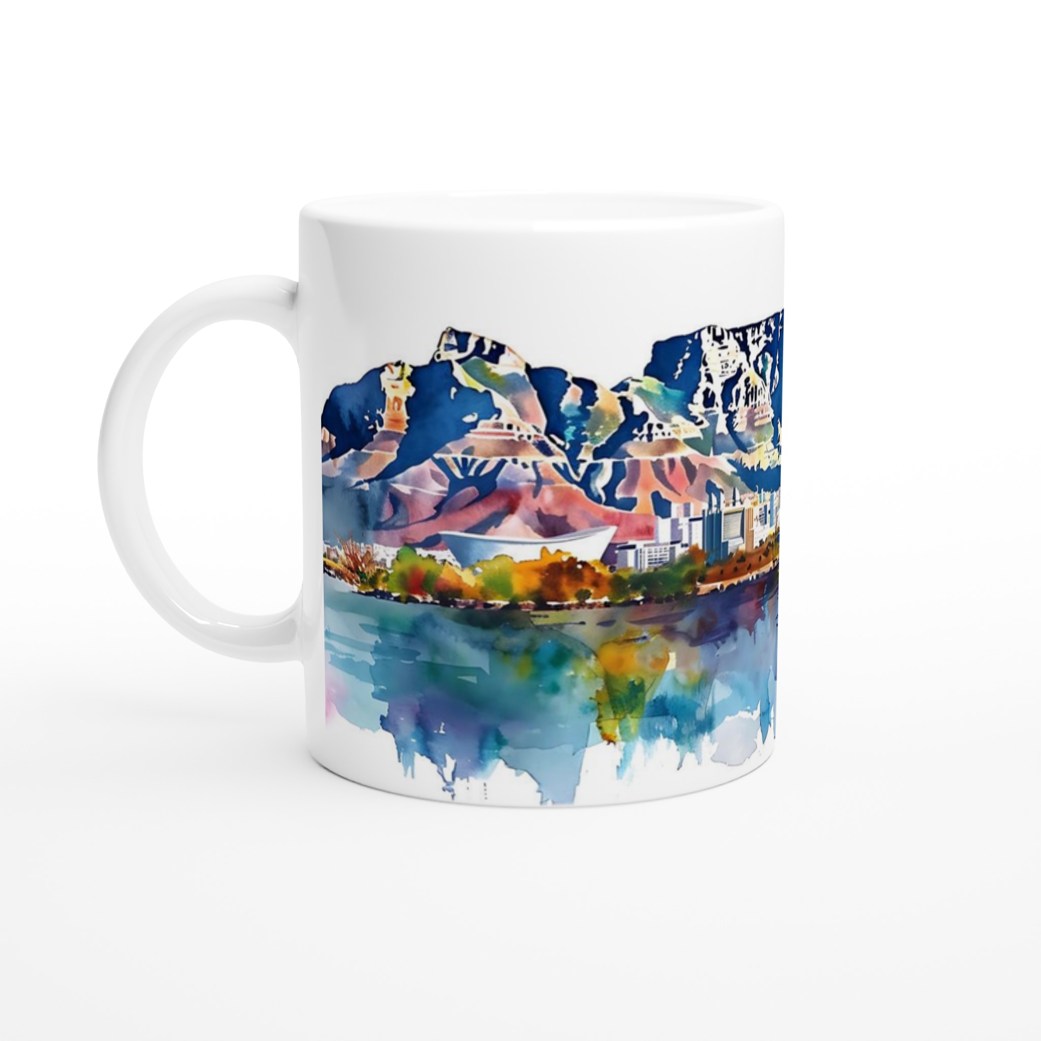 Lyft varje kaffestund med vår premium keramikmugg – stilren, hållbar och skapad för att låta ditt motiv glänsa. Denna fantastiska mugg har en abstrakt akvarell av en livlig stadsbild vid en kustlinje, med majestätiska berg i bakgrunden. Färgpaletten är en förtrollande blandning av djupa blåa, varma orangea och jordnära toner, vilket ger en konstnärlig och lugnande känsla till varje sip.