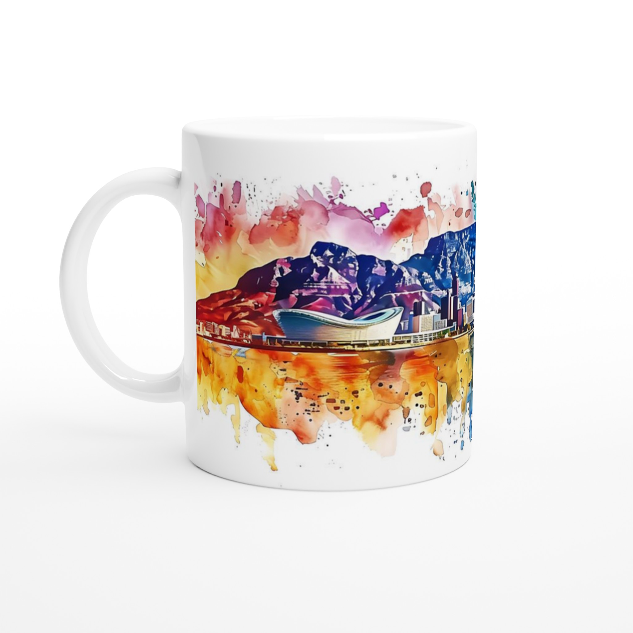 Denna exklusiva mugg fångar essensen av ett levande stadslandskap, badat i en dynamisk explosion av vattenfärger. Med sina varma orangea och röda toner som möter lugnande blå och akvatiska nyanser, skapar den en konstnärlig och energifylld känsla. Den blanka vita ytan ger ett skarpt och levande tryck som verkligen sticker ut, oavsett om det är en personlig design, ett roligt citat eller en present till någon du tycker om.