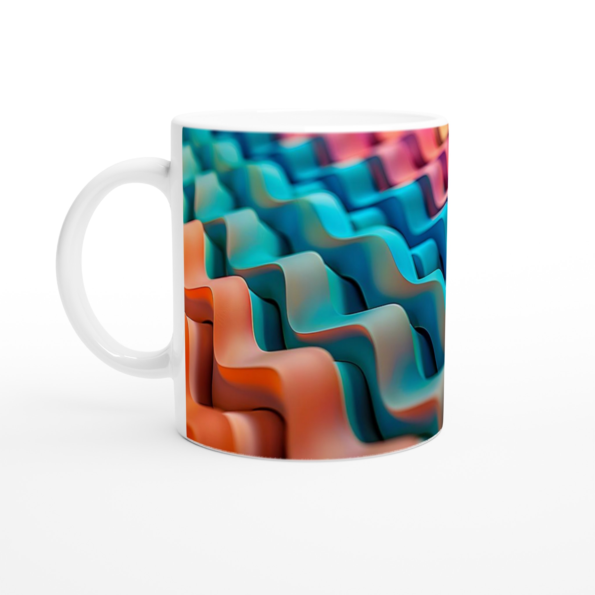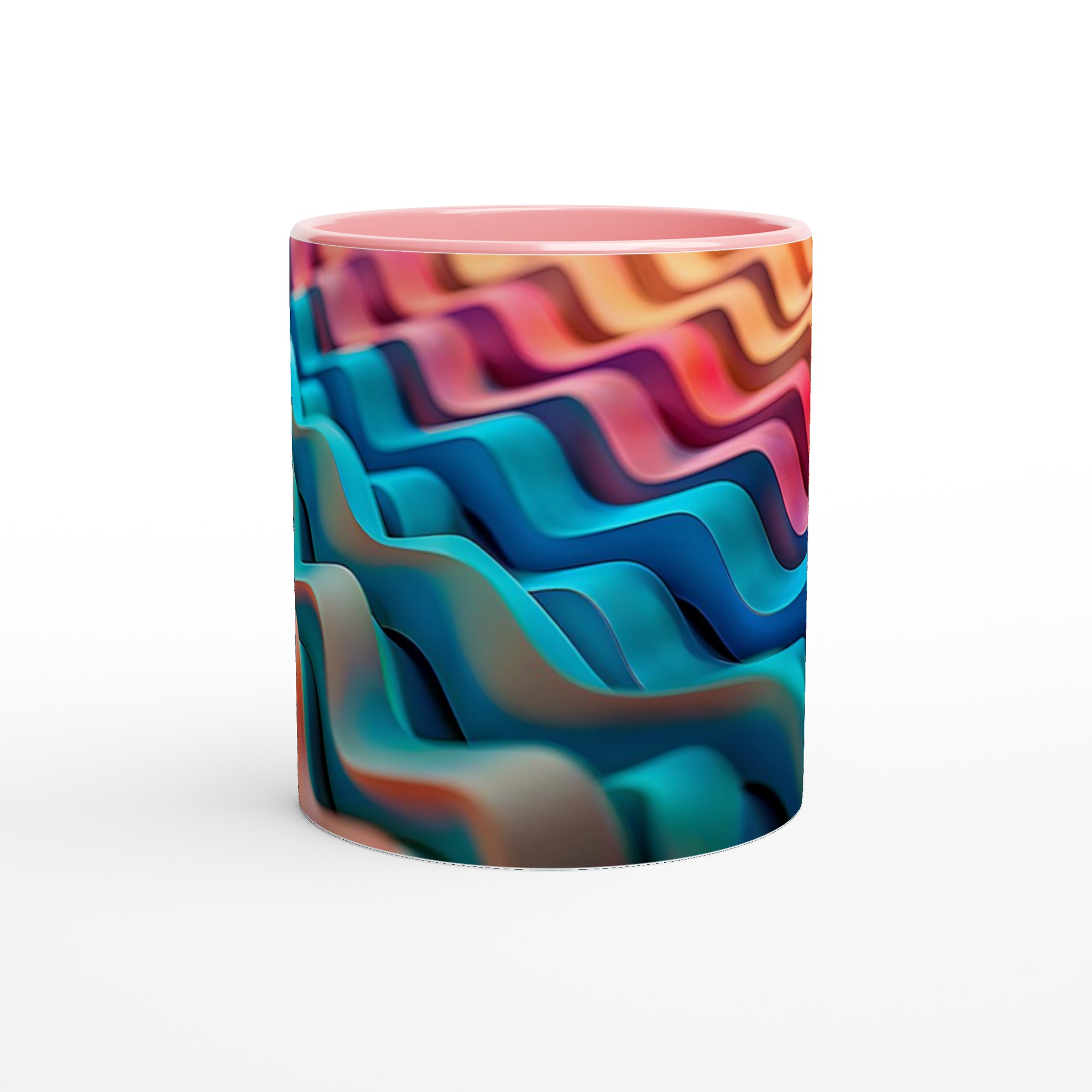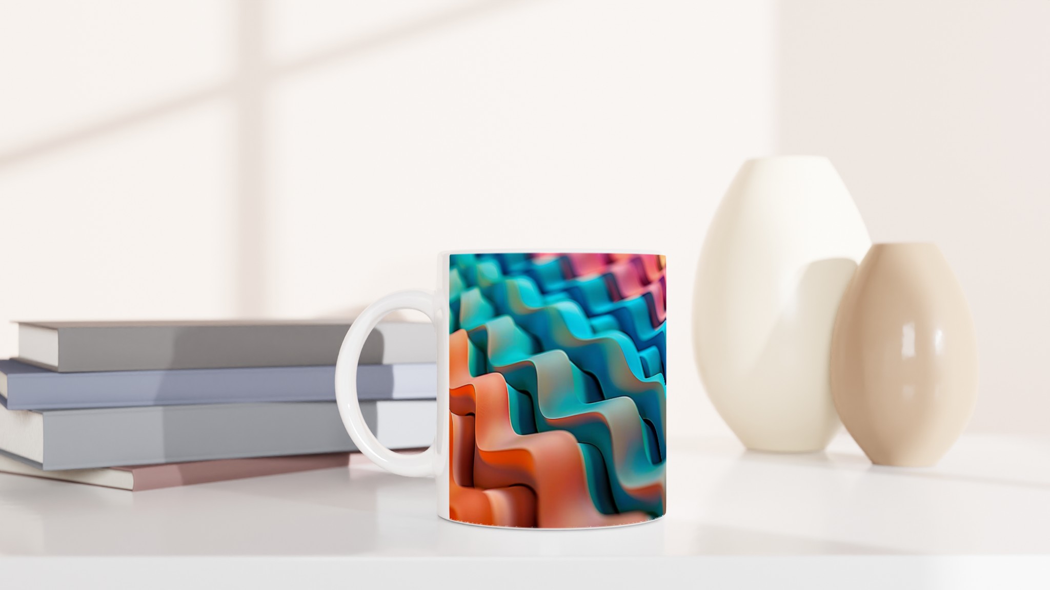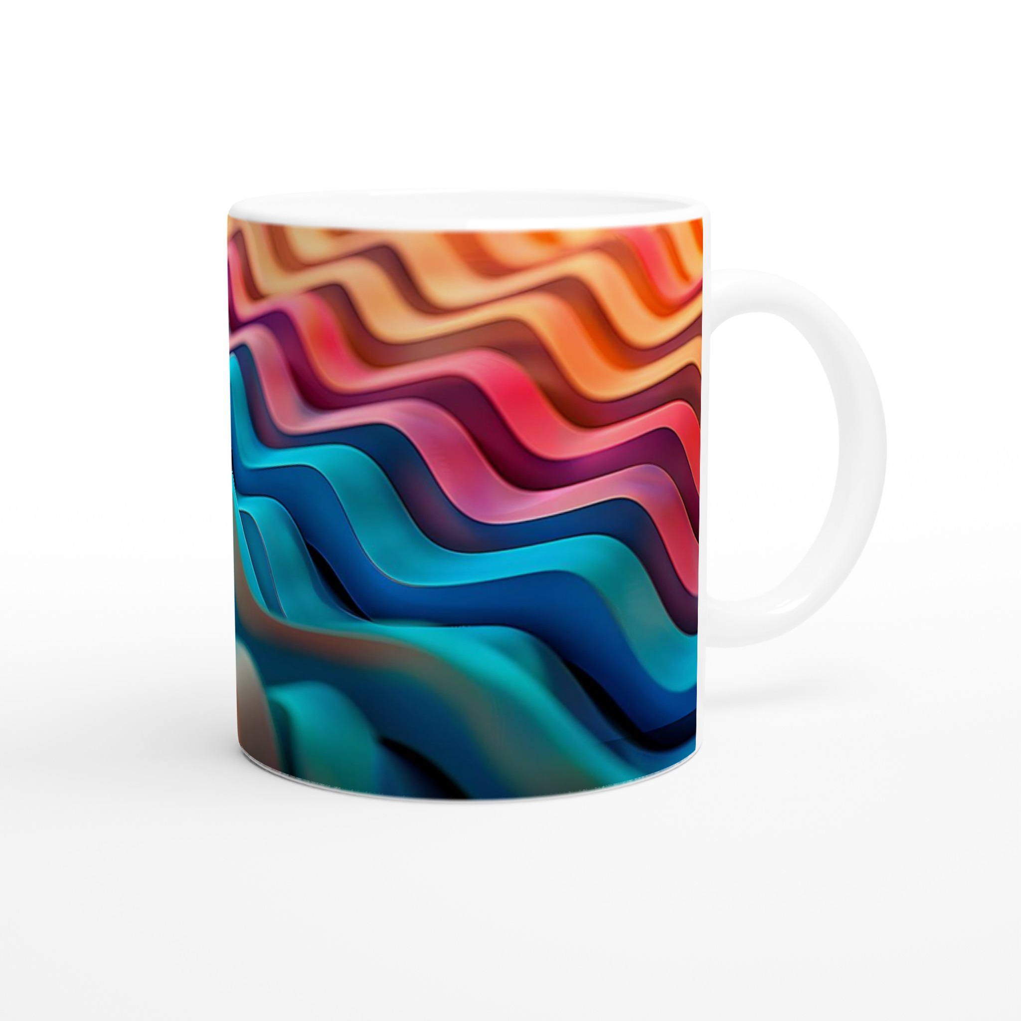 Denna stilrena och vackra keramikmugg med sitt dynamiska abstrakta vågmotiv är perfekt för alla dagens stunder – morgonkaffet, en värmande kopp te eller en härlig varm choklad. Med en palett av lugnande blått, lekfullt rosa och varmt orange, ger den blanka vita ytan att trycken framträder klart och färgstarkt, vilket gör muggen till en riktig favorit i vardagen. Tack vare den höga kvaliteten behåller trycket sin lyster även efter många omgångar i både mikrovågsugn och diskmaskin.