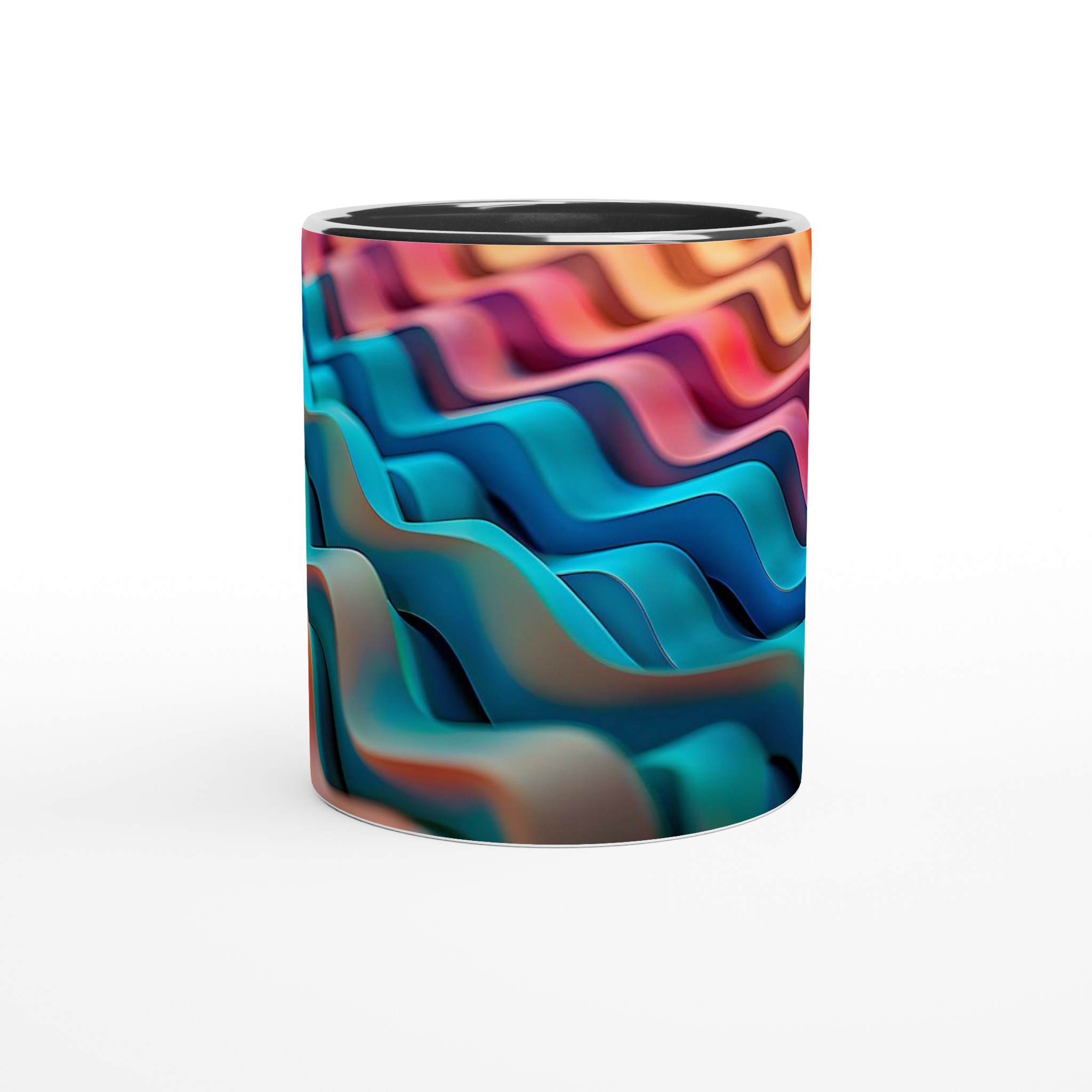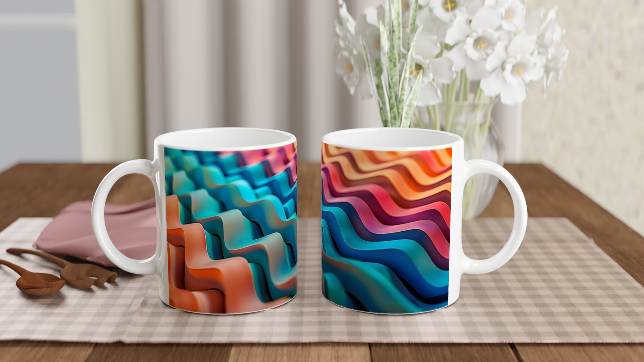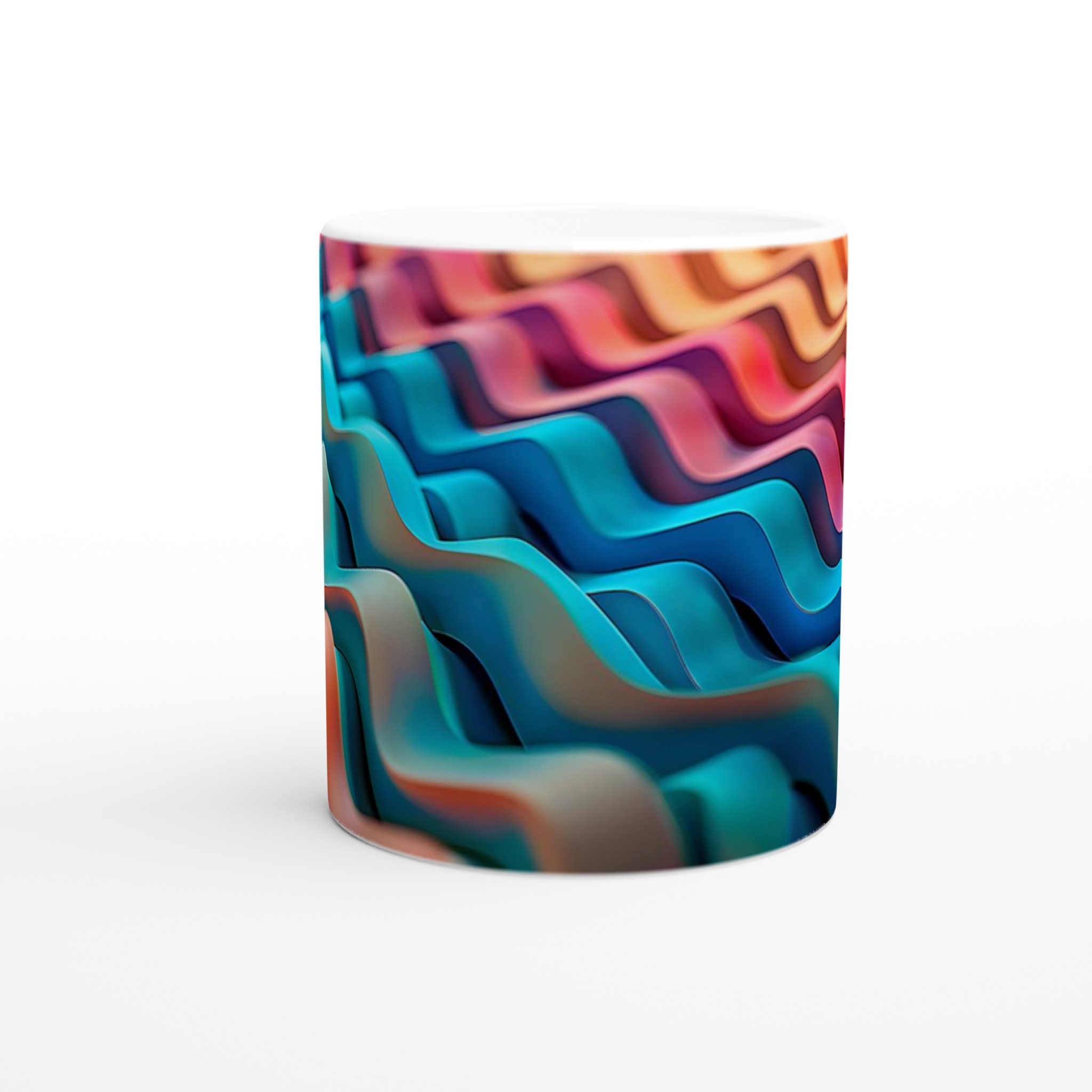 Denna stilrena och vackra keramikmugg med sitt dynamiska abstrakta vågmotiv är perfekt för alla dagens stunder – morgonkaffet, en värmande kopp te eller en härlig varm choklad. Med en palett av lugnande blått, lekfullt rosa och varmt orange, ger den blanka vita ytan att trycken framträder klart och färgstarkt, vilket gör muggen till en riktig favorit i vardagen. Tack vare den höga kvaliteten behåller trycket sin lyster även efter många omgångar i både mikrovågsugn och diskmaskin.