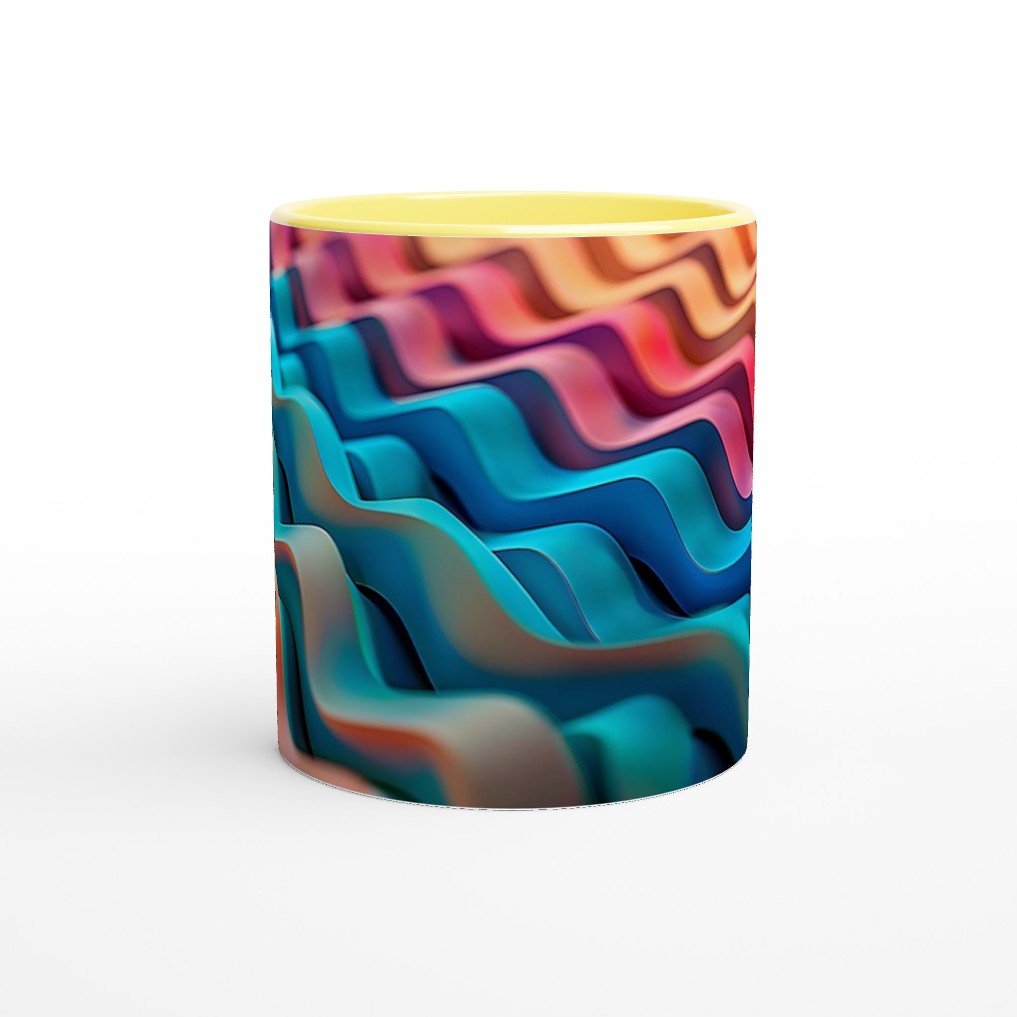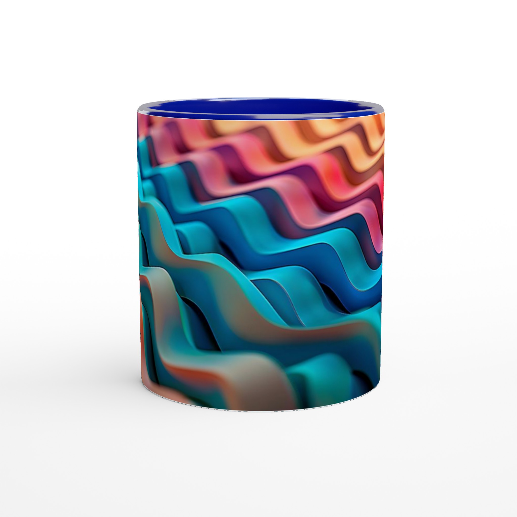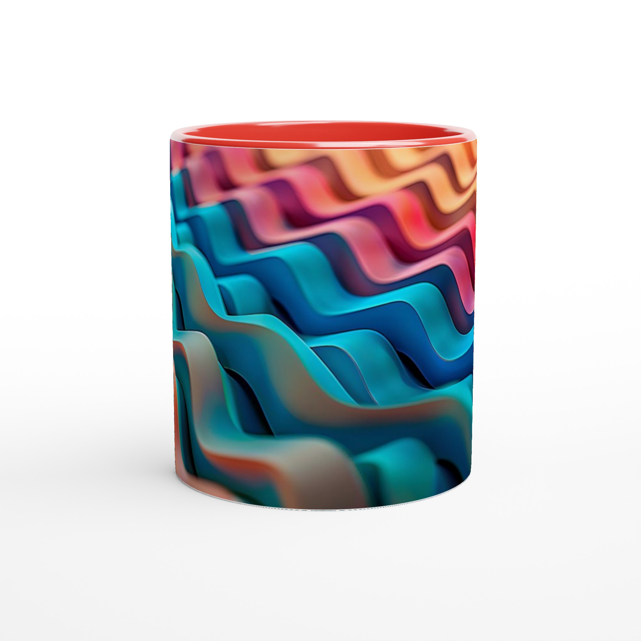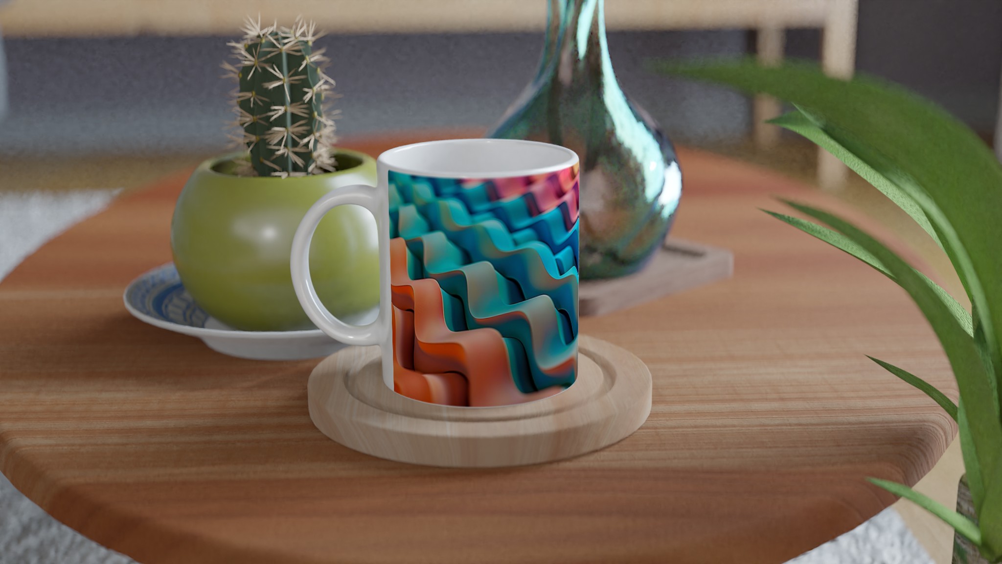 Denna stilrena och vackra keramikmugg med sitt dynamiska abstrakta vågmotiv är perfekt för alla dagens stunder – morgonkaffet, en värmande kopp te eller en härlig varm choklad. Med en palett av lugnande blått, lekfullt rosa och varmt orange, ger den blanka vita ytan att trycken framträder klart och färgstarkt, vilket gör muggen till en riktig favorit i vardagen. Tack vare den höga kvaliteten behåller trycket sin lyster även efter många omgångar i både mikrovågsugn och diskmaskin.