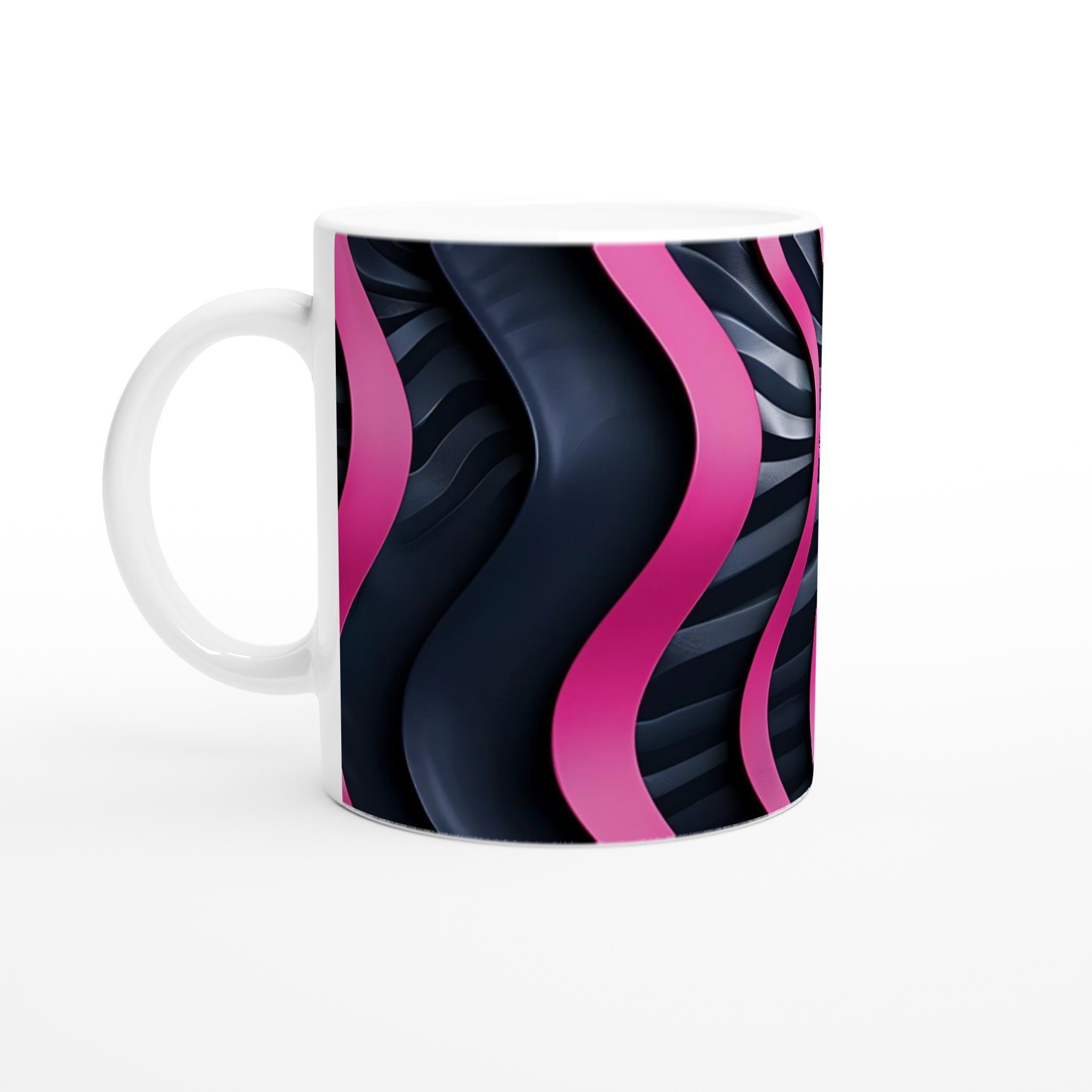 Denna mugg har en dynamisk design med vågiga, abstrakta mönster i levande rosa och sofistikerade grå nyanser, vilket ger en modern och konstnärlig känsla till din dryckesupplevelse. Den blanka vita ytan ger ett skarpt och levande tryck som verkligen sticker ut, oavsett om det är en personlig design, ett roligt citat eller en present till någon du tycker om.