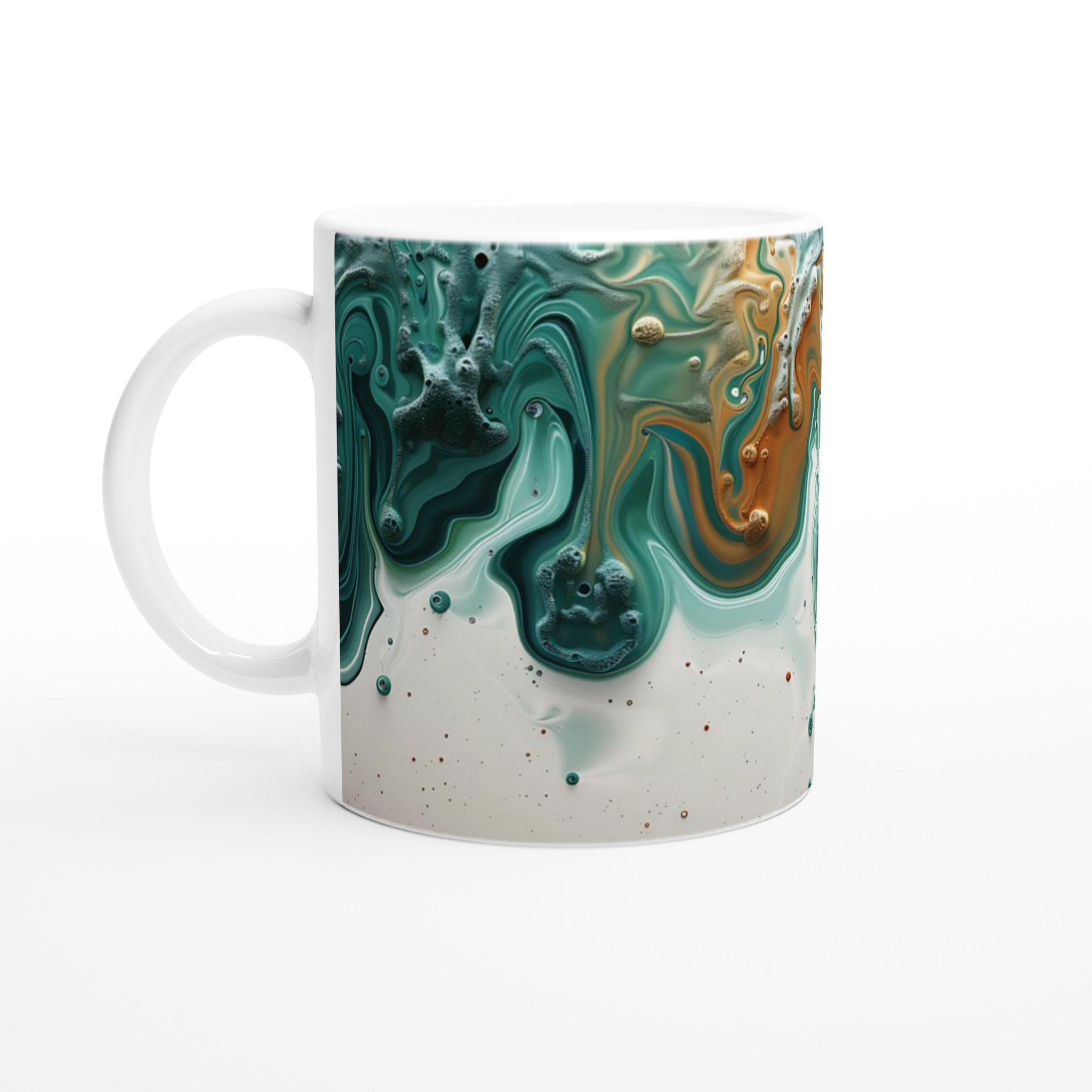 Inspirerad av havets djup och solens guldiga strålar, förvandlar denna mugg din dryck till en konstupplevelse. Den abstrakta virveldesignen i havsgrönt och guld, med dess organiska texturer, ger en känsla av lugn och lyx till varje klunk. Den blanka vita ytan ger ett skarpt och levande tryck som verkligen sticker ut, oavsett om det är en personlig design, ett roligt citat eller en present till någon du tycker om.