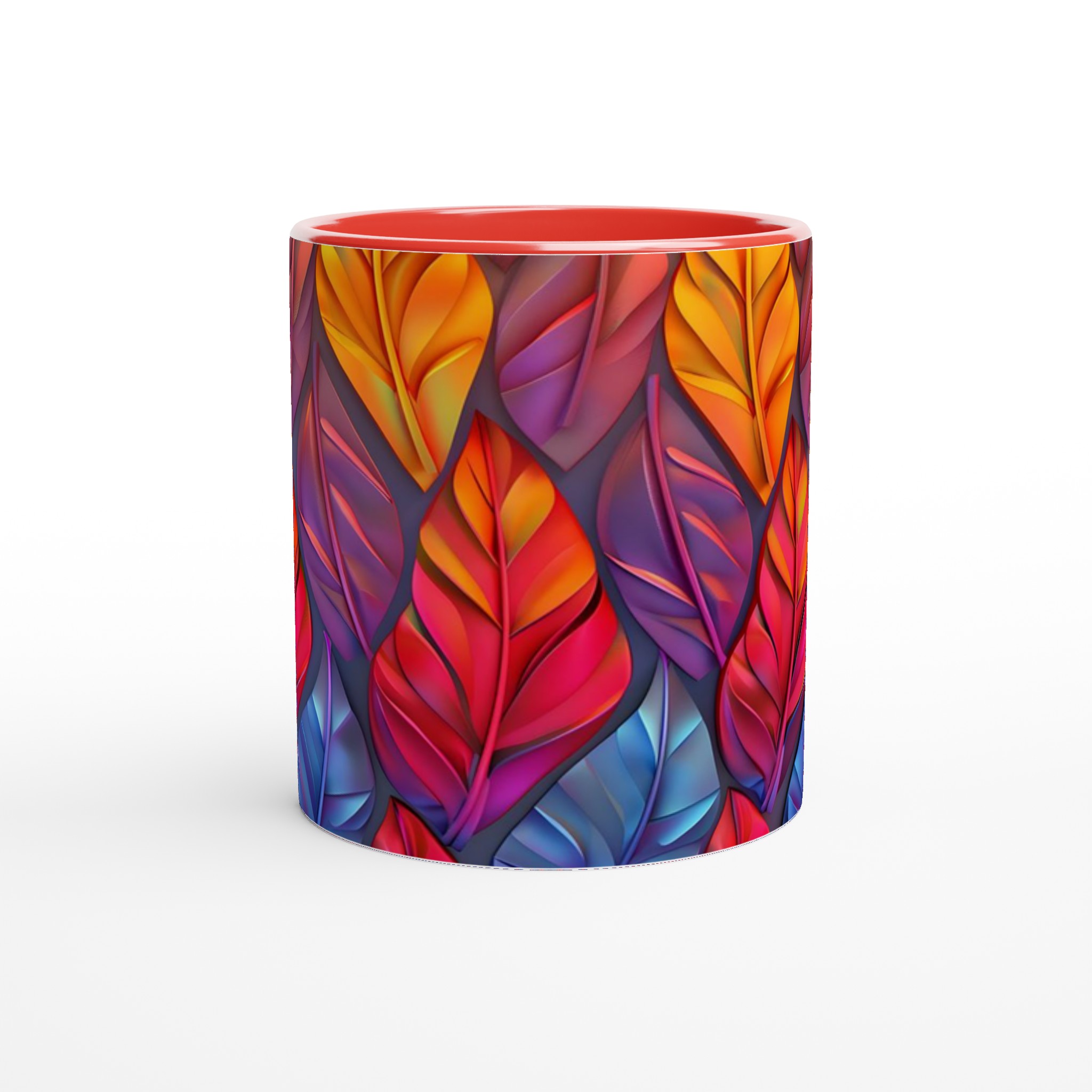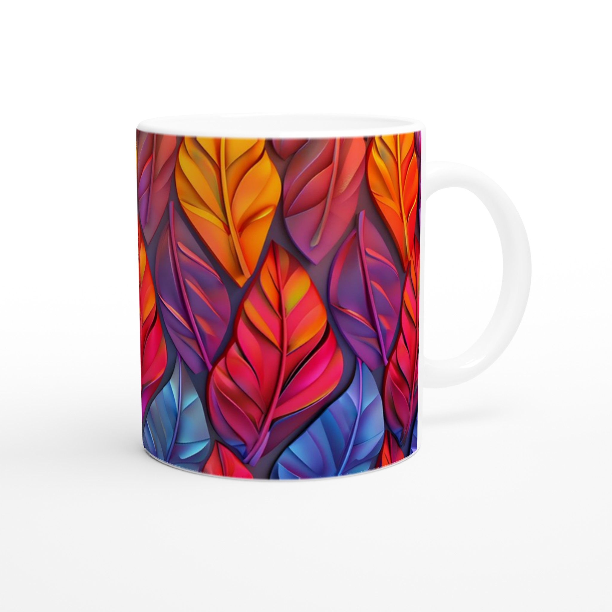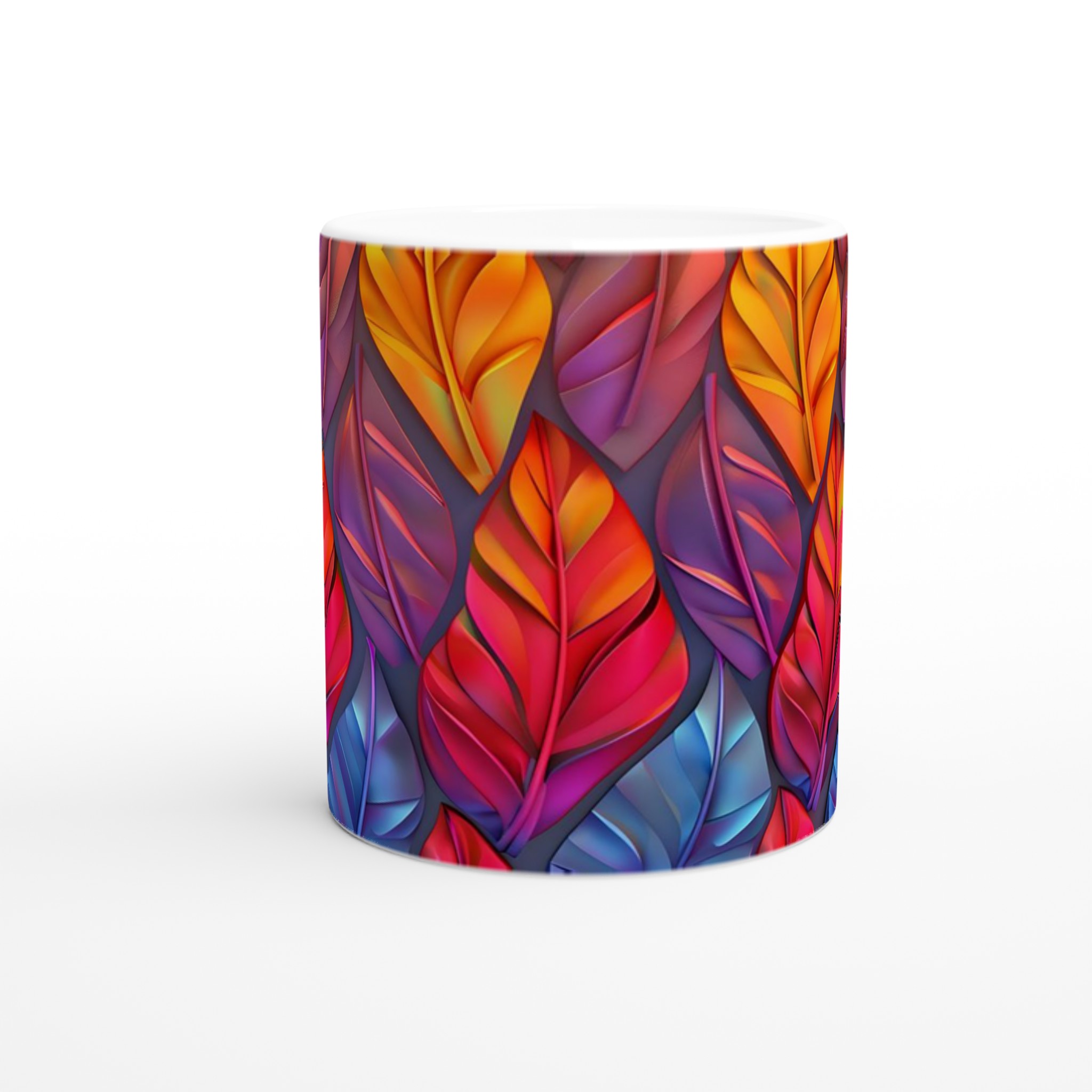 Vakna till liv med varje klunk från denna fantastiska keramikmugg, prydd med ett abstrakt mönster av höstlöv i en levande färgpalett av rött, orange, lila och blått. Dess iögonfallande design gör den till den perfekta följeslagaren för alla dagens stunder – oavsett om det är morgonkaffet, en värmande kopp te eller en härlig varm choklad. Varje detalj i det färgstarka trycket framträder klart och gör muggen till en riktig favorit i vardagen som garanterat sprider glädje.