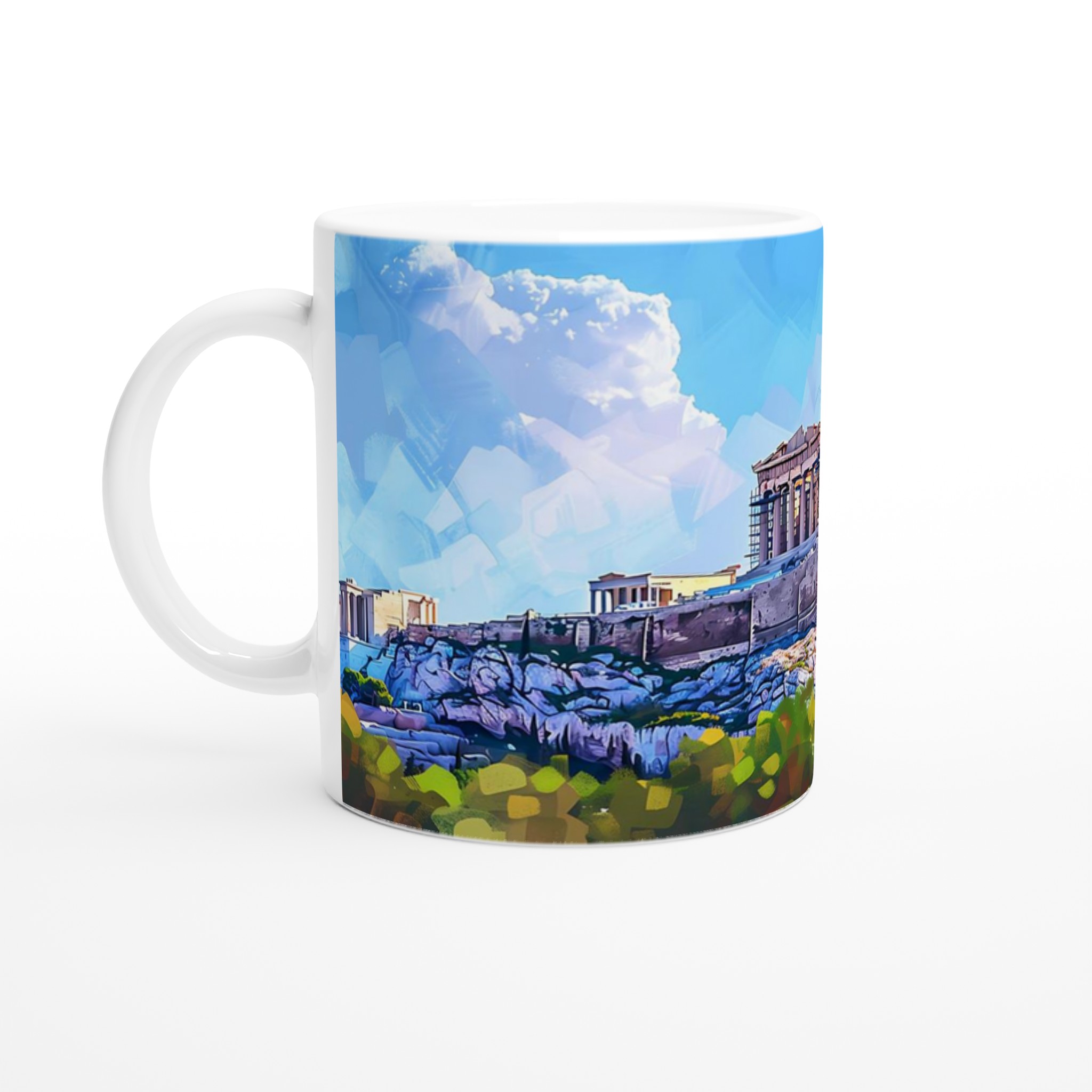 Inspirerad av den majestätiska Akropolis och dess tidlösa skönhet, fångar denna mugg den konstnärliga och drömlika känslan från bilden. Den blanka vita ytan ger ett skarpt och levande tryck som verkligen sticker ut, oavsett om det är en personlig design, ett roligt citat eller en present till någon du tycker om.