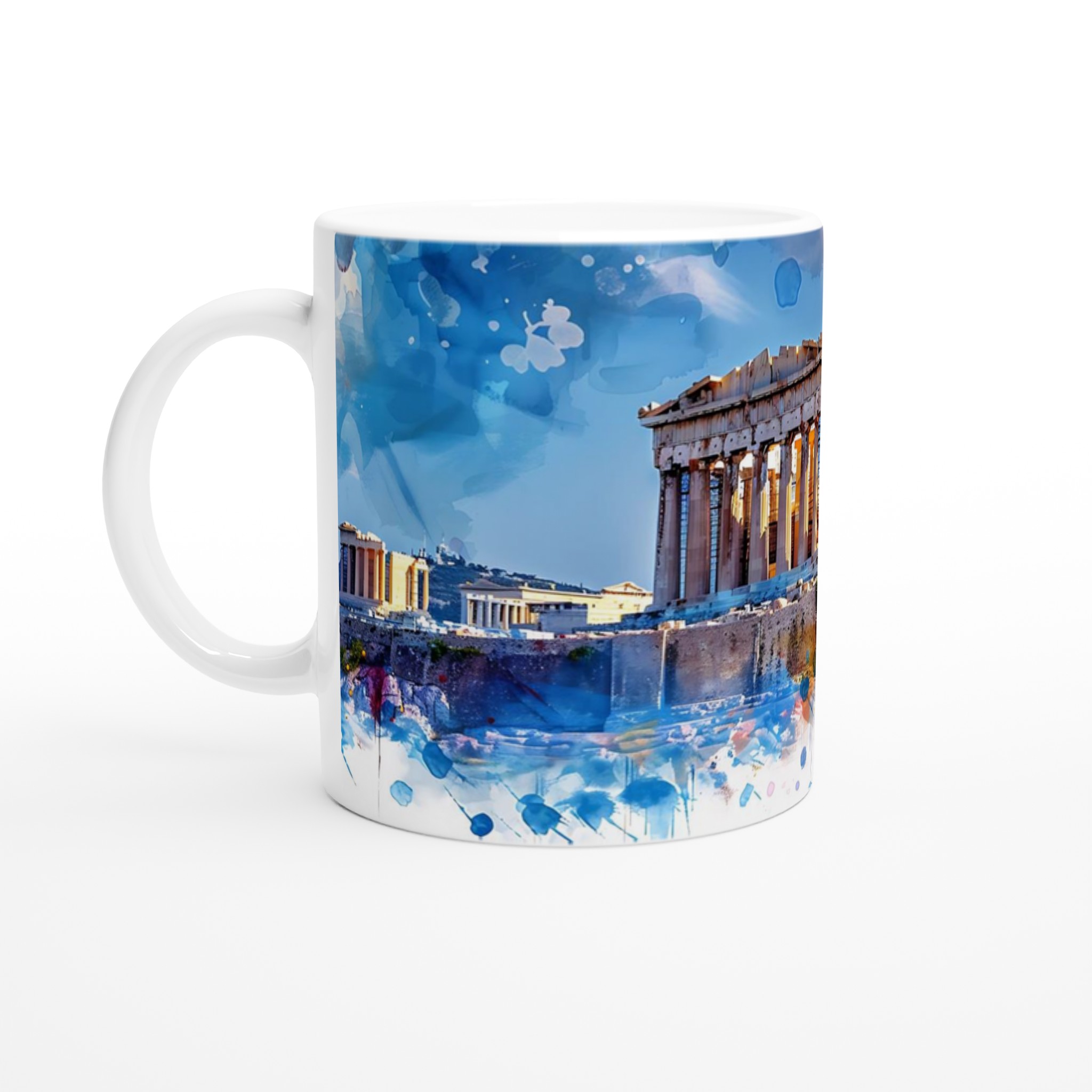 Inspirerad av den majestätiska Akropolis i Grekland, fångar denna konstnärliga mugg essensen av antik skönhet möter modern vattenfärgskonst. Det levande trycket, med sina drömska blåa, varma orangea och jordnära röda toner, förvandlar varje sipp till en resa genom historien. Den blanka vita ytan ger ett skarpt och levande tryck som verkligen sticker ut, oavsett om det är en personlig design, ett roligt citat eller en present till någon du tycker om.