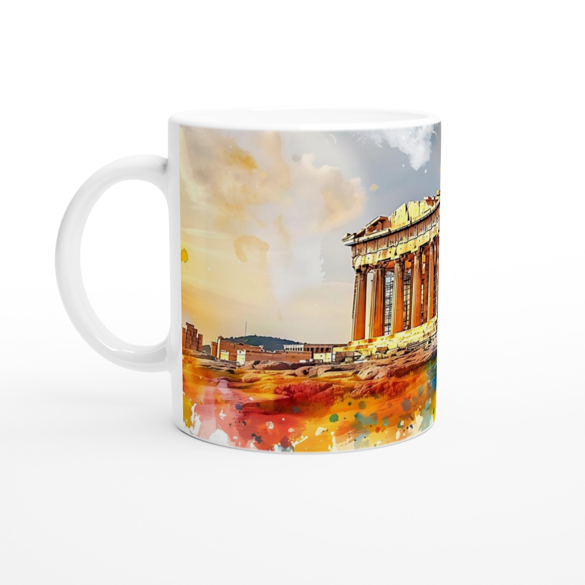 Lyft varje kaffestund med vår premium keramikmugg – stilren, hållbar och skapad för att låta ditt motiv glänsa. Inspirerad av Akropolis majestätiska skönhet badande i en akvarellsolnedgång, fångar denna mugg essensen av konst och historia. Den blanka vita ytan ger ett skarpt och levande tryck som verkligen sticker ut, oavsett om det är en personlig design, ett roligt citat eller en present till någon du tycker om.