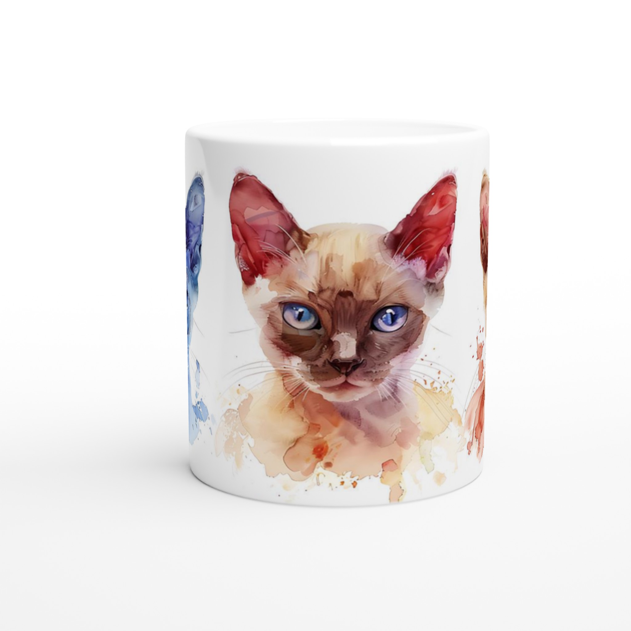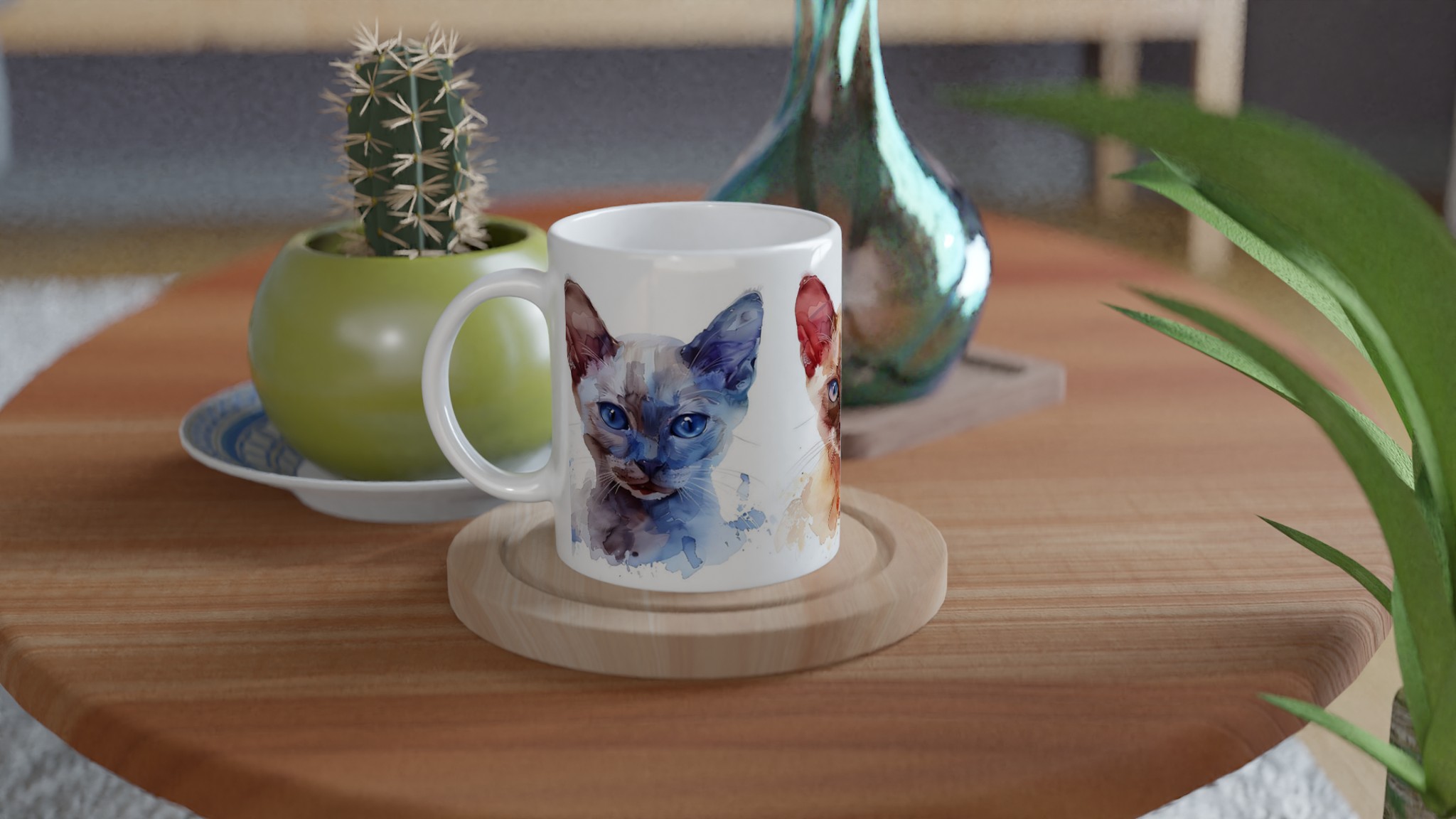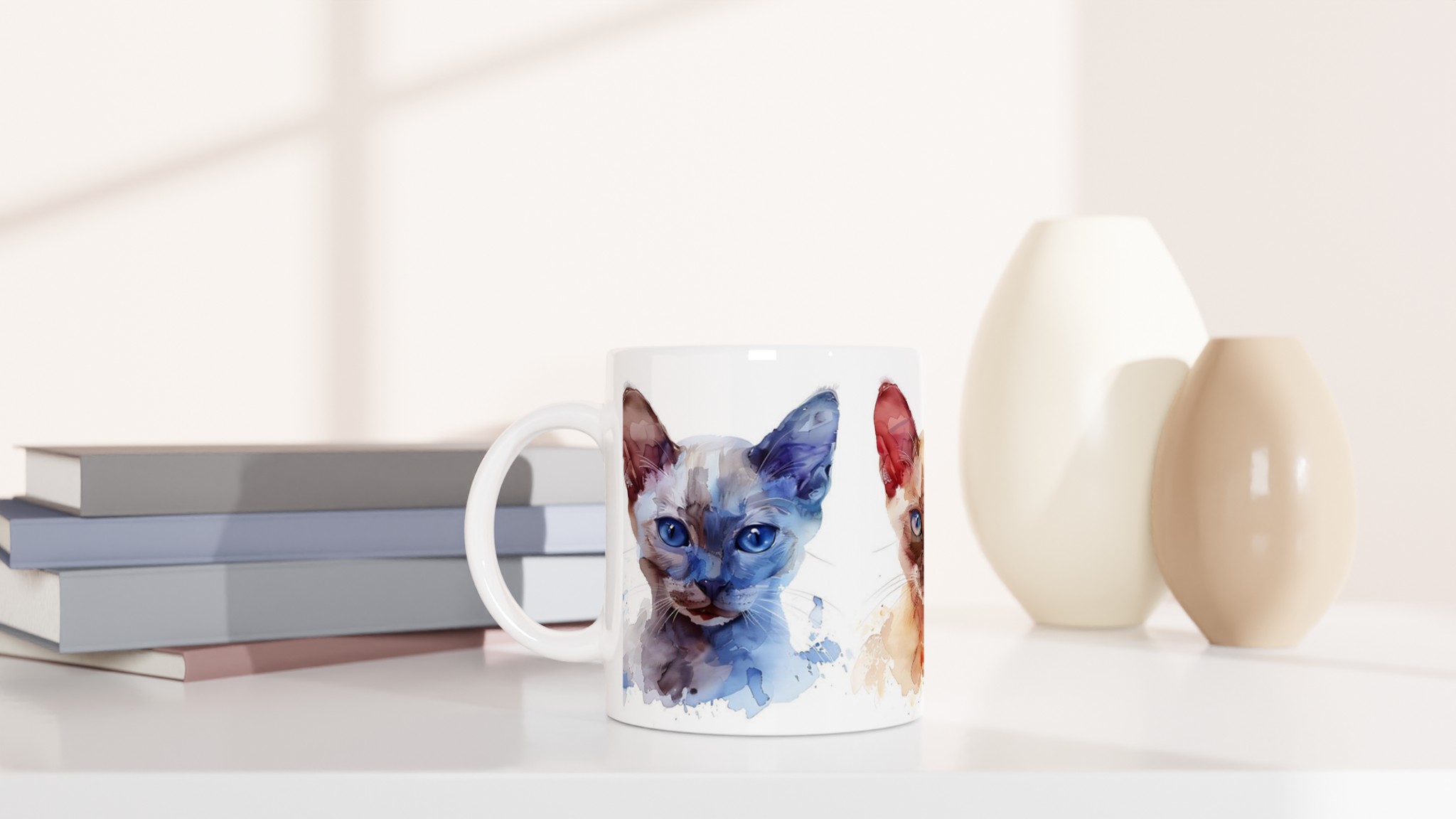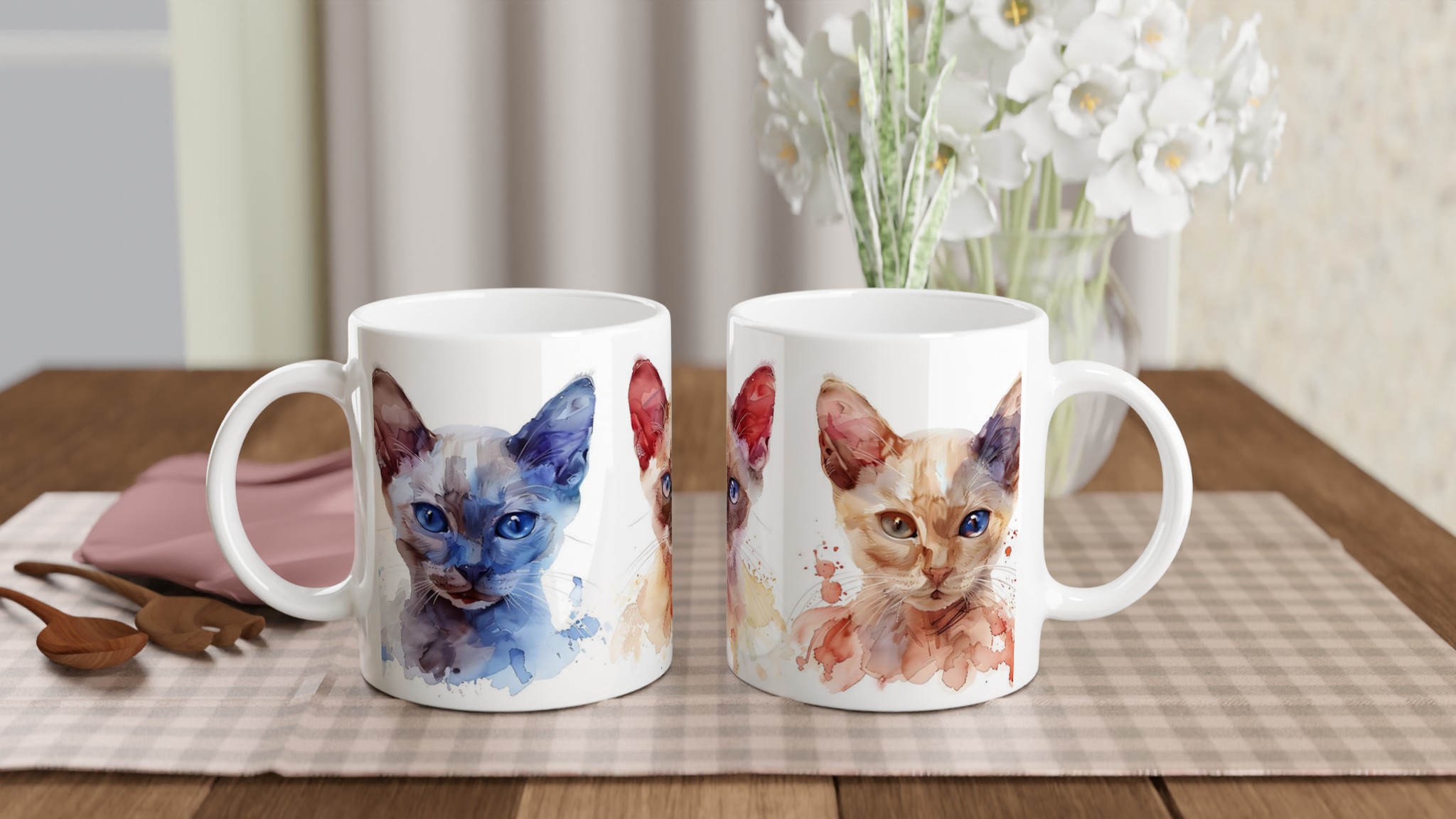 Låt dig förtrollas av dessa lekfulla akvarellkatter varje gång du tar en klunk! Den här stilrena keramiska muggen blir snabbt en vardagsfavorit. Perfekt för morgonkaffet, kvällens varma choklad eller när du bara vill njuta av en kopp te. Med sitt unika kattmotiv, målat i livliga akvarelltoner som påminner om vattnets klara färger och konstnärliga penseldrag, ger den en personlig touch till varje dryckesstund. Den blanka vita ytan gör att trycken framhävs med klara och levande färger, som håller sig fina även efter många turer i mikron och diskmaskinen.